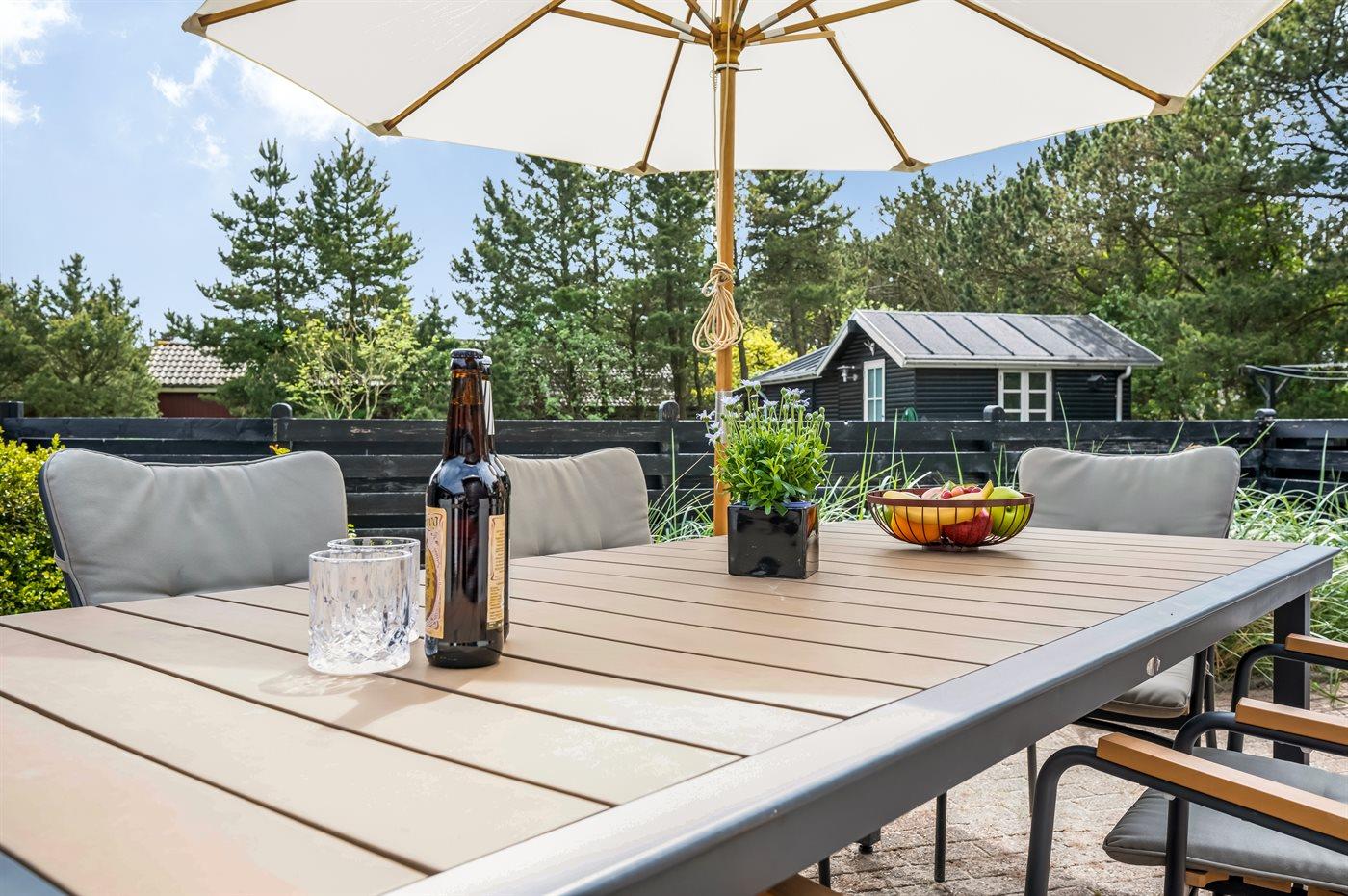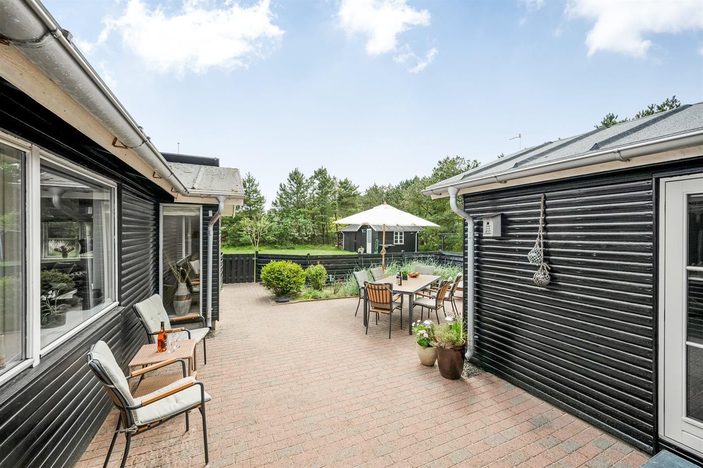 Im Innenhof auf der südwestlichen Seite des Hauses herrscht Ruhe und Platz für draußen und Privatsphäre. Und es ist auch der Innenhof und die abgeschirmte Außendusche, die dich empfangen, wenn du von einem schönen Tag am Strand zurückkehrst, der etwa 5 Gehminuten vom Haus entfernt ist.