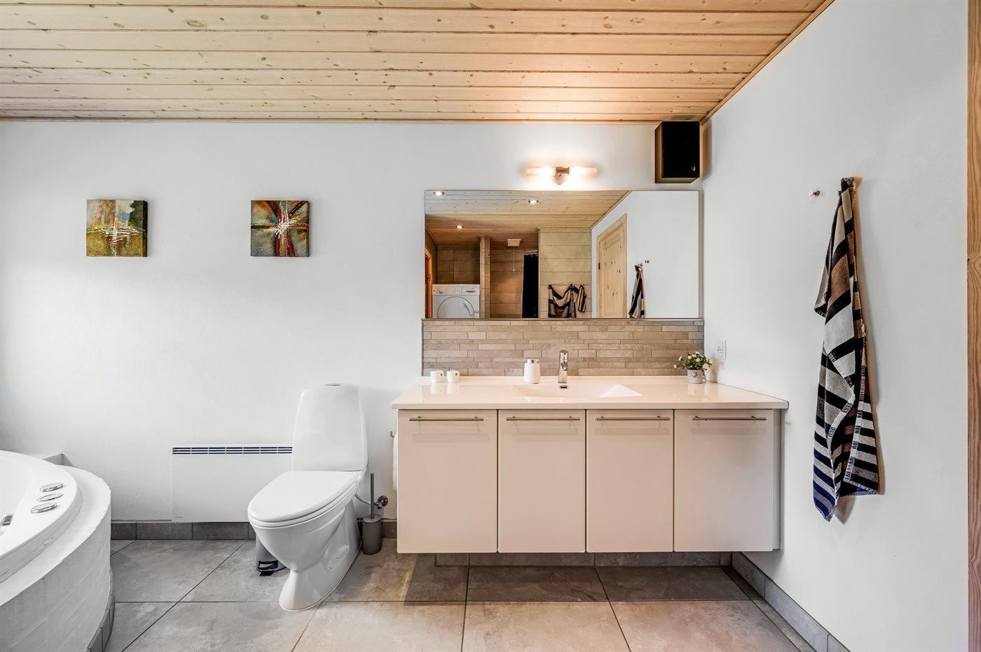 Im großen Badezimmer befinden sich eine Duschniche, eine Toilette, ein Whirlpool sowie Zugang zur Sauna. Zudem gibt es ein Gäste-Toilette. Der Whirlpool bietet Platz für 2 Personen.