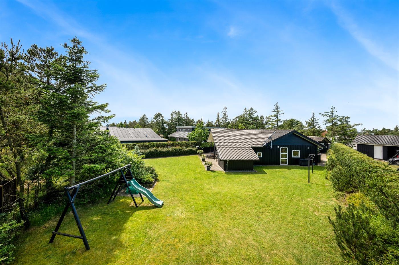 Das Ferienhaus liegt auf einem 908 m² großen Naturgrundstück. Es sind etwa 1700 Meter bis zum Meer und 250 Meter bis zur nächsten Einkaufsmöglichkeit. Es steht ein offenes Terrassenareal zur Verfügung. Zudem gibt es einen Grill, eine Schaukel, einen Sandkasten und eine Rutsche. Parkmöglichkeiten sind direkt am Haus vorhanden, und es gibt einen Carport sowie eine Ladestation für Elektroautos – Typ 2 Stecker mit 11 kW Ladeleistung.