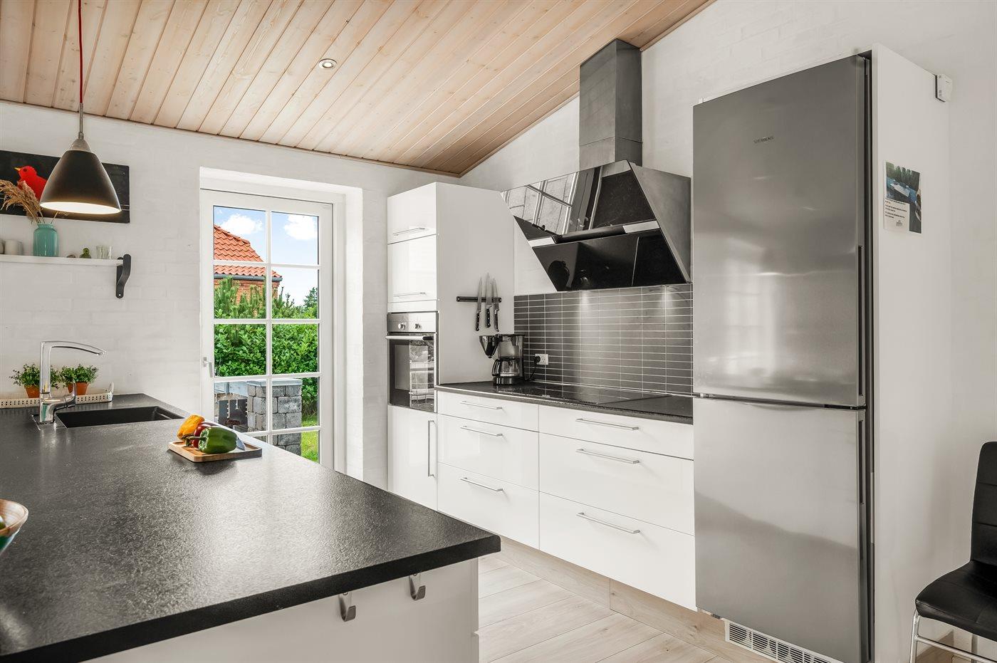 Die Küche ist mit Kühlschrank ausgestattet. Außerdem gibt es 4 Keramik-Kochfelder, Umluftofen, Mikrowelle sowie Geschirrspüler.