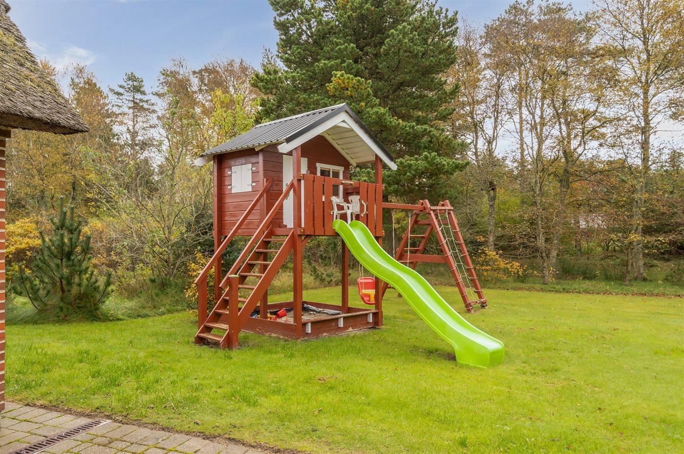 Die Ferienunterkunft liegt auf einem 2537 m² großen Naturgrundstück. Die Entfernung zum Meer beträgt 2400 m. Die nächste Einkaufsmöglichkeit liegt 1750 m entfernt. In einem Abstand von 5000 m gibt es einen Golfplatz. Es steht ein offenes Terrassenareal zur Verfügung. Schaukel. Sandkasten. Spielturm. Außensauna. Es steht ein Grill zur Verfügung. Es steht ein Carport zur Verfügung. Parkplatz auf dem Grundstück.