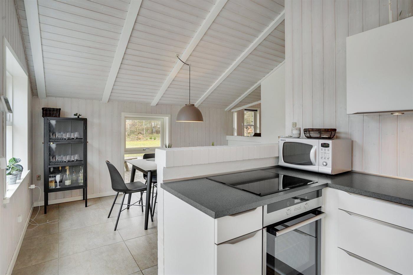 Die Küche ist mit Kühlschrank ausgestattet. Außerdem gibt es 4 Keramik-Kochfelder, Umluftofen, Mikrowelle sowie Geschirrspüler.