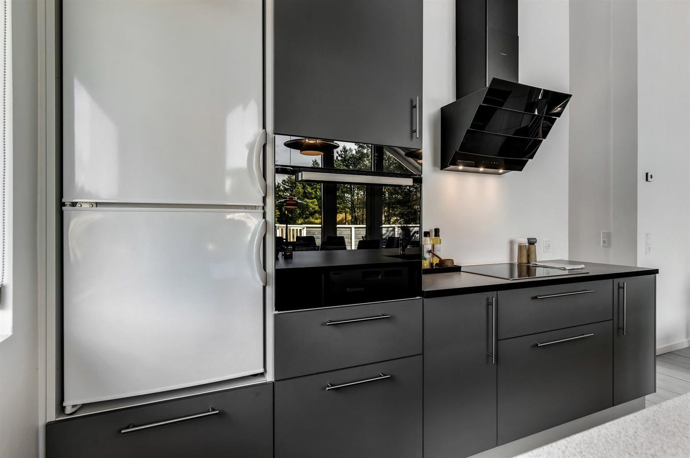 Die Küche ist mit Kühlschrank ausgestattet. Außerdem gibt es 4 Keramik-Kochfelder, Umluftofen, Mikrowelle sowie Geschirrspüler.