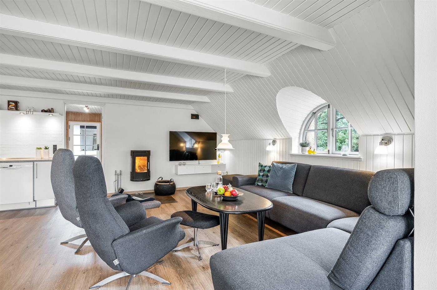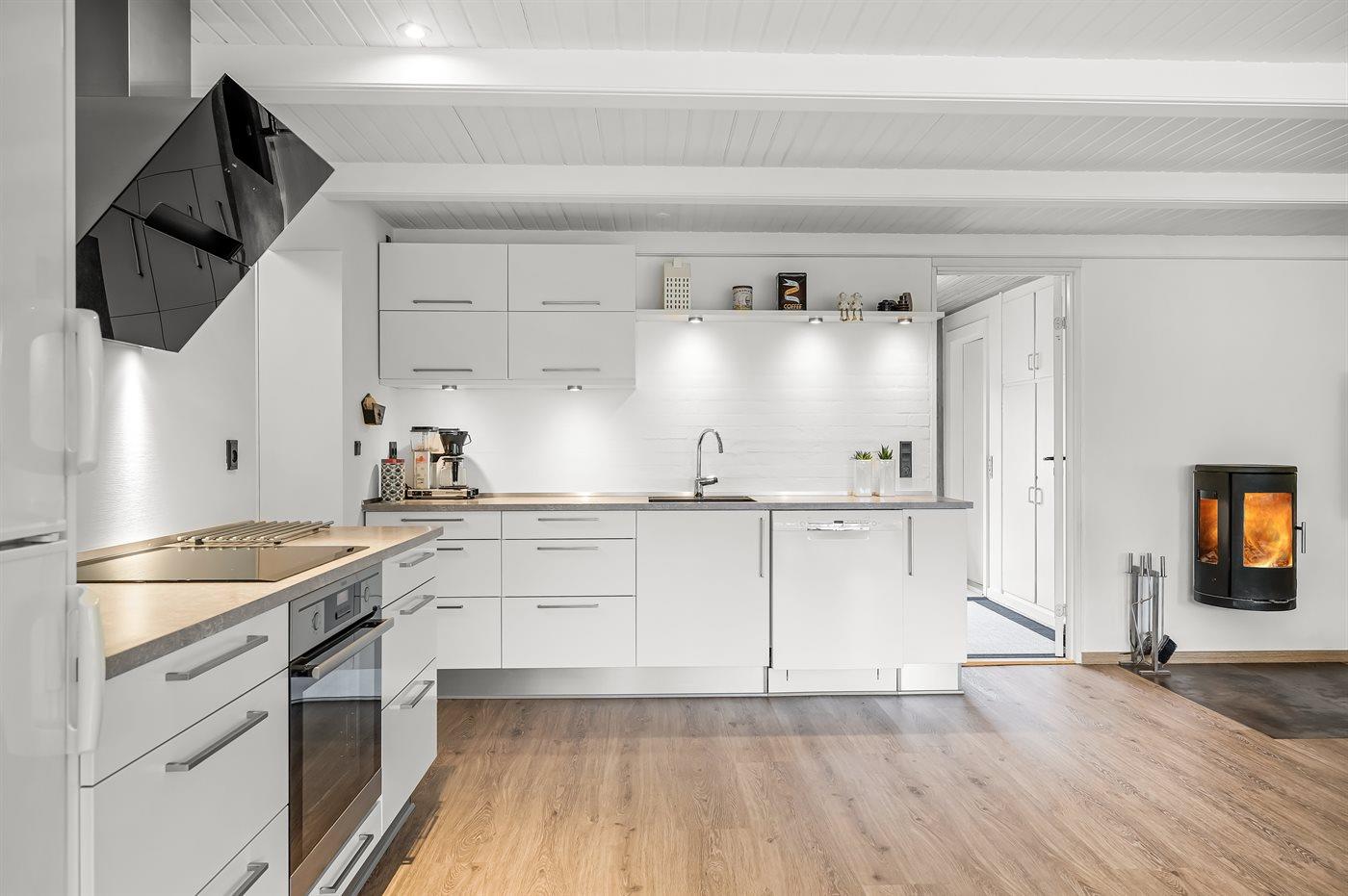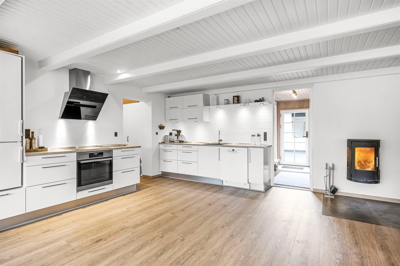 Schönes Badezimmer mit Fußbodenheizung, Duschnische, Waschmaschine und Wäschetrockner. Nette, helle Küche mit u. a. Geschirrspüler und Mikrowelle. Das gemütliche Wohnzimmer ist mit Kaminofen und TV ausgestattet. Ferner kostenlose, kabellose Internetverbindung vorhanden (Computer ist mitzubringen).