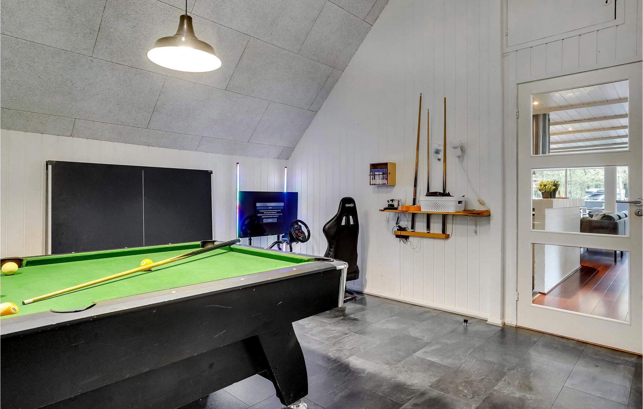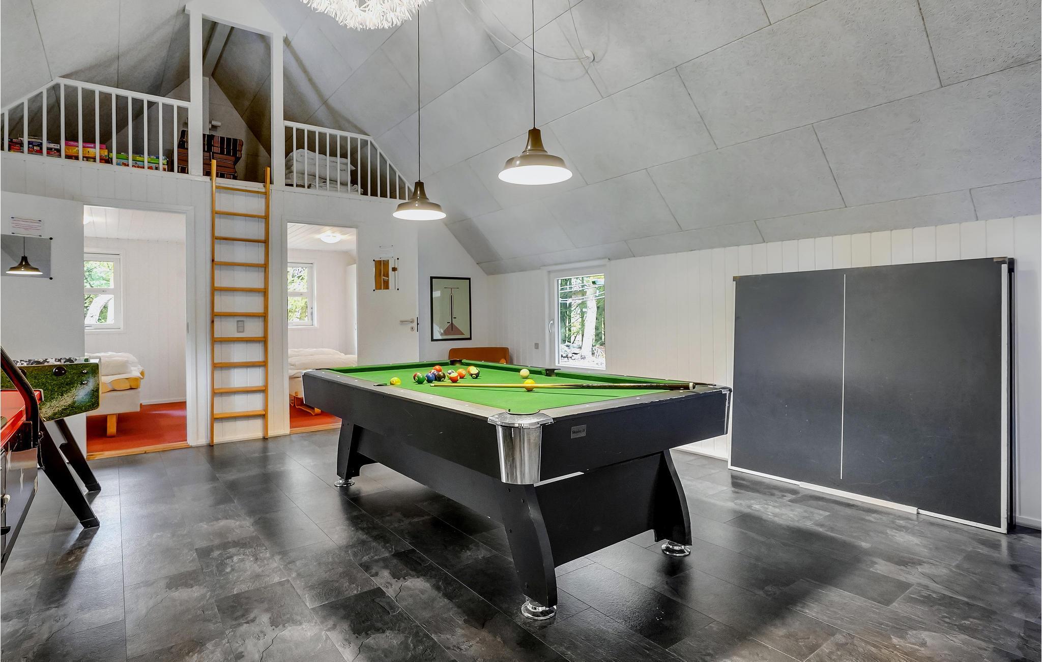 Der Aktivitätsraum ist riesige 35 m² groß und er enthält Spiele wie Billard und Tischtennis. Das Haus ist ideal für Familien, denn neben dem Aktivitätsraum gibt es auch eine Poolabteilung. Das Wohnzimmer in der Mitte schafft einen guten Zusammenhang und bietet allen einen schönen Versammlungsraum. Um die Stromkosten niedrig zu halten, gibt es eine Wärmepumpe, die das Wohnzimmer und den Pool beheizt. Sie blicken vom Wohnbereich in den Poolraum. Ein Badezimmer liegt im Poolraum. Ihre Kinder werden sich sicher gerne auf dem Schlafboden aufhalten. Die Terrasse auf 150 m² lässt auch windgeschützte Bereiche zu. Im Garten können Sie Rehe, Eichhörnchen und Vögel beobachten.