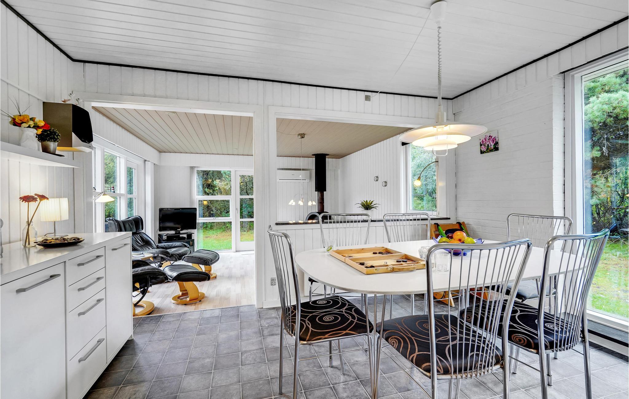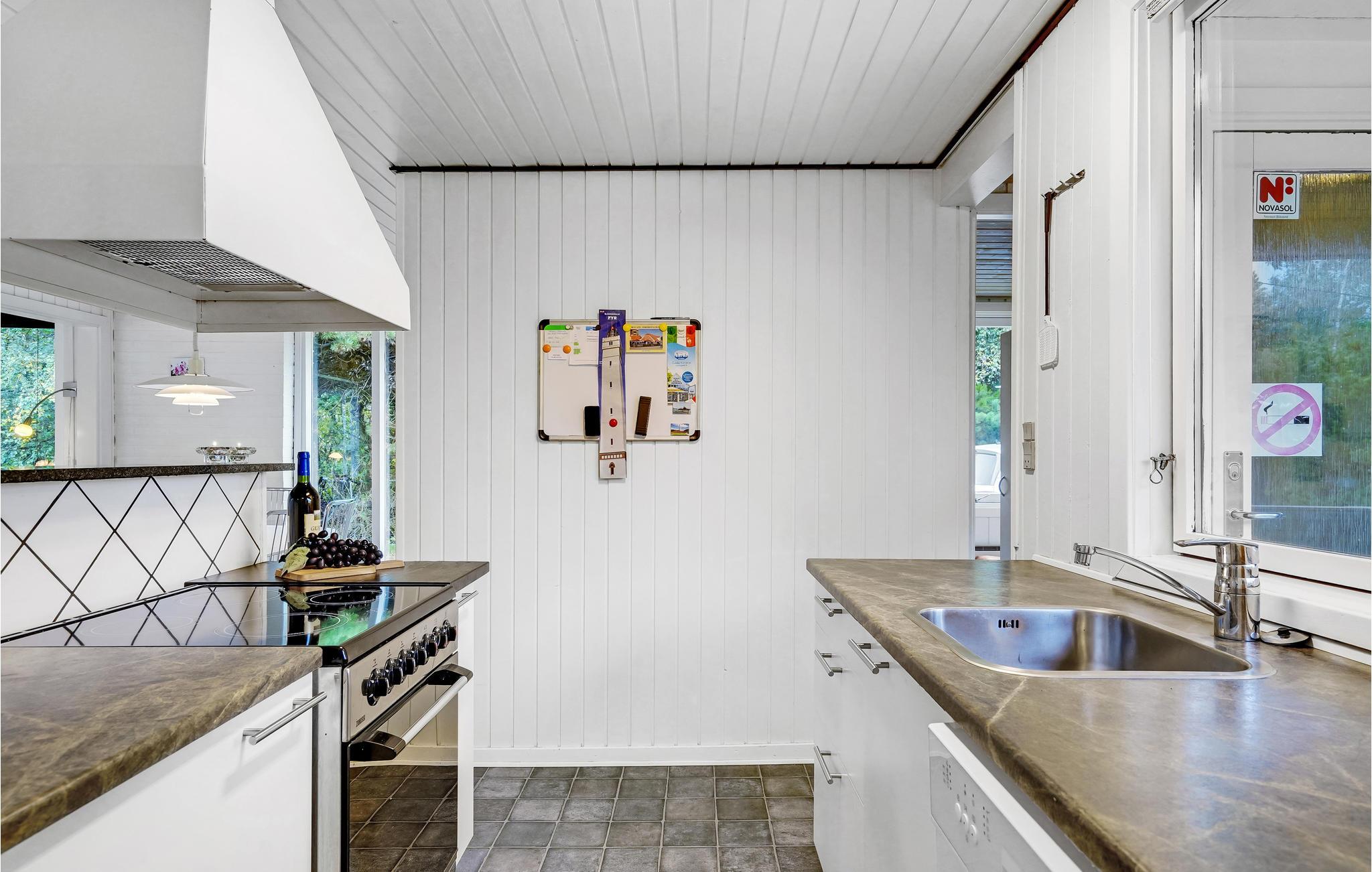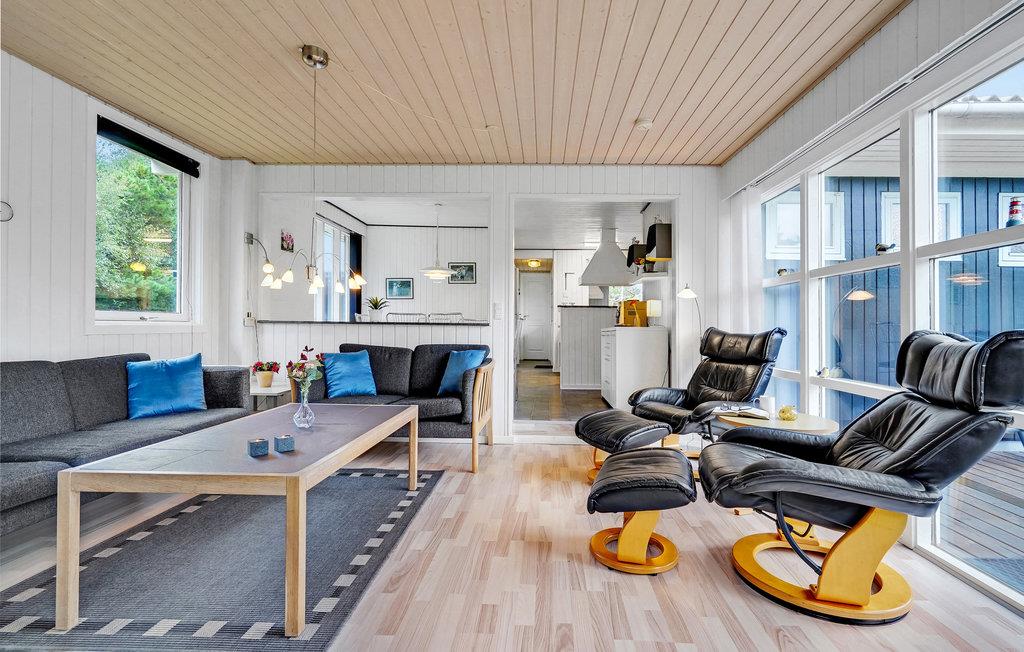 Die Holzwände und -decken schaffen eine gemütliche Atmosphäre. Zur reichen Ausstattung gehört ein Whirlpool für fünf Personen und eine Sauna, die zu verwöhnenden Momenten einladen. Im hellen Wohnzimmer können Sie sich im Sessel neben dem Kaminofen in ein gutes Buch vertiefen oder einen Film gucken. Zudem haben Sie Zugang zu einer großzügigen Terrasse auf einem sichtgeschützten Grundstück, mit Grill und Sonnenliegen. Somit haben Sie ideale Verhältnisse zum Sonnenbaden und eine überdachte Terrasse, wo Sie die frische Luft zu den ständig wechselnden Wolkenformationen genießen können. Außerdem gibt es auch ein Fußballtor, Schaukel und Sandkasten, sowie einen Spielturm. Hier werden alle Angehörigen glücklich werden und die Zeit in Dänemark genießen.