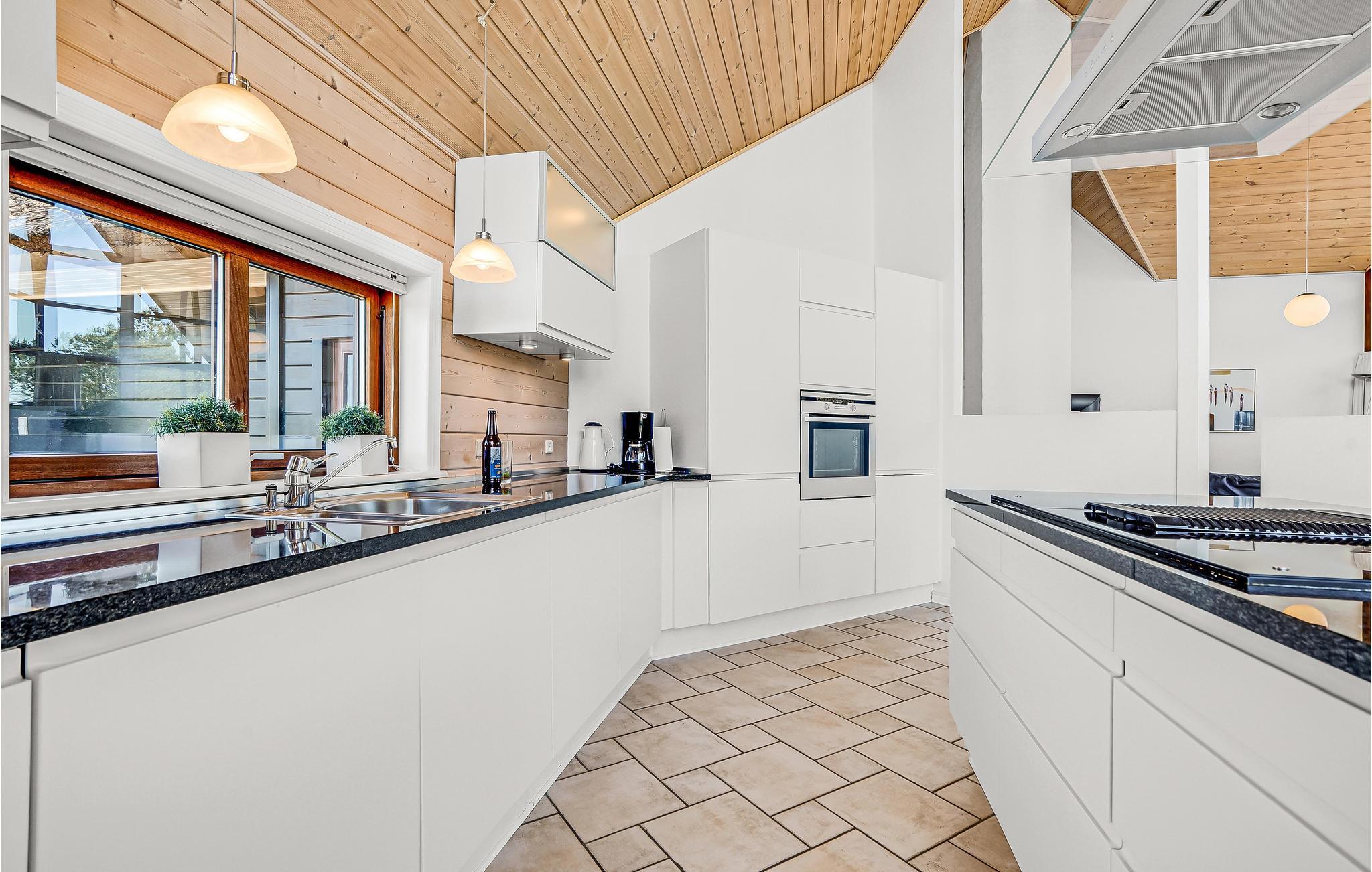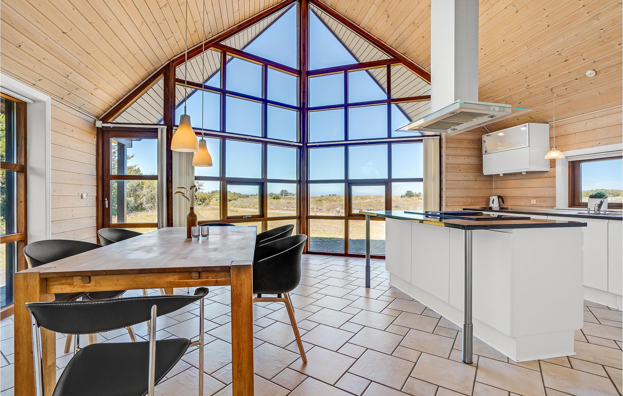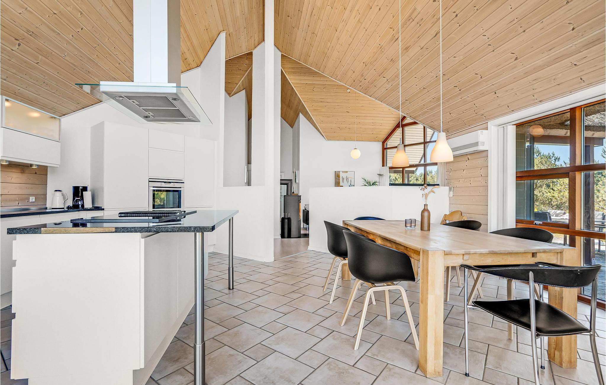 Dieses schöne Reetdachhaus begeistert mit großen Fensterfronten, die das Interieur mit reichlich natürlichem Tageslicht versorgen und zugleich einen bezaubernden Blick auf die Heidelandschaft bieten. Helle Möbel, hohe Holzdecken und der knisternde Kaminofen schaffen eine behagliche Atmosphäre, die Sie bei harmonischen Mahlzeiten und gemütlichen Spieleabenden auf sich wirken lassen können. Freuen Sie sich auf abendliches Kochen und gönnen Sie sich nach einem langen Tag an der frischen Seeluft ein wohliges Bad im Whirlpool.