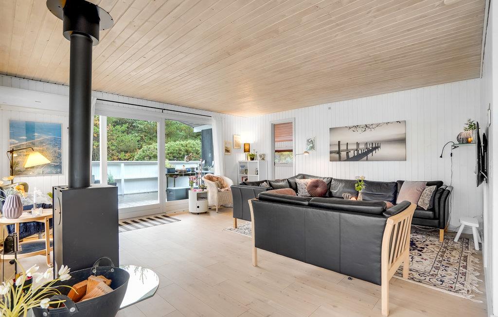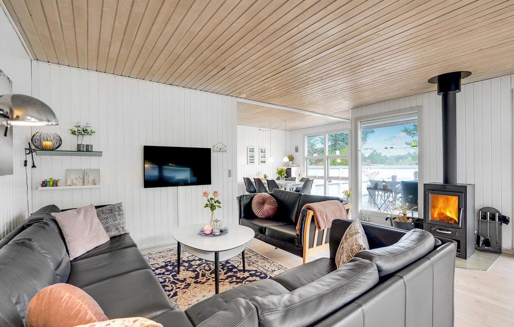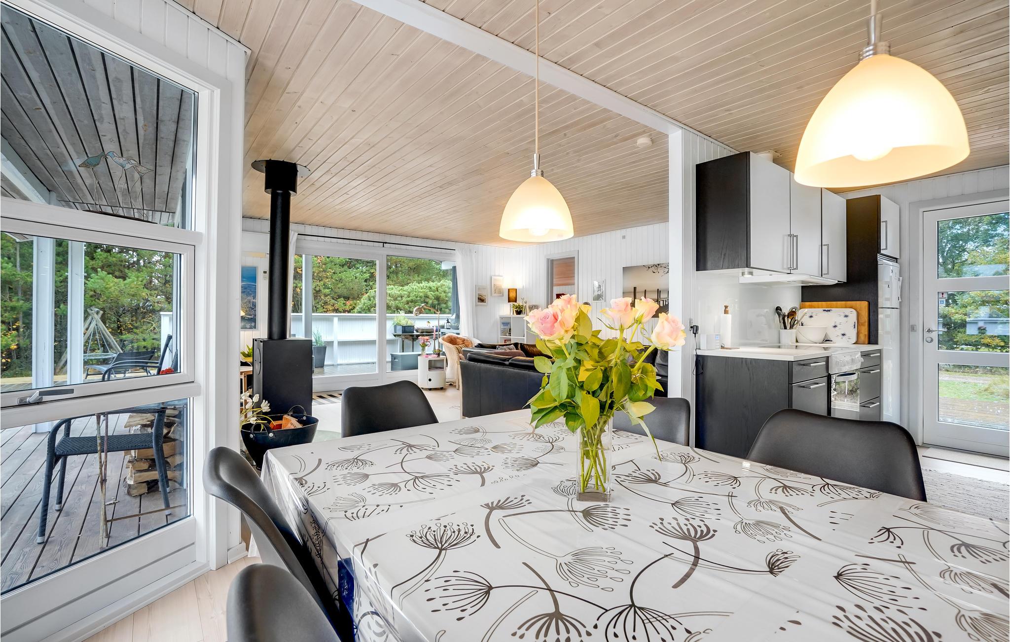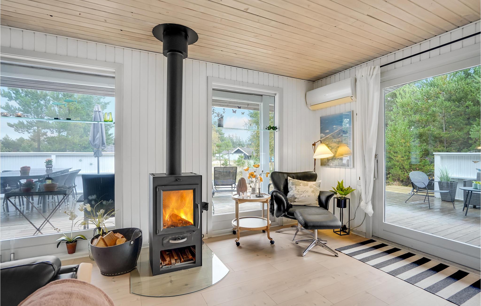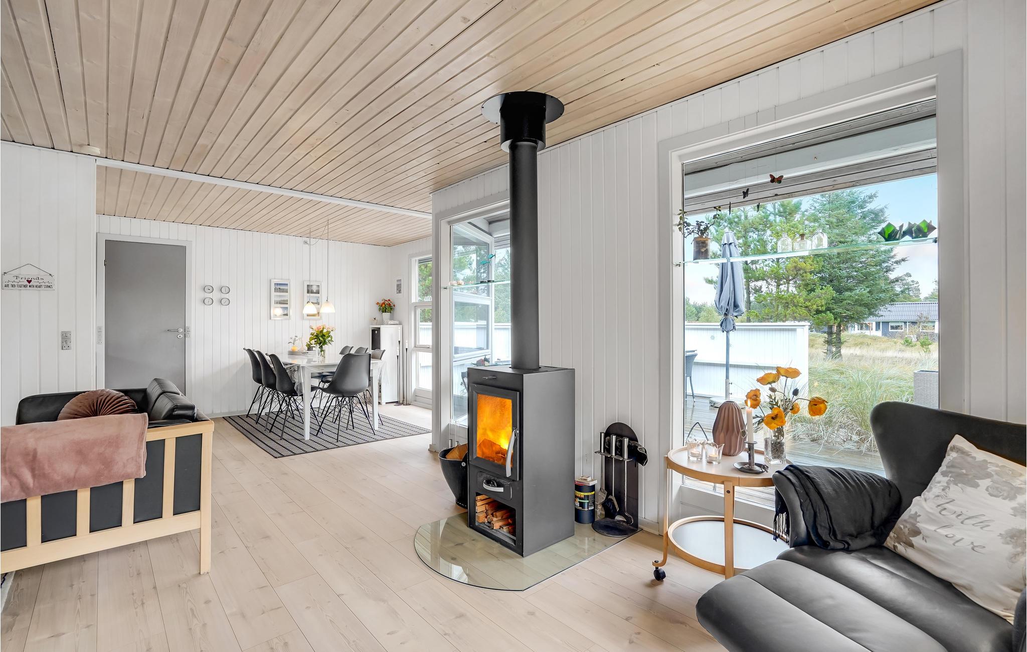 Dieses helle Ferienhaus lädt Sie zu einem Familienurlaub in entspannter Atmosphäre ein. Das große, kombinierte Wohnraum und Küche ist ein schöner Ort für gesellige Mahlzeiten und gemütliche Brettspielabende. Hier können Sie sich im Sofabereich herrlich entspannen und in den kühleren Jahreszeiten vor dem Kaminofen wärmen. Von hier aus haben Sie Zugang zur großzügigen Terrasse und dem Außenbereich.