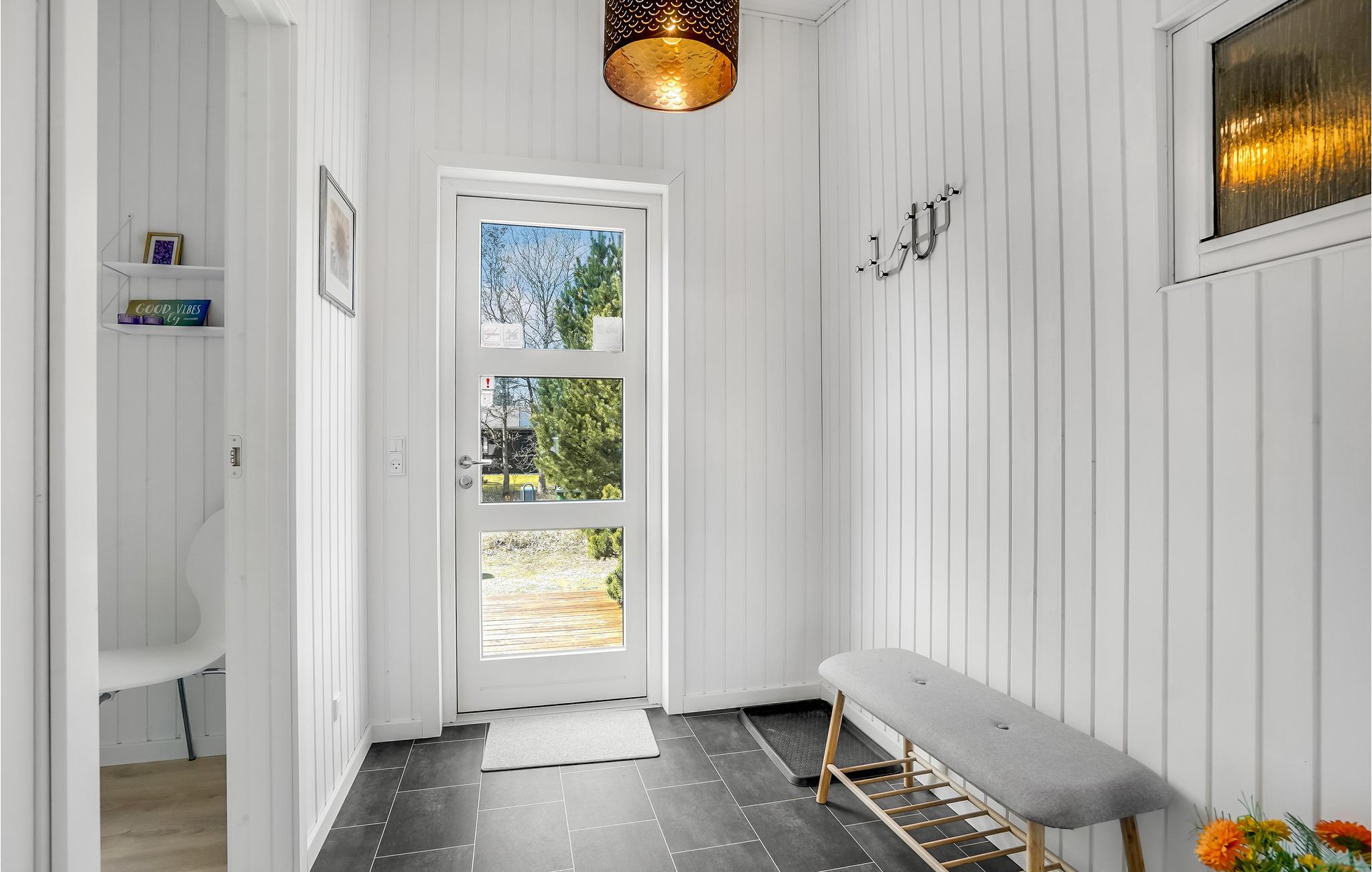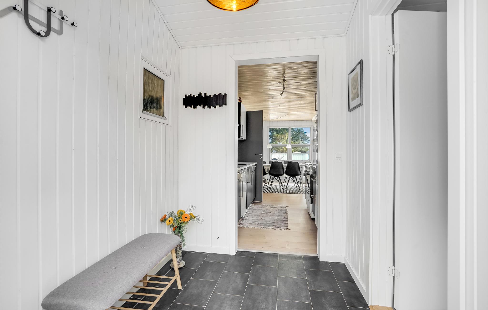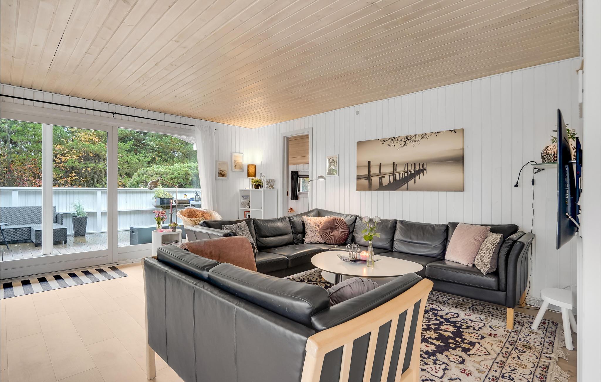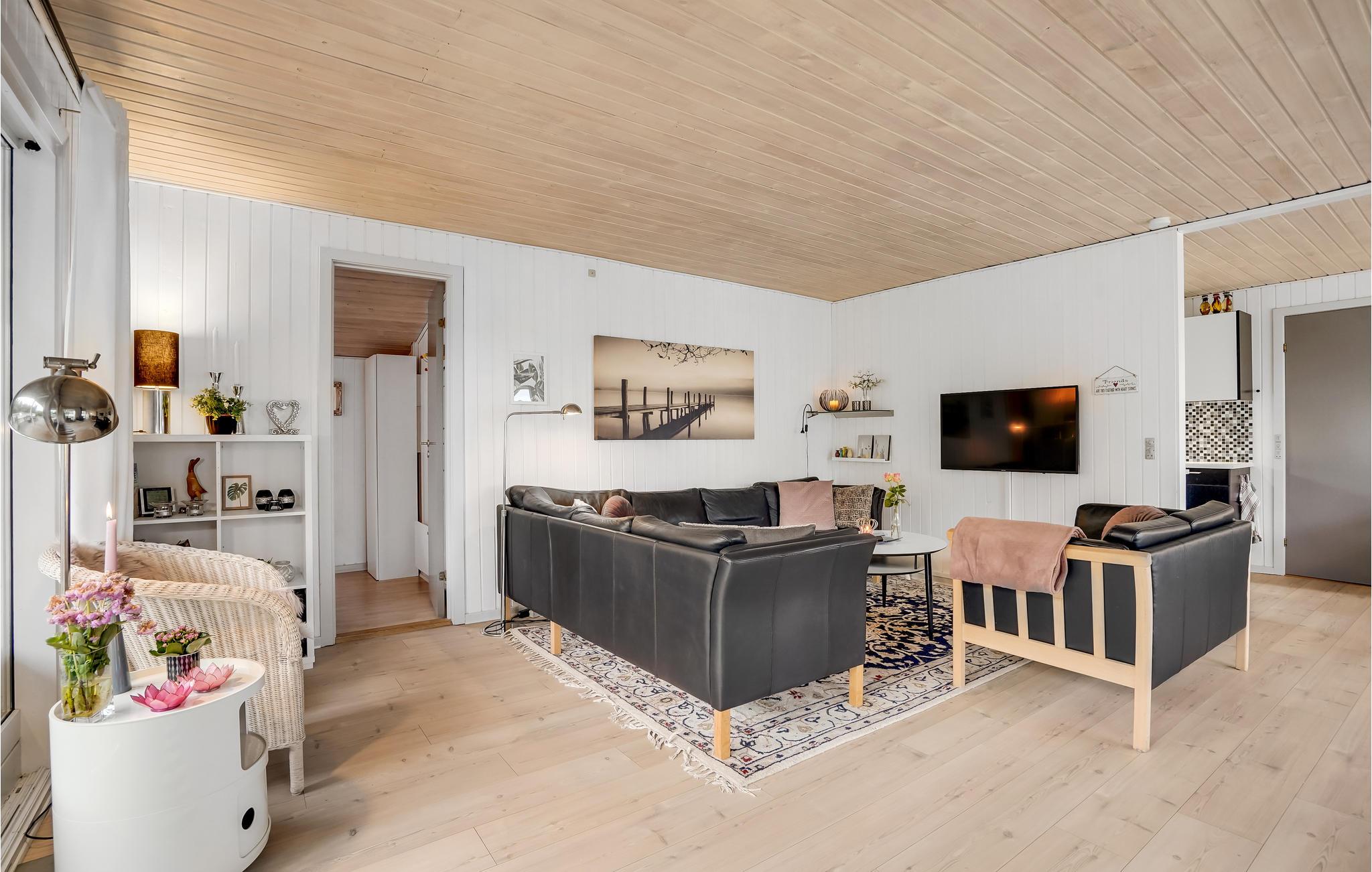Dieses helle Ferienhaus lädt Sie zu einem Familienurlaub in entspannter Atmosphäre ein. Das große, kombinierte Wohnraum und Küche ist ein schöner Ort für gesellige Mahlzeiten und gemütliche Brettspielabende. Hier können Sie sich im Sofabereich herrlich entspannen und in den kühleren Jahreszeiten vor dem Kaminofen wärmen. Von hier aus haben Sie Zugang zur großzügigen Terrasse und dem Außenbereich.