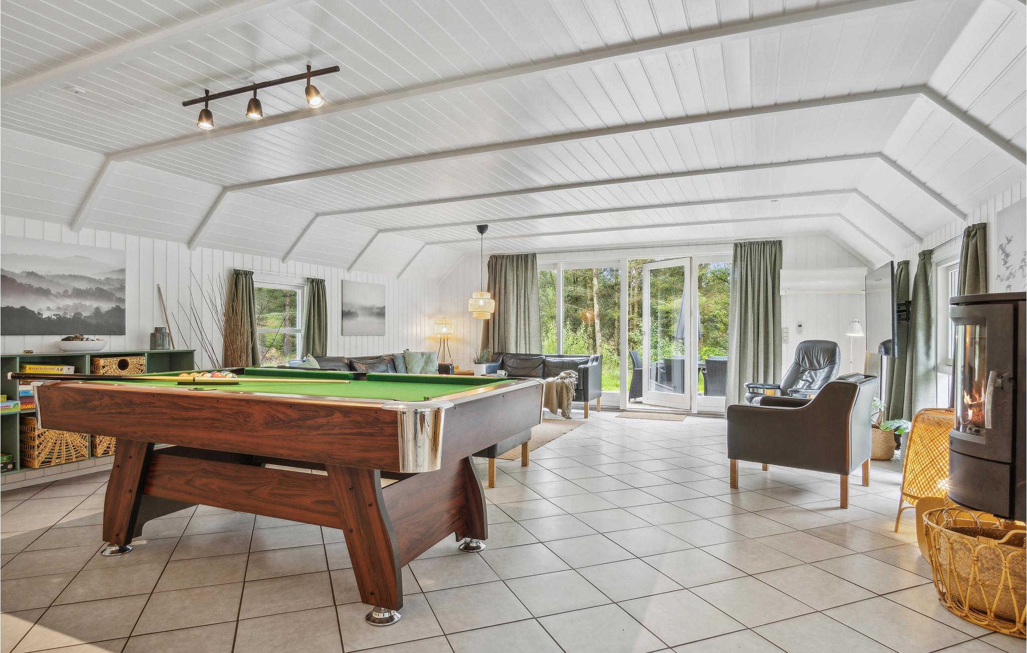 Sie sehnen sich nach einem Großfamilienurlaub oder möchten mit befreundeten Familien verreisen? Dann haben Sie hier das ideale Ferienhaus gefunden. Alle Gäste und Ihre Vierbeiner werden sich hier wohlfühlen. Der große und offene Wohnbereich wird Ihren Blick auf den Swimmingpool lenken, der nur durch eine Fensterfront abgetrennt ist. Ihre Kinder können sich daher im Swimmingpool vergnügen, während Sie gemütlich Ihren Kaffee am Esstisch oder dem Sofa trinken. Auch eine Partie Tischkicker oder Pool ist möglich. Der zusammenhängende Wohn- und Aktivitätsbereich verspricht Ihnen daher eine gesellige Zeit. Auch der Garten lädt Ihre Kinder zum Spielen ein, denn Spielgeräte sind über den garten verteilt. In den warmen Monaten können sie auf der Terrasse auch grillen und Ihre Urlaubsmahlzeiten im Freien einnehmen.