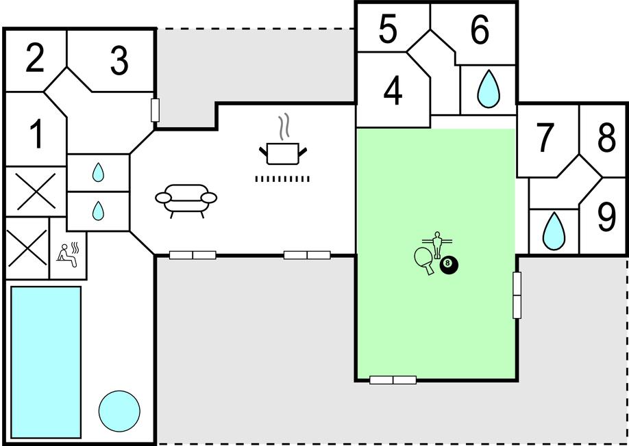 Dieses schöne große Ferienhaus nah an Meer und Stadt umfasst alles, was das Herz begehrt, ob Sie entspannen oder aktiv sein möchten. Erfrischen Sie sich im schönen Pool, nehmen Sie ein warmes Bad im großen Spa nach einem herrlichen Spaziergang am Strand. Oder genießen Sie einen Aktivitätstag im großen Aktivitätsraum mit z.B. Pooltisch, Tischtennis oder PS3 oder draußen, wo es Tore und Trampolin gibt. Blåvand lädt zu schönen Spaziergängen am Strand an der brausenden, frischen Nordsee, oder erkunden Sie die alten Bunker. Die Stadt ist auch interessant mit betriebenen Werkstätten, guten Geschäften und vielen schönen Restaurants. In Blåvand und den Gebieten darum gibt es sehr viele Pfade für Spaziergänger, Läufer und Radfahrer. Es gibt flache Pfade, aber auch Strecken für Mountainbiker, die im Gelände interessante Fahrten im Gelände wünschen. Wollen Sie an einem Tag eine Ausfahrt machen, sind sowohl Esbjerg als auch Varde einen Besuch wert. Esbjerg mit dem Musikhaus, den Vier Männern am Meer und dem Fischereimuseum. Varde mit seinen alten Straßen und der Ministadt, wo die alten Häuser von Varde im Miniformat wiederaufgebaut sind.