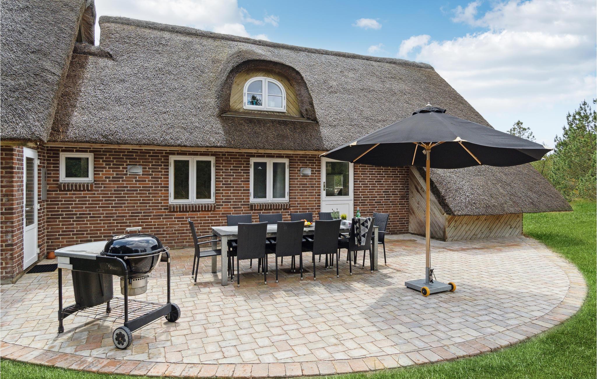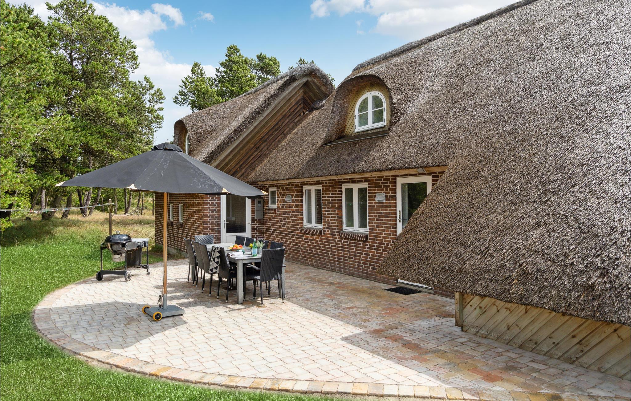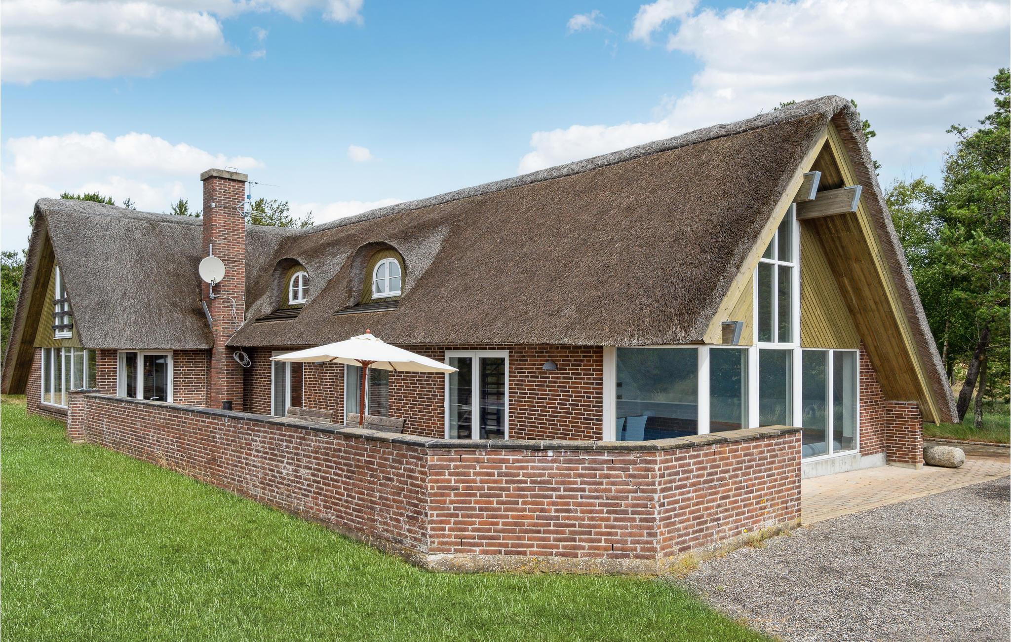 Schönes, gemütliches Ferienhaus, zentral in Blåvand gelegen. Mit seinem Reetdach passt es gut in die Natur. Das Haus enthält einen großen Poolraum, der stundenlangen Spass garantiert. Vom großen Whirlpool haben Sie einen guten Blick auf den Raum. In der großen Wohnküche kann sich die ganze Familie versammeln, im 1. Stock gibt es ein Wohnzimmer. Zum Haus gehört auch ein großzügiges und unter Naturschutz stehendes Grundstück, das zur Entfaltung im Freien einlädt. Die Nordsee mit ihren rauen Wellen verlangt auch gesehen zu werden, zu jeder Jahreszeit. In Blåvand finden Sie alles für den täglichen Gebrauch, auch Kunsthandwerker. Der Strom in diesem Haus wird von Windmühlen produziert.