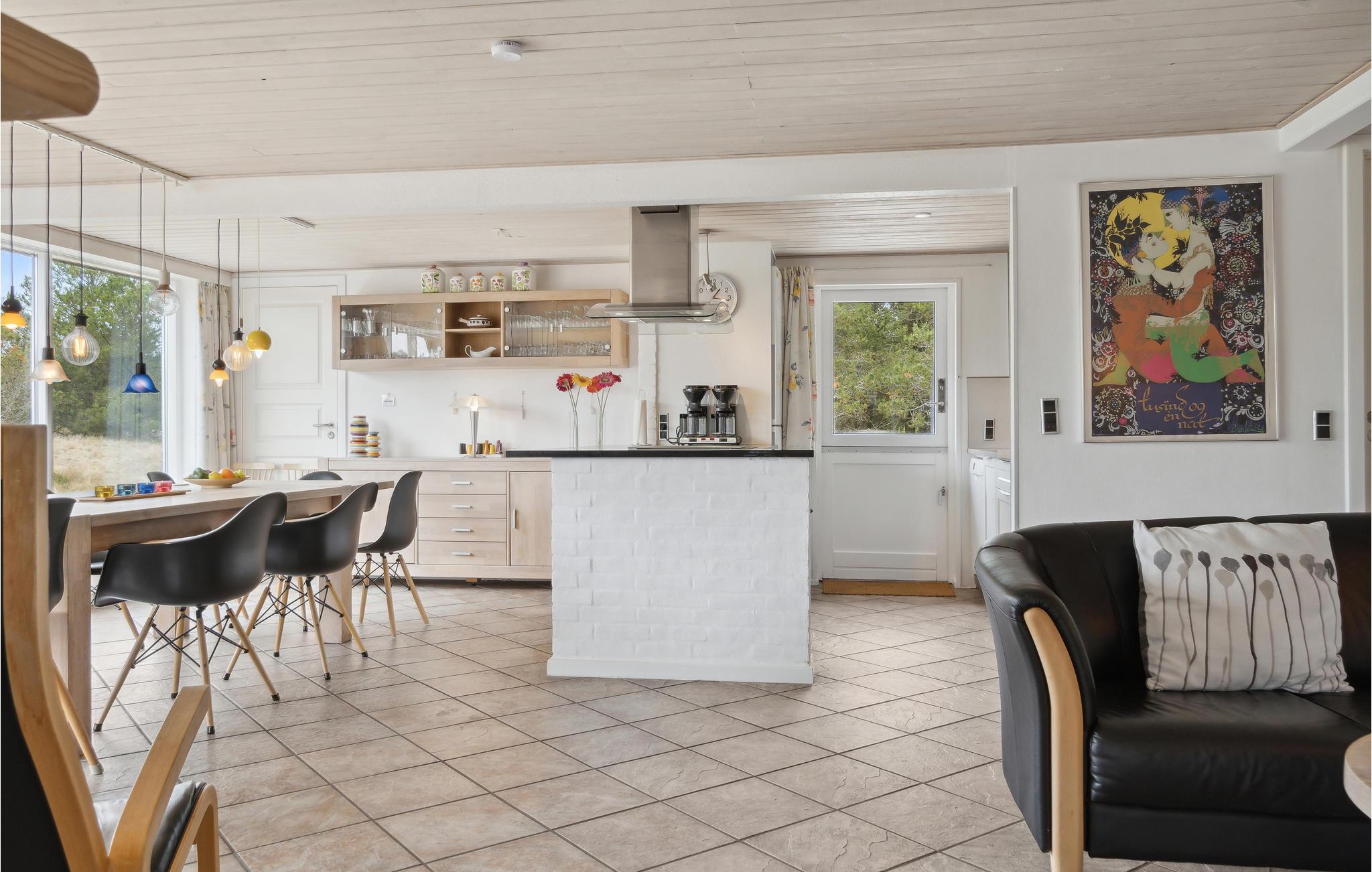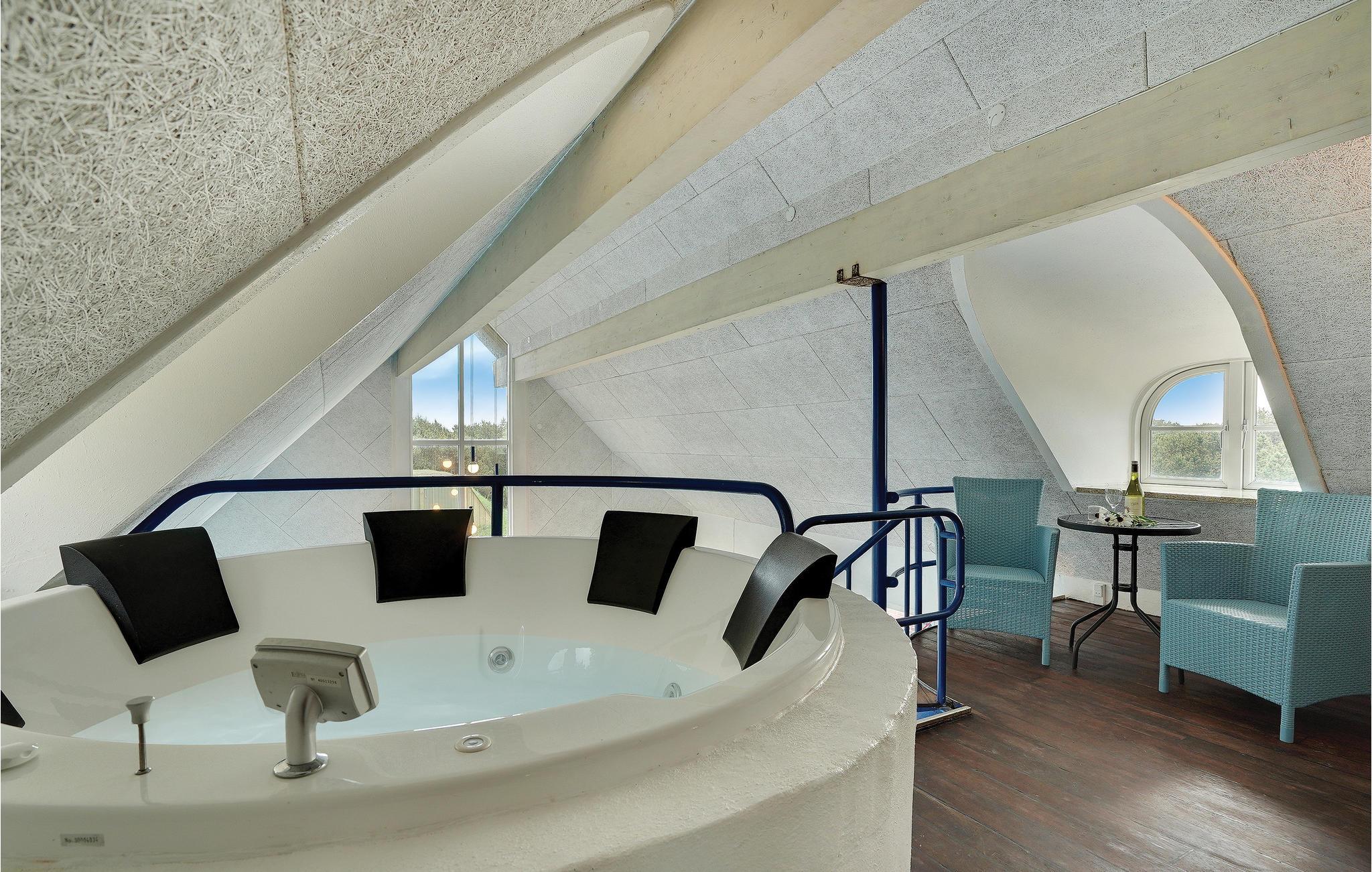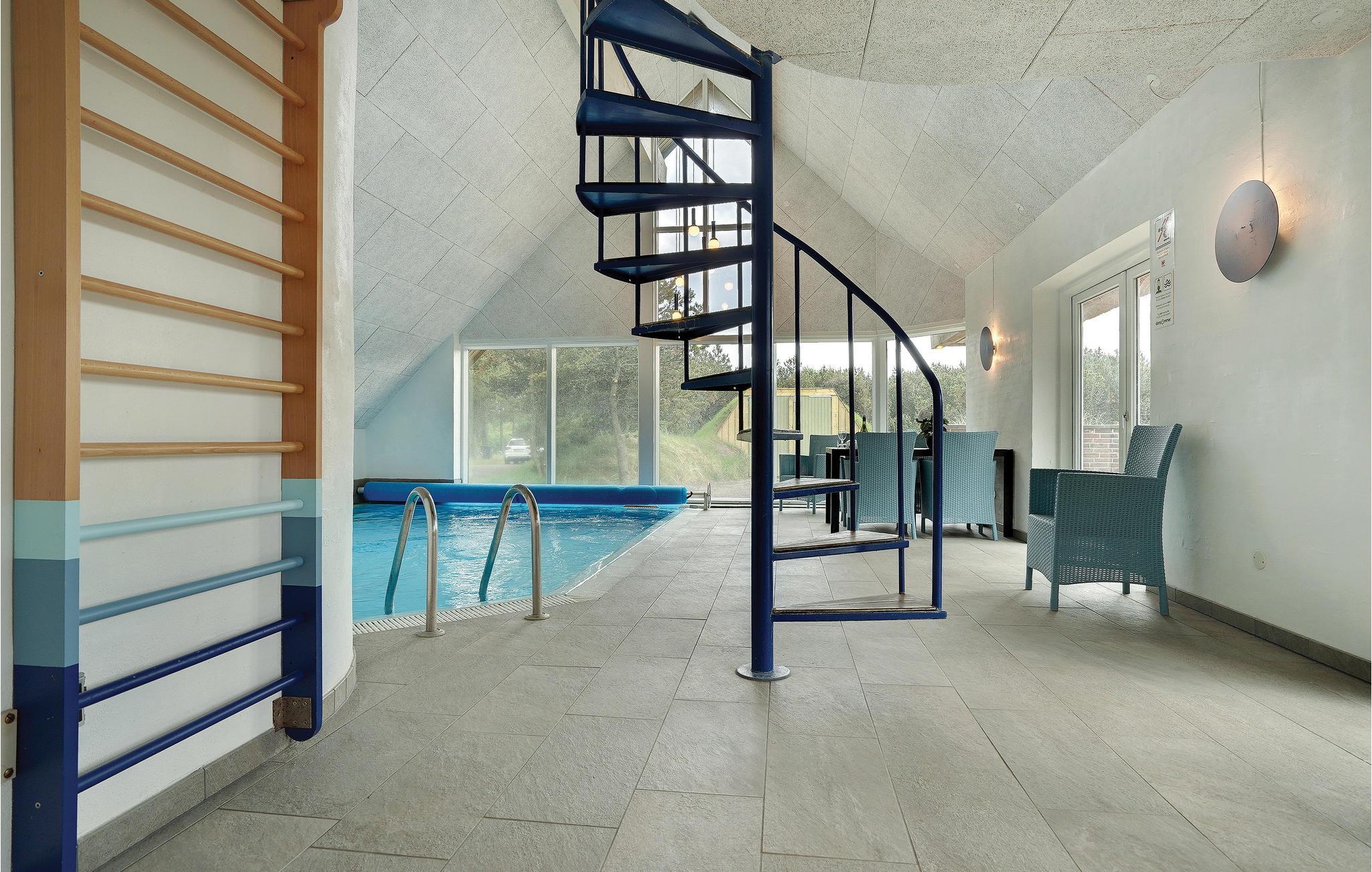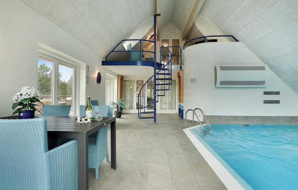 Schönes, gemütliches Ferienhaus, zentral in Blåvand gelegen. Mit seinem Reetdach passt es gut in die Natur. Das Haus enthält einen großen Poolraum, der stundenlangen Spass garantiert. Vom großen Whirlpool haben Sie einen guten Blick auf den Raum. In der großen Wohnküche kann sich die ganze Familie versammeln, im 1. Stock gibt es ein Wohnzimmer. Zum Haus gehört auch ein großzügiges und unter Naturschutz stehendes Grundstück, das zur Entfaltung im Freien einlädt. Die Nordsee mit ihren rauen Wellen verlangt auch gesehen zu werden, zu jeder Jahreszeit. In Blåvand finden Sie alles für den täglichen Gebrauch, auch Kunsthandwerker. Der Strom in diesem Haus wird von Windmühlen produziert.