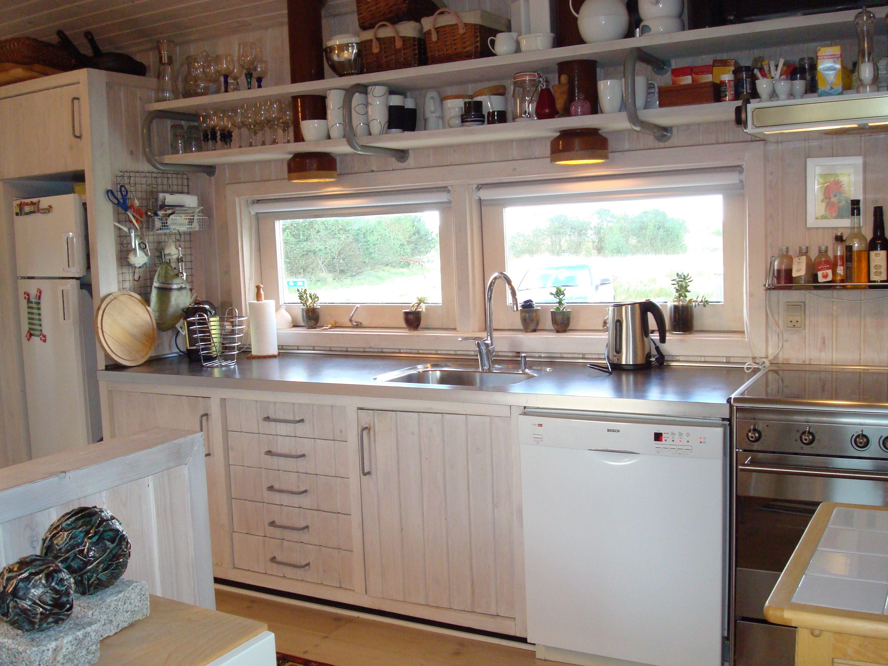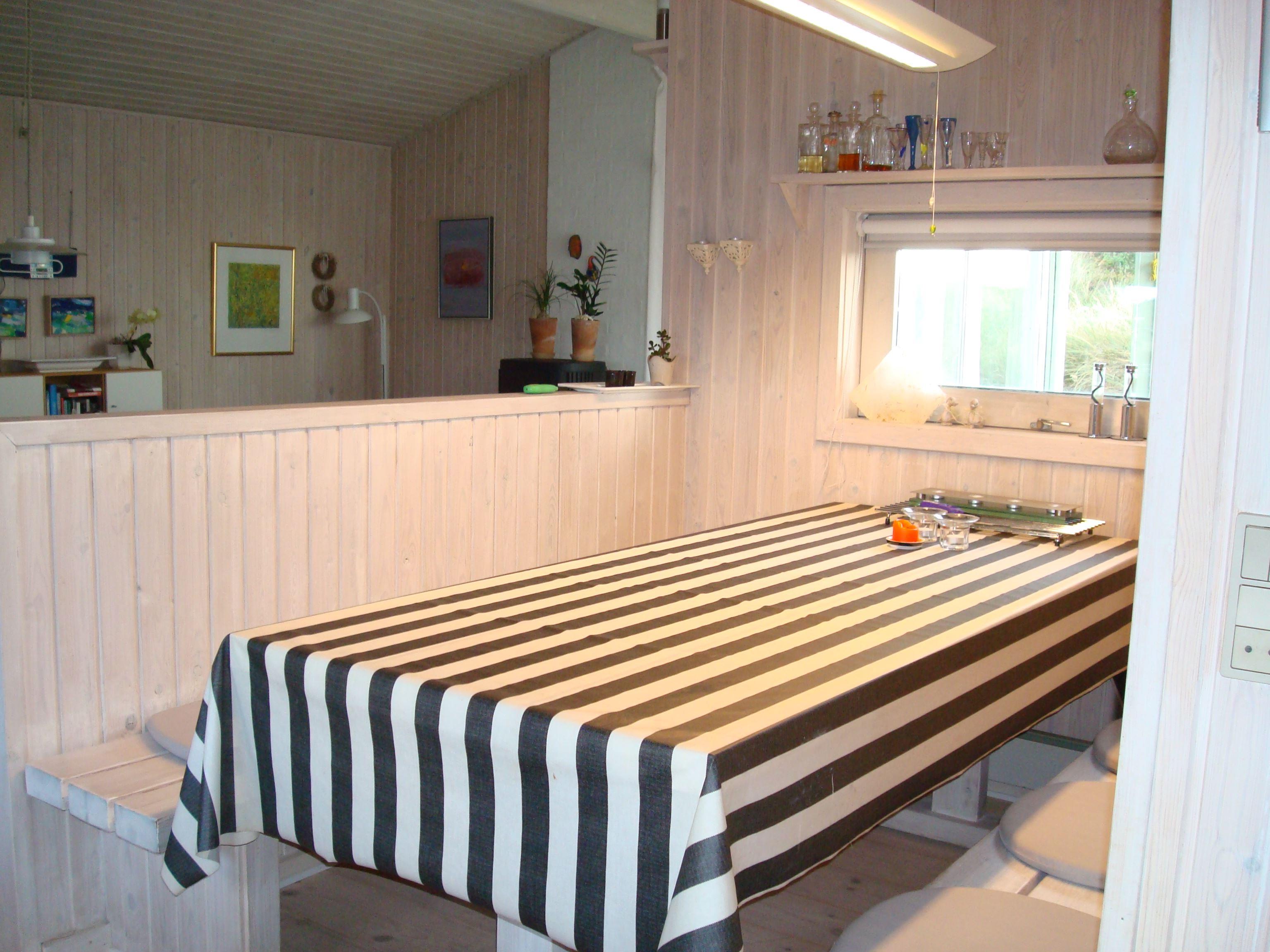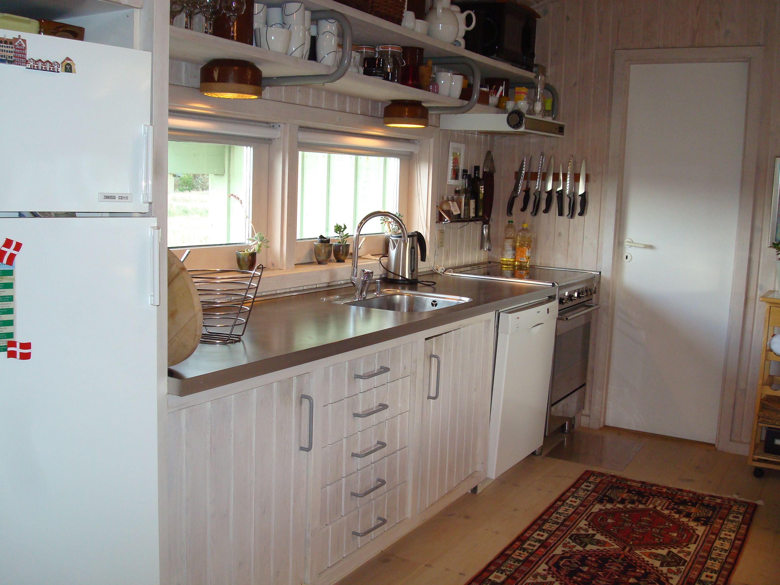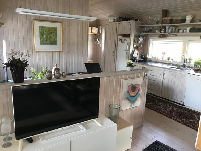 Når man træder ind i huset, mødes man af et flot og lyst køkken alrum, som går i kip. Køkkenet er flot og rustikt med sine smarte løsninger – her er alt der bør være i et sommerhuskøkken. Endvidere er der overfor køkkenet et spisebord med tilhørende bænke. På den anden side af halvvæggen finder man stuen, som er rigtig personliggjort med spændende brugskunst og billeder. Her er en sofa med matchende to bløde stole, som vil skabe rammerne for nogle rigtig hyggelige timer med familien. Her kan familien nyde varmen fra brændeovnen, se en god film i tv'et eller spille et brætspil på det store sofabord.