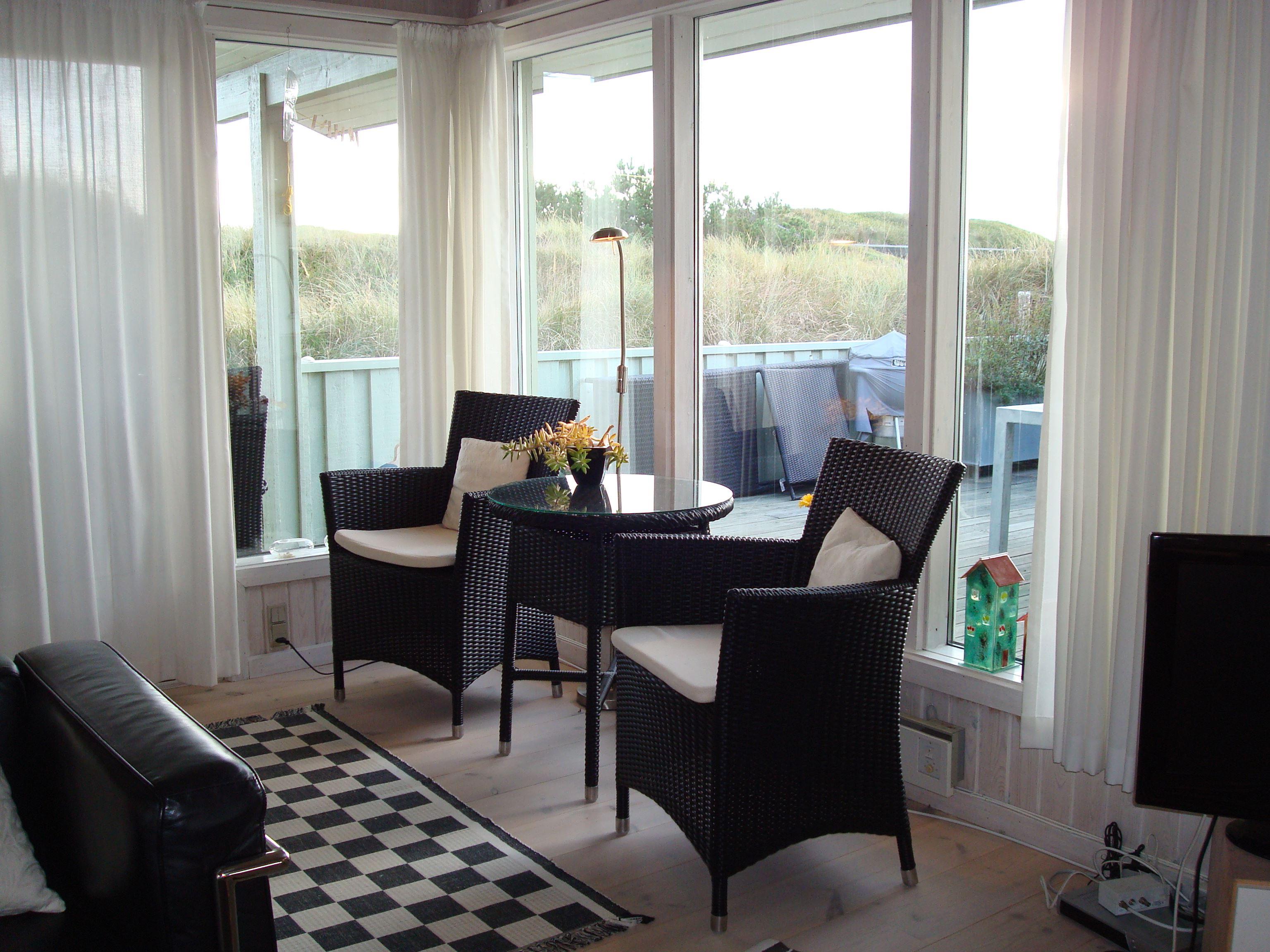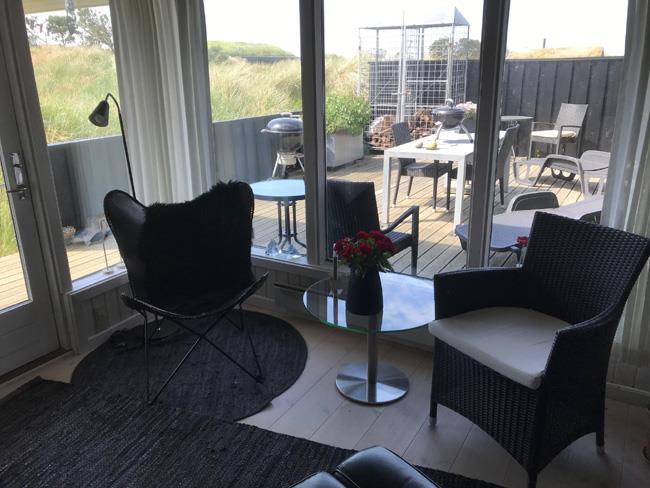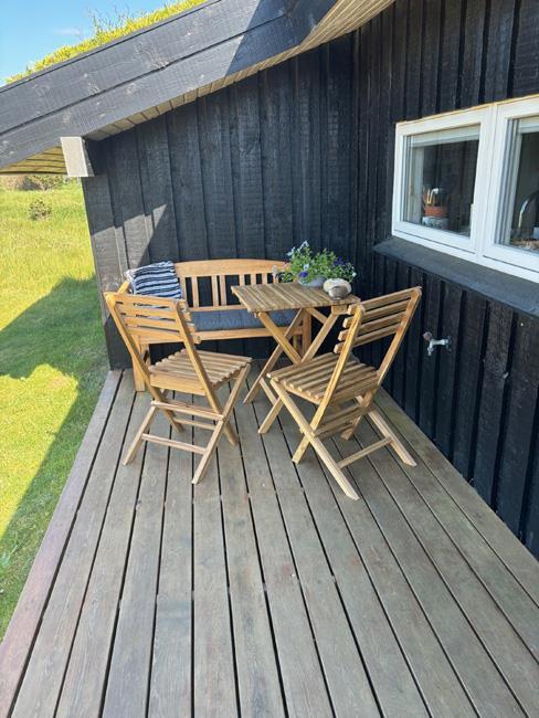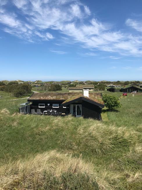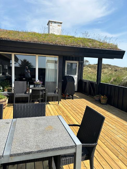 Dette hus har en vidunderlig placering midt i klitheden tæt på havet. Man kan ligefrem høre havet brus, når man sidder og nyder det skønne vejr på terrassen. Denne terrasse er delvist afskærmet, hvilket betyder, at man kan få læ for vinden og at man kan solbade. Dette sommerhusområde er rigtig hyggeligt, og med masser af plads, til at man kan nyde naturen og den friske luft. Huset har græstag, hvilket er en stil der går igen på stort set alle husene i dette område. Udover den lækre aflukkede terrasse, har huset også en lille terrasse ved fordøren, hvilken er todelt. Fra denne terrasse kan man nyde den skønne morgensol med en god kop kaffe.