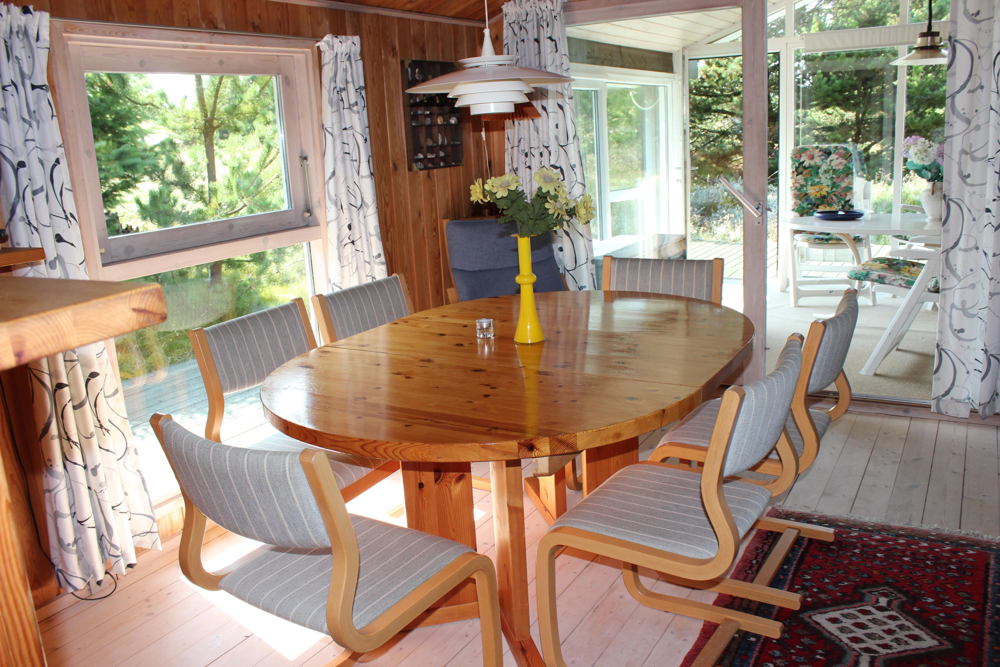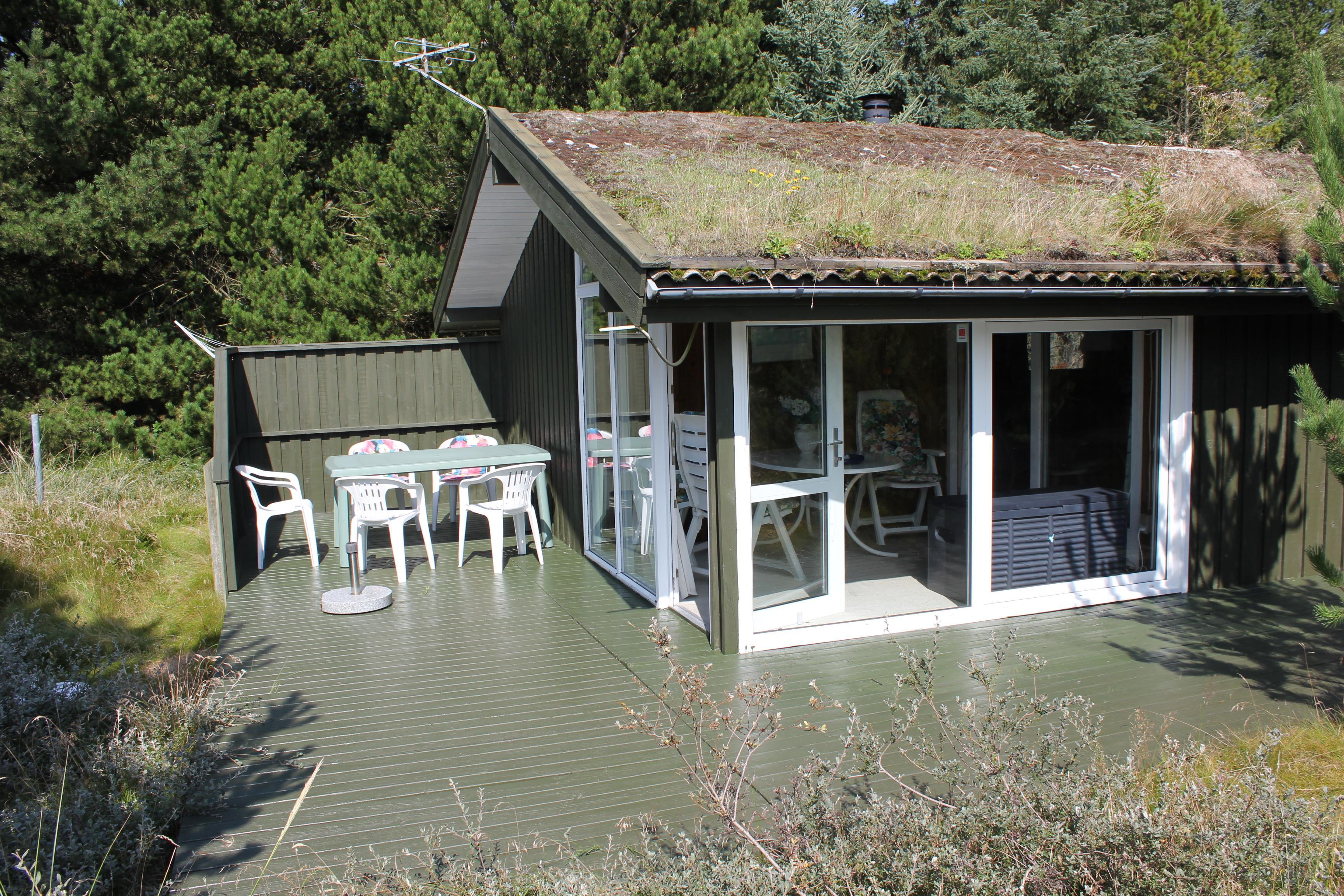 Dieses Haus liegt auf einem Grundstück, das mit Strandhafer, Heidekraut und Bäumen bewachsen ist. Es liegt in einem schönen Ferienhausgebiet, das Ruhe und Zeit für Entspannung ausstrahlt. Das Haus ist an 3 Seiten von einer Terrasse umgeben, von der die Seite, auf die die Haupteingangstür hinausgeht, überdacht ist. Auf den anderen beiden Seiten ist die Terrasse wunderbar geräumig und von aussen nicht einsehbar. Hier kann man viele Stunden verbringen, indem man z. B. die schöne Sonne geniesst oder mit einem Familienspiel an dem grossen Gartentisch sitzt. Von der Terrasse gegenüber dem Haupteingang führt eine Tür in einen schönen hellen Wintergarten, in dem man es sich gemütlich machen kann, ganz gleich, welches Wetter Dänemark gerade anbietet.
