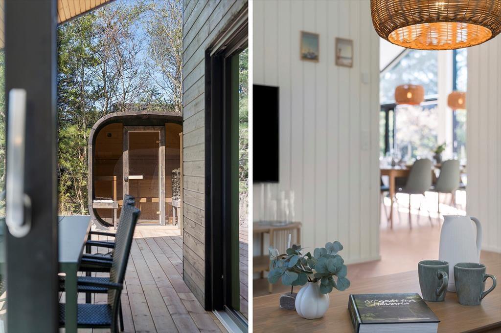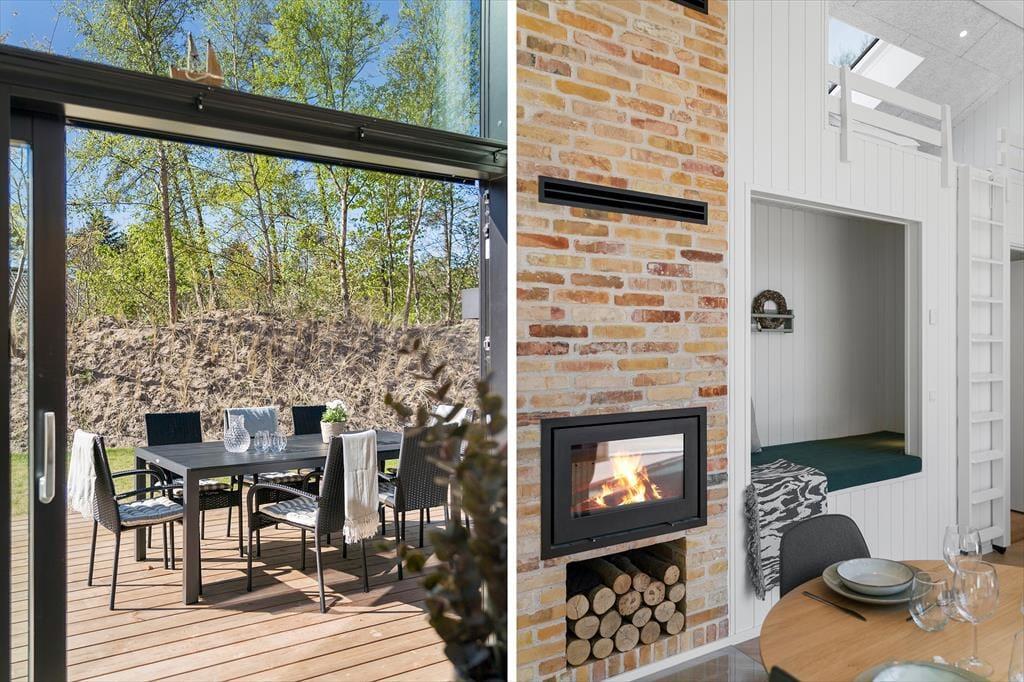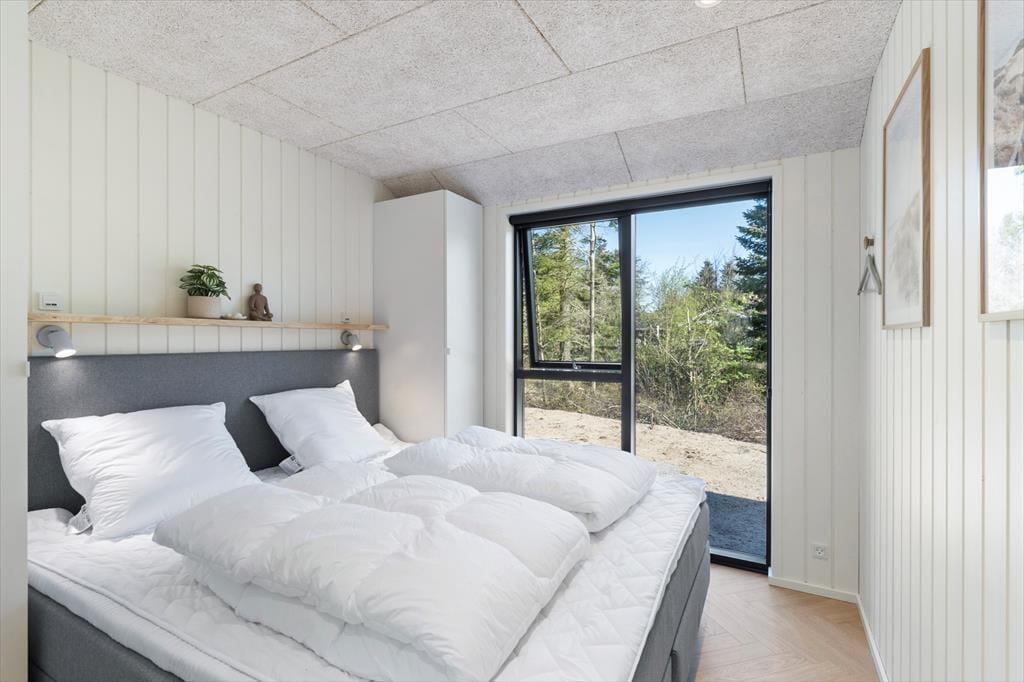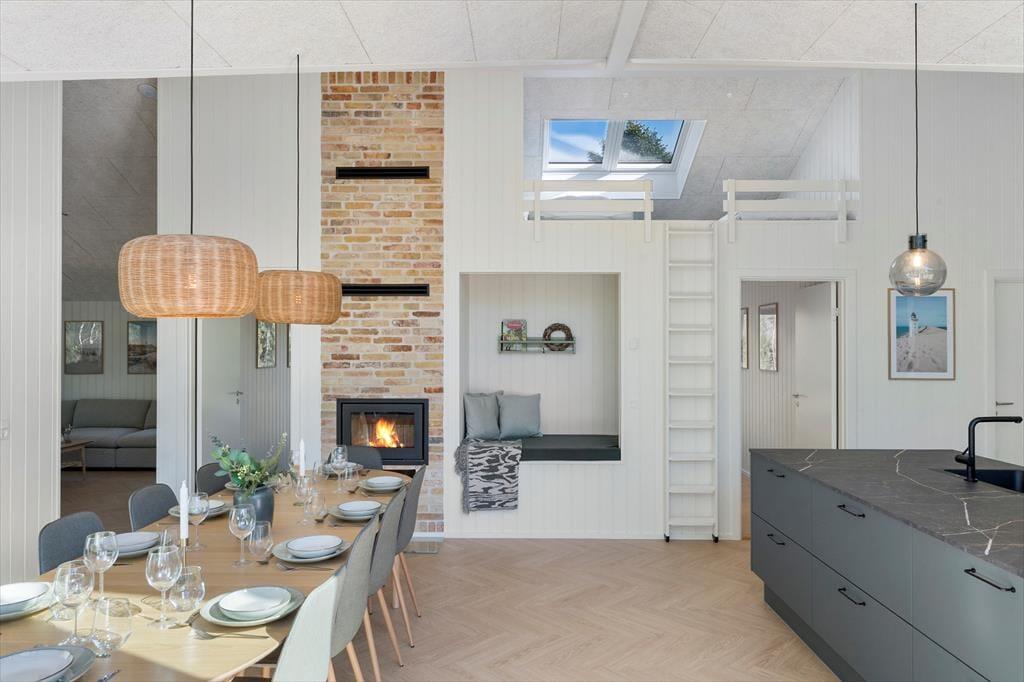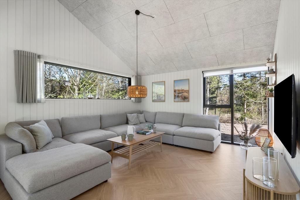 Das Ferienhaus ist mit Fokus auf Licht und Luft eingerichtet. Der offene Grundriss schafft eine einladende Atmosphäre, in der Wohnzimmer und Küchen-Esszimmer miteinander verschmelzen. Der Kaminofen sorgt an kühlen Abenden für Wärme und Gemütlichkeit, während die großen Fenster die Natur hereinlassen. Die gemütliche Alkove ist der perfekte Ort, um ein gutes Buch zu lesen oder eine ruhige Zeit zu genießen. Die vier Schlafzimmer sind mit Komfort im Sinn eingerichtet und bieten eine gute Nachtruhe.