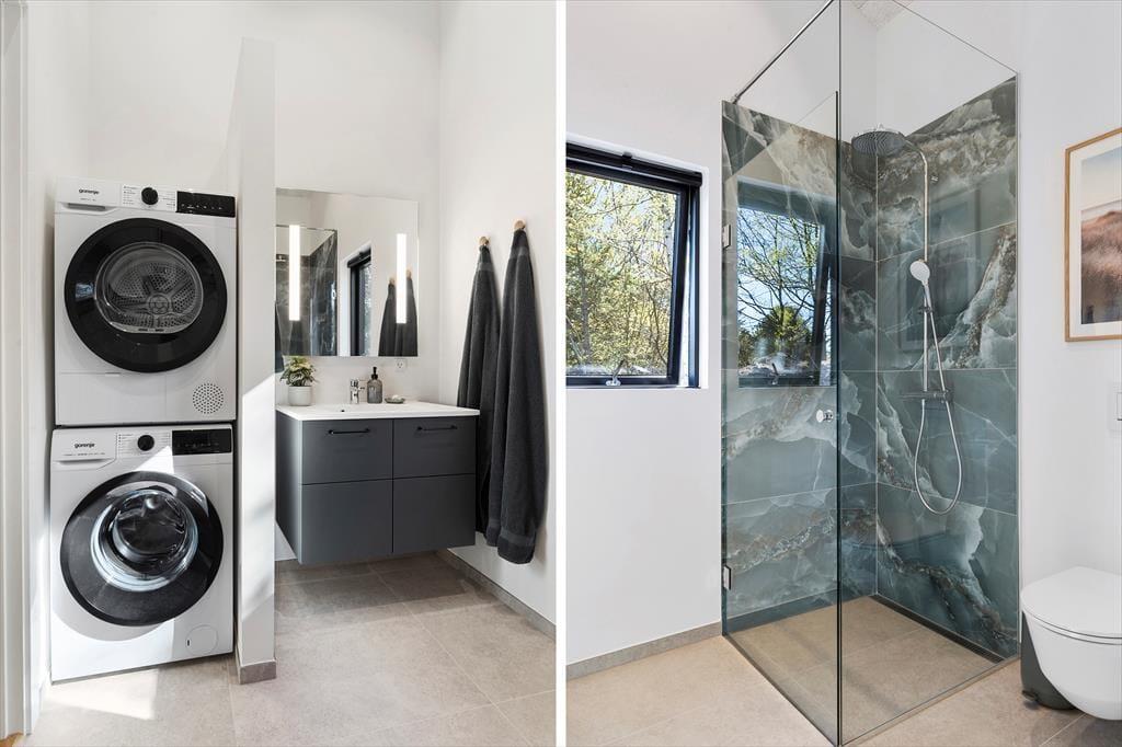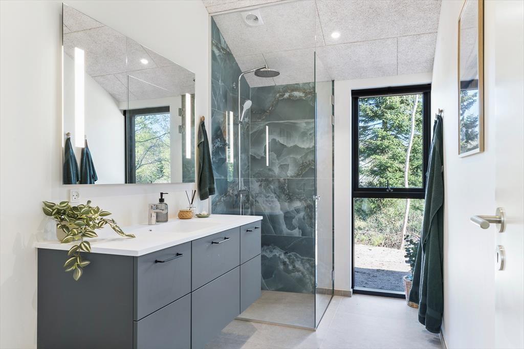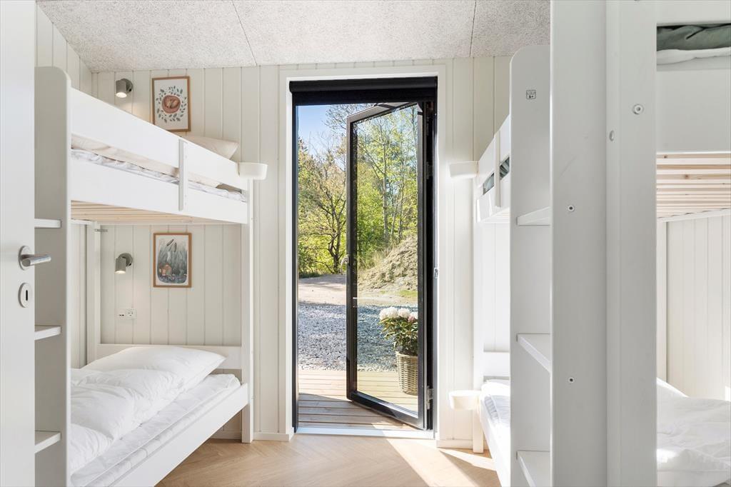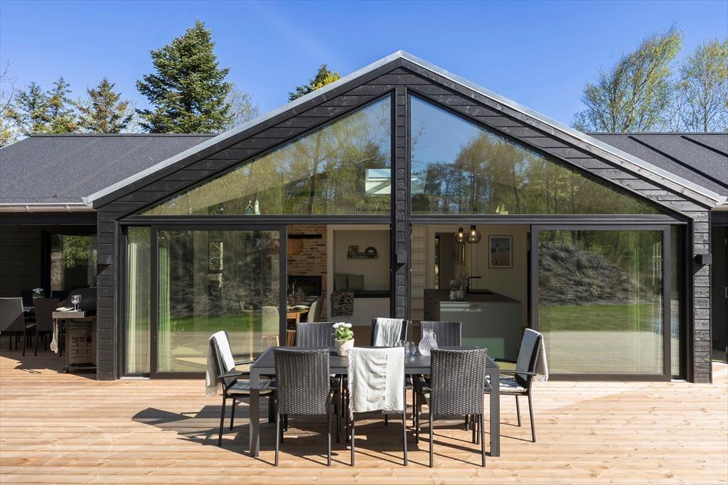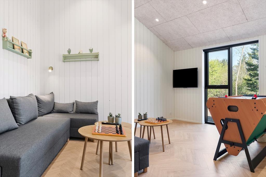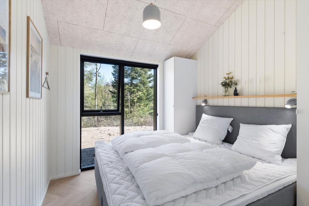 Das Ferienhaus ist mit Fokus auf Licht und Luft eingerichtet. Der offene Grundriss schafft eine einladende Atmosphäre, in der Wohnzimmer und Küchen-Esszimmer miteinander verschmelzen. Der Kaminofen sorgt an kühlen Abenden für Wärme und Gemütlichkeit, während die großen Fenster die Natur hereinlassen. Die gemütliche Alkove ist der perfekte Ort, um ein gutes Buch zu lesen oder eine ruhige Zeit zu genießen. Die vier Schlafzimmer sind mit Komfort im Sinn eingerichtet und bieten eine gute Nachtruhe.