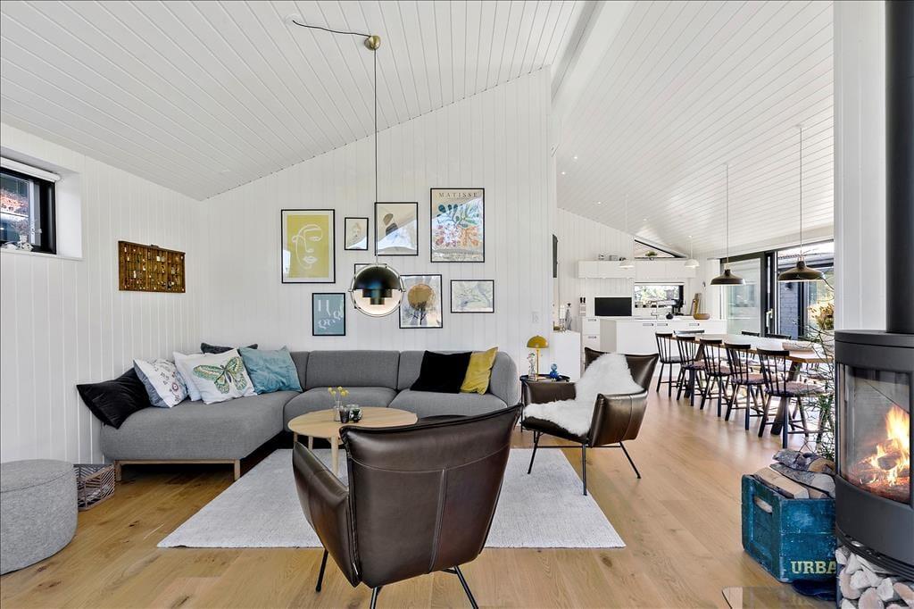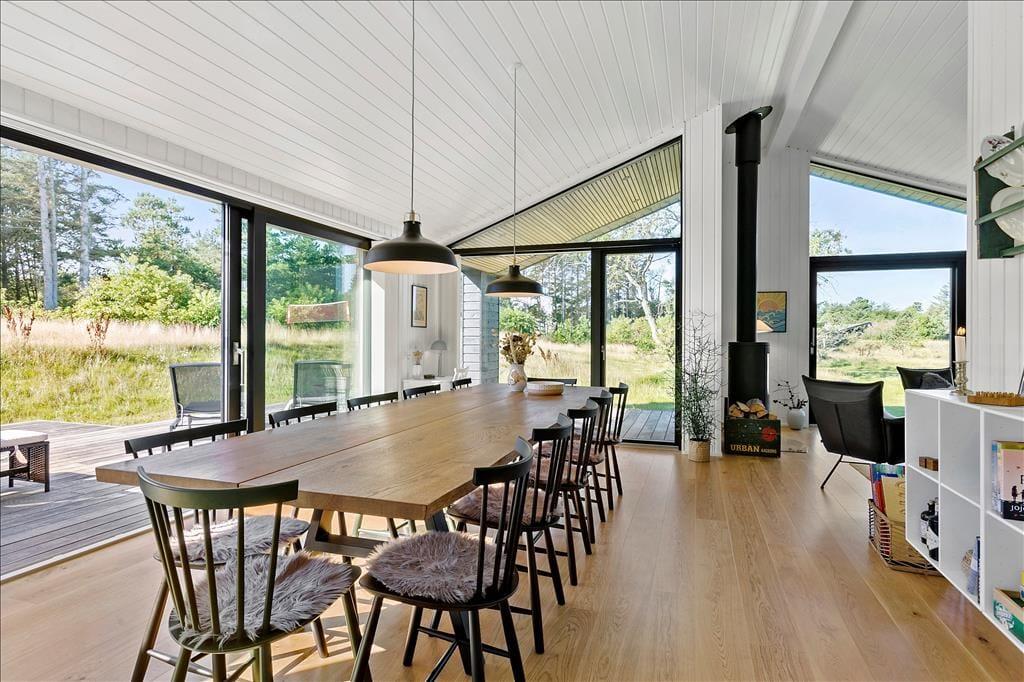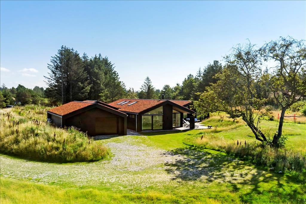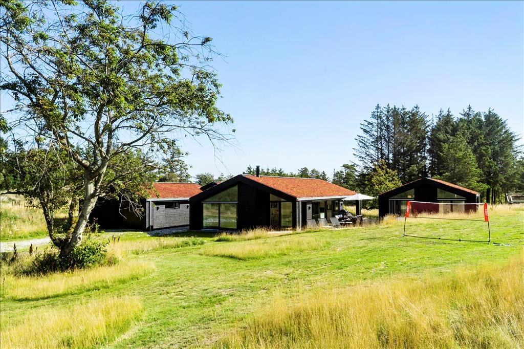 Das Ferienhaus imponiert schon beim ersten Hinsehen mit seiner stillsicheren Architektur und harmonischen Platzierung in der naturschönen Landschaft. Sie bekommen ein Haupthaus von 139 m2 und ein Nebengebäude von 53 m2, die durch Terrassenareale miteinander verbunden sind. Im Haupthaus herrscht eine helle und einladende Stimmung, und die grossen Fensterfronten sorgen zum einen für reichliche Mengen natürlichen Lichts und zum anderen für einen schönen Blick auf die vielfältige grüne Natur außerhalb des Hauses. Ein großer Küchen-/Aufenthaltsraum mit offenem Dachgeschoss bildet einen guten Rahmen für die gemeinsamen Mittage, und in Verlängerung hierzu finden Sie ein gemütliches Wohnzimmer mit Kaminofen. Von sowohl Aufenthaltsraum wie auch vom Wohnzimmer gibt es einen Ausgang zu Terrassen, welche natürlich mit den Aufenthaltsräumen verschmelzen. Im Haupthaus gibt es außerdem drei Schlafzimmer und ein Badezimmer, während das Nebengebäude über weitere drei Schlafzimmer und ein Badezimmer verfügt. Letztendlich muss der Aktivitätsraum im Nebengebäude mit Tischtennisplatte und eine Garage hervorgehoben werden.