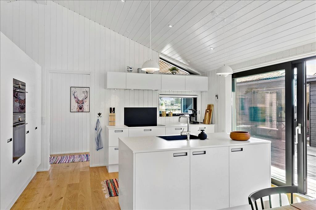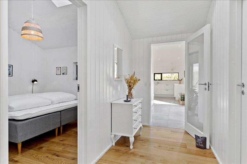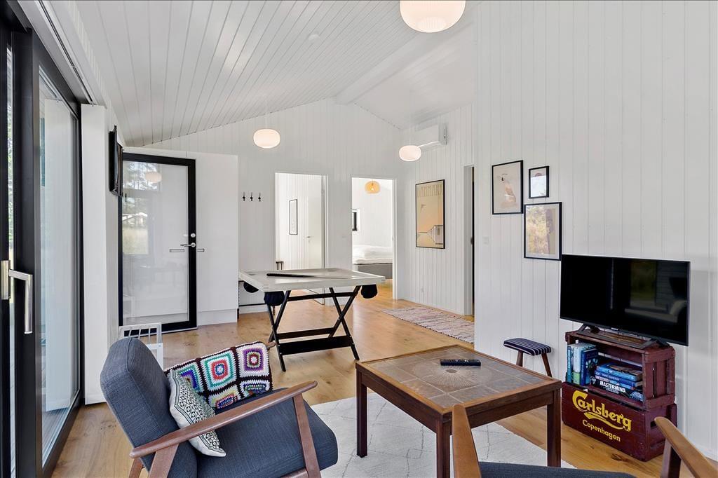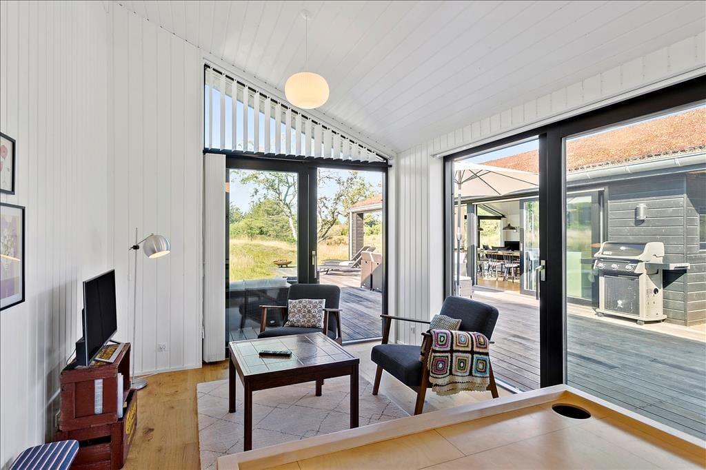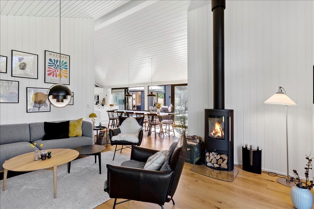 Das Ferienhaus imponiert schon beim ersten Hinsehen mit seiner stillsicheren Architektur und harmonischen Platzierung in der naturschönen Landschaft. Sie bekommen ein Haupthaus von 139 m2 und ein Nebengebäude von 53 m2, die durch Terrassenareale miteinander verbunden sind. Im Haupthaus herrscht eine helle und einladende Stimmung, und die grossen Fensterfronten sorgen zum einen für reichliche Mengen natürlichen Lichts und zum anderen für einen schönen Blick auf die vielfältige grüne Natur außerhalb des Hauses. Ein großer Küchen-/Aufenthaltsraum mit offenem Dachgeschoss bildet einen guten Rahmen für die gemeinsamen Mittage, und in Verlängerung hierzu finden Sie ein gemütliches Wohnzimmer mit Kaminofen. Von sowohl Aufenthaltsraum wie auch vom Wohnzimmer gibt es einen Ausgang zu Terrassen, welche natürlich mit den Aufenthaltsräumen verschmelzen. Im Haupthaus gibt es außerdem drei Schlafzimmer und ein Badezimmer, während das Nebengebäude über weitere drei Schlafzimmer und ein Badezimmer verfügt. Letztendlich muss der Aktivitätsraum im Nebengebäude mit Tischtennisplatte und eine Garage hervorgehoben werden.