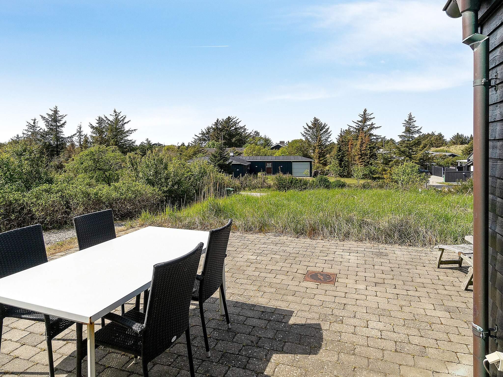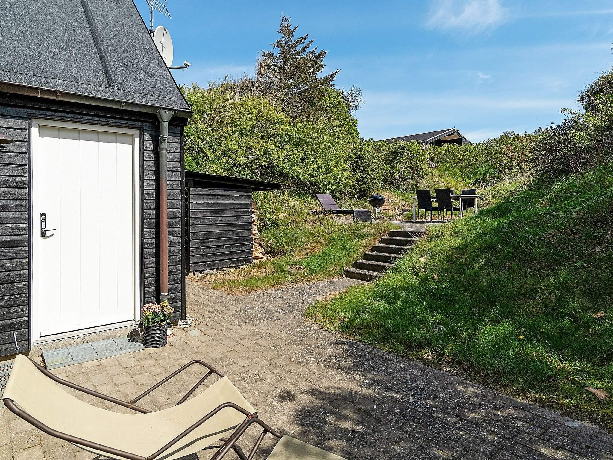 Im Außenbereich steht eine größere Terrassenfläche zur Verfügung, darunter auch eine gänzlich abgeschirmte Ostterrasse hinter dem Haus. Genießen Sie die Sonnentage oder Grillabende draußen an der frischen Luft und dennoch gut geschützt vor der Meeresbrise. Das Ferienhaus liegt auf einem hügeligen Naturgrundtück, das je nach Wunsch und Tageszeit Sonne oder Schatten bietet.