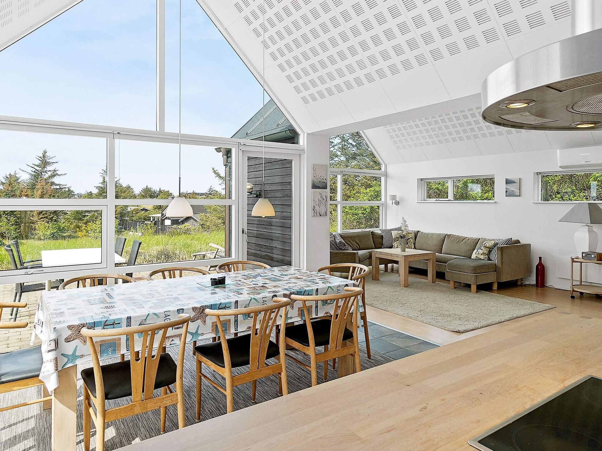 Das moderne Ferienhaus hat einen hellen Küchen-/Wohnbereich für das Familienleben, mit Zugang zur Terrasse davor. Die Küche ist zeitgemäß ausgestattet und bietet ebenso wie der Essbereich davor herrlichen Ausblick in die grüne Umgebung. Die offene Zimmerdecke bis zum First und die großen Fensterflächen sorgen im ganzen Raum für ein luftiges und lichtdurchflutetes Wohnambiente. Im Wohnbereich steht eine gemütliche Sitzecke bereit. Zudem gibt es einen Holzofen für kühlere Tage sowie WLAN und einige deutsche TV-Sender im Haus.