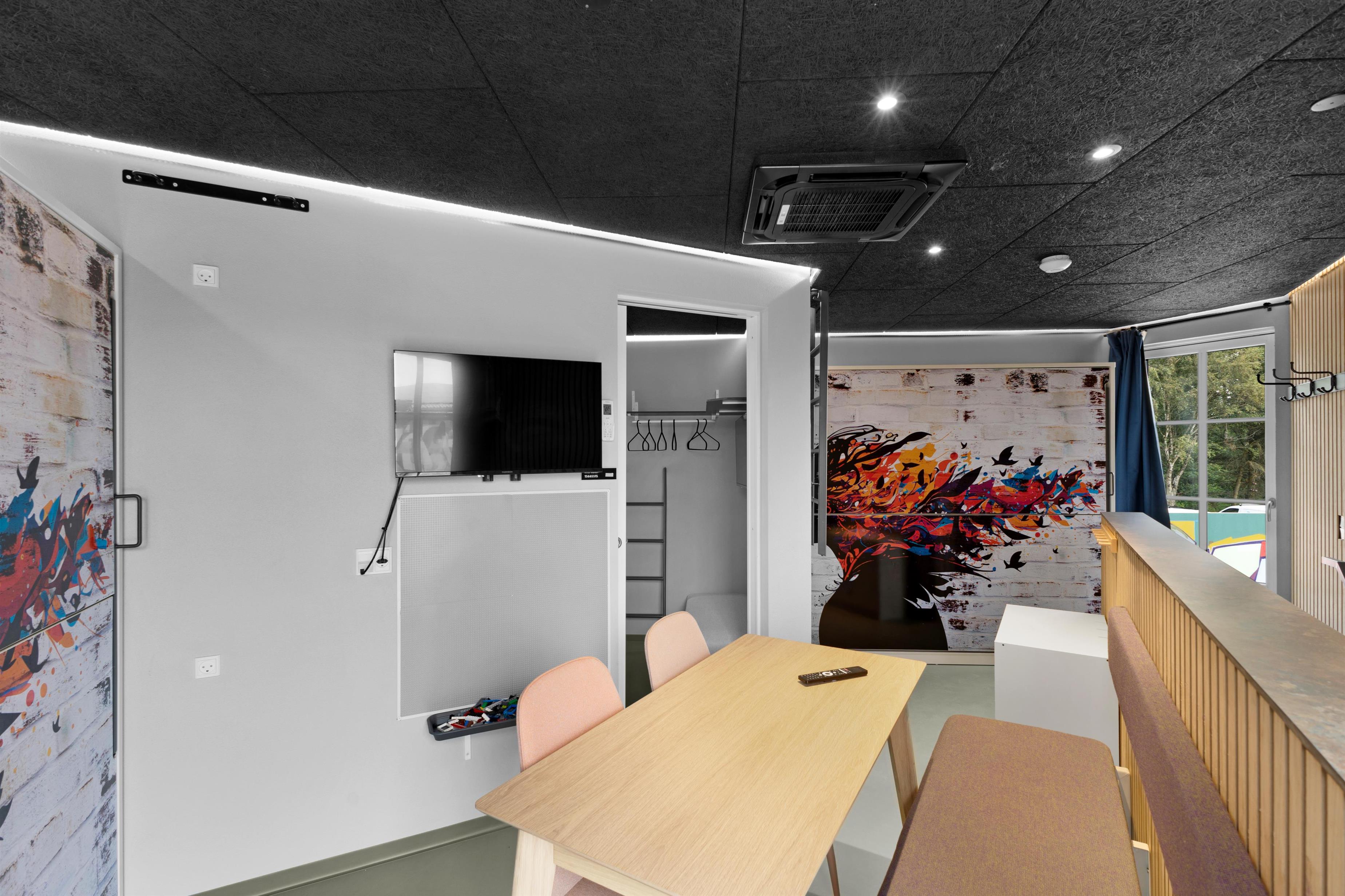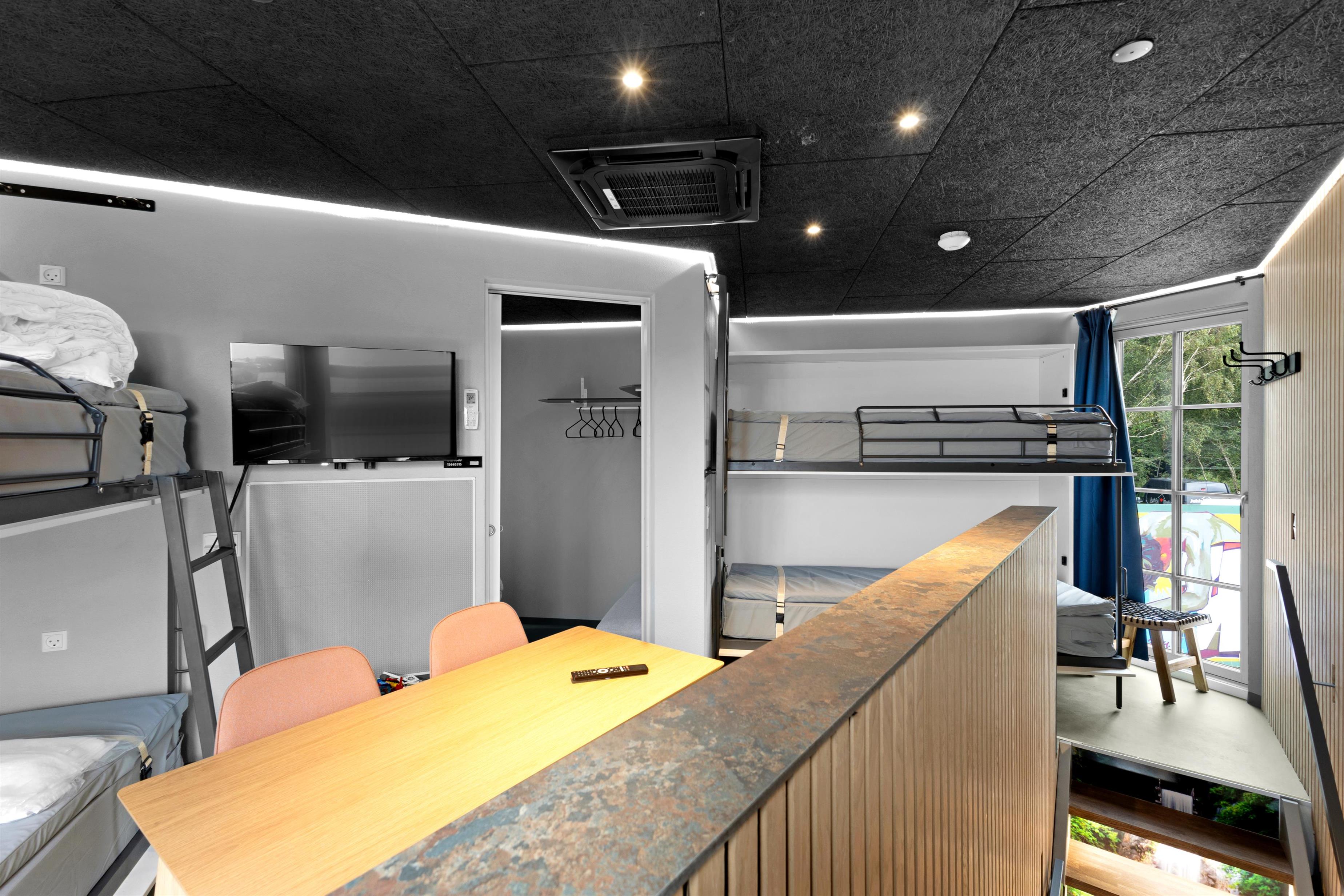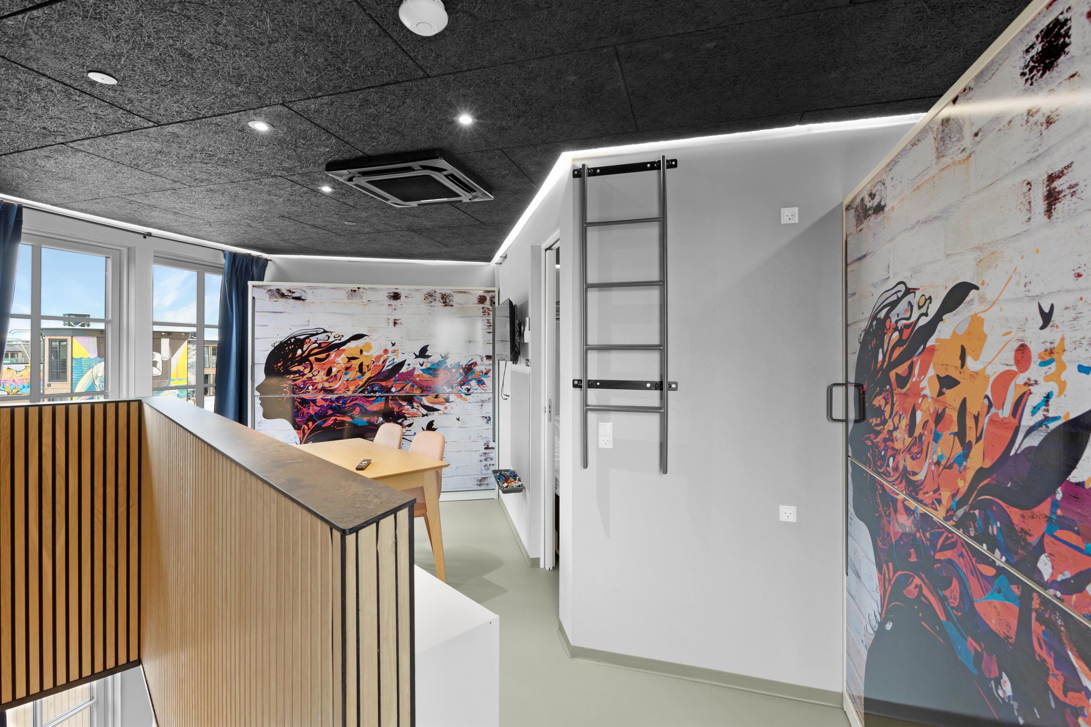 Die Hotelapartments bieten Platz für 6 Gäste mit vier Etagenbetten und einem Doppelbett – alle Schlafplätze befinden sich im ersten Stock. Wenn Sie weniger Personen sind, können Sie die Etagenbetten in die Wände einklappen, was den Raum besonders praktisch macht und ihm einen coolen Stil verleiht. Jeder Quadratmeter erfüllt eine bestimmte Funktion, und hier finden Sie alles, was Sie für eine Übernachtung in der Nähe von Blokhus benötigen, mitten in einer künstlerischen Erlebniswelt.