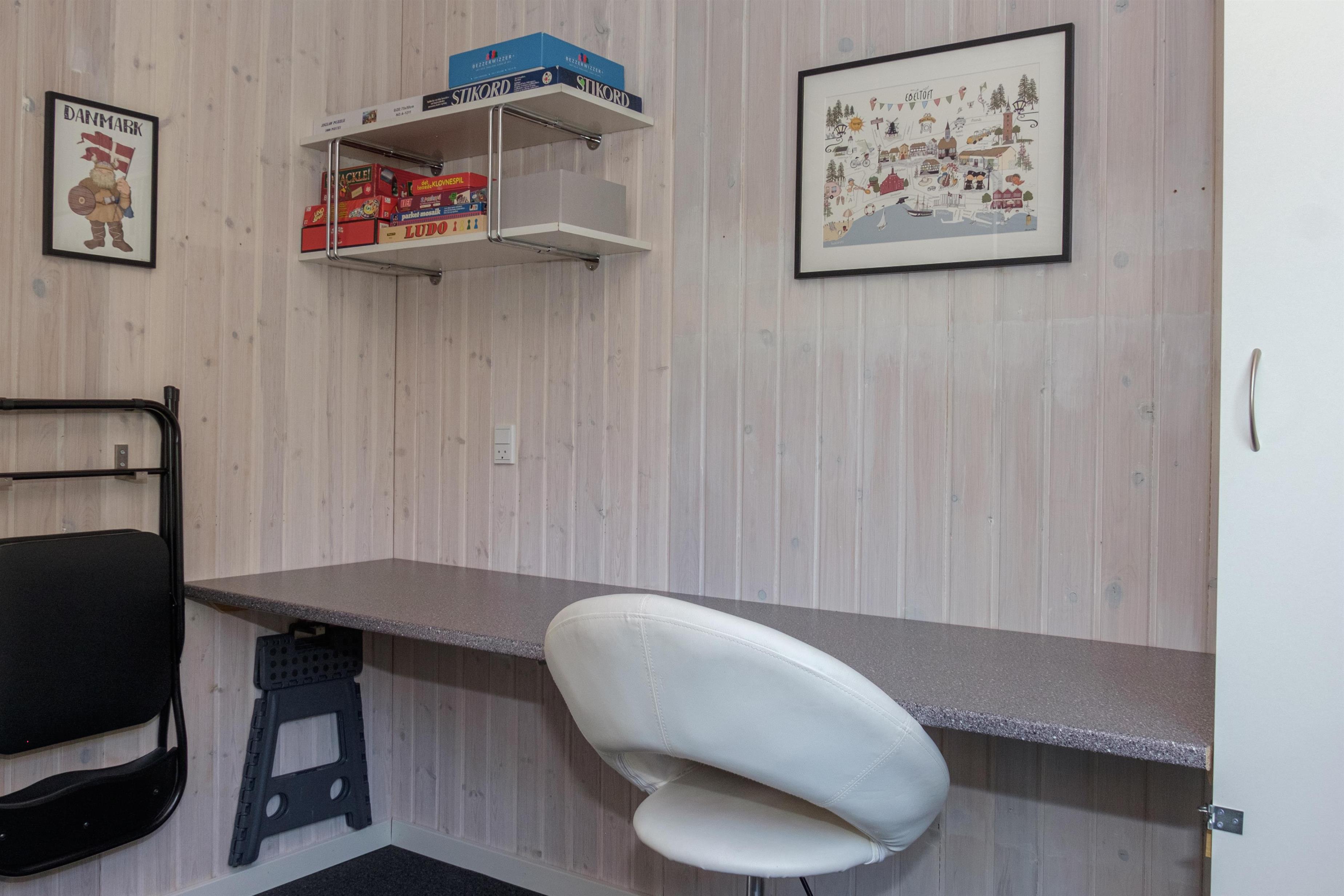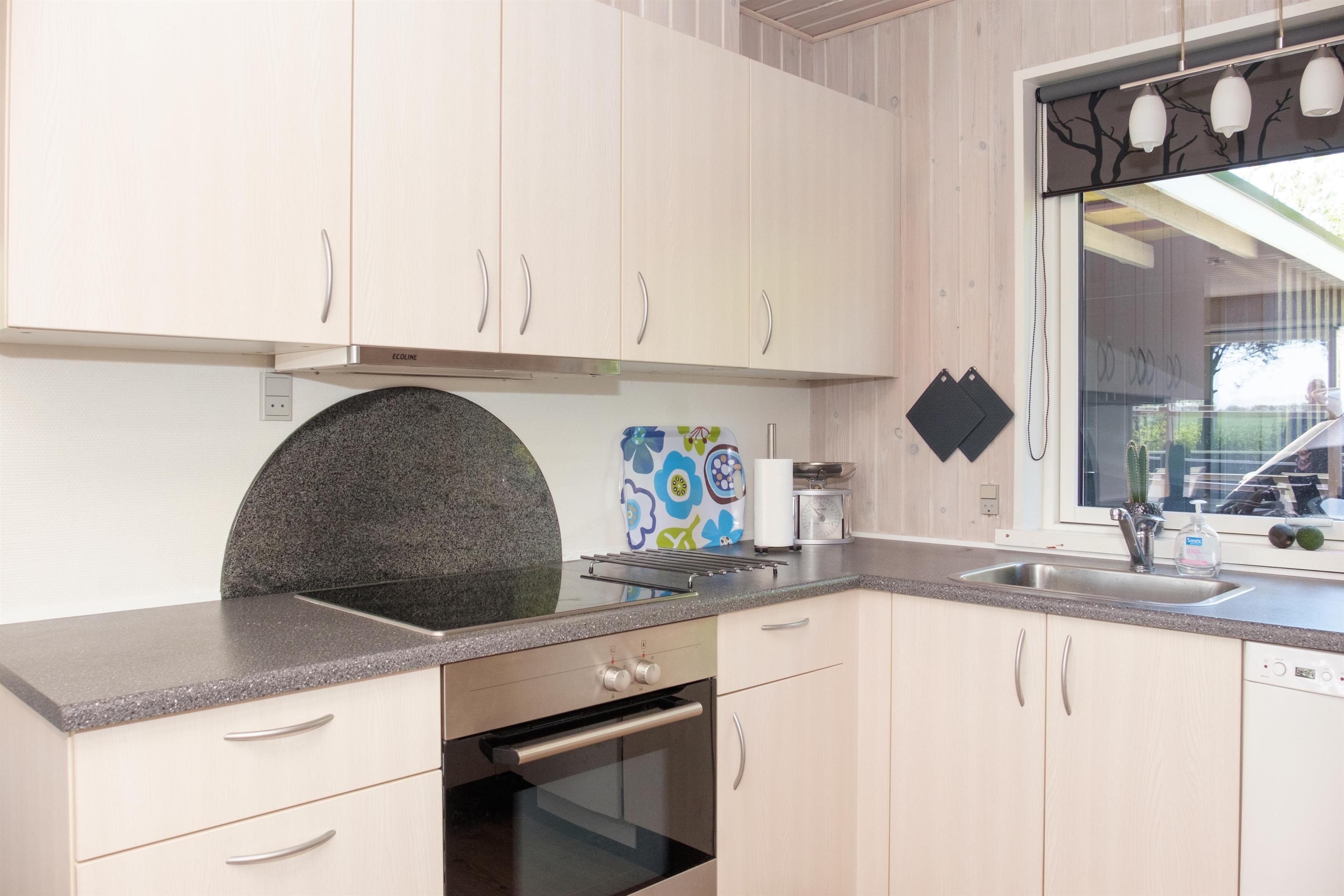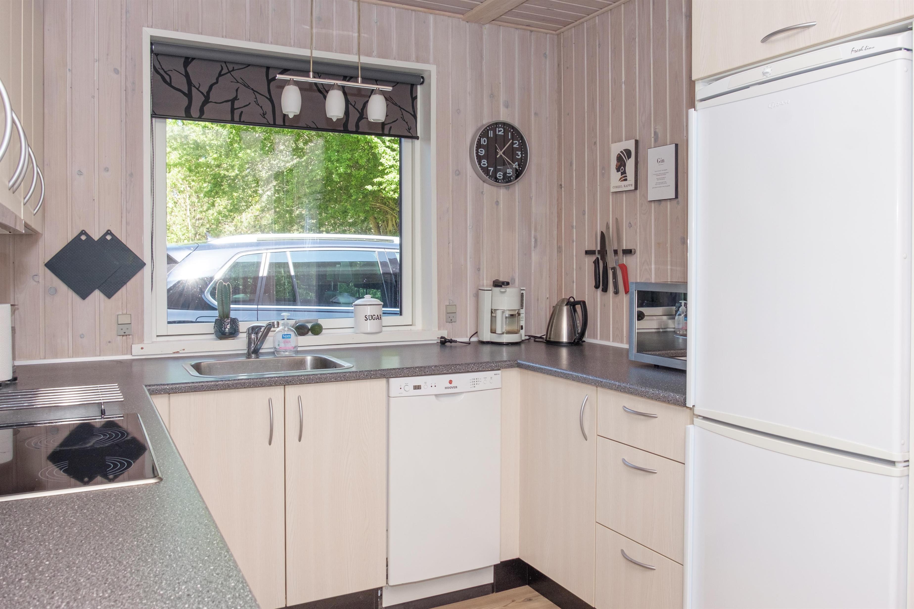 Helles und einladendes Wohnzimmer mit weiß patinierten Wänden und Decke in offener Verbindung zur neueren, gut ausgestatteten Küche. Es ist mit einem bequemen Sofabereich, Essplatz für sechs Personen sowie TV mit dänischen (inkl. TV2) und deutschen Programmen eingerichtet. Geräumige Küche mit Glaskeramik-Kochfeld, Backofen, Kühl-/Gefrierkombination, Geschirrspüler und Mikrowelle. Die insgesamt sechs Schlafplätze verteilen sich auf ein Schlafzimmer mit zwei Einzelbetten, ein Zimmer mit französischem Bett sowie ein Zimmer im Nebengebäude mit zwei Einzelbetten. Hübsches Badezimmer mit Dusche. Eingangsbereich mit Waschmaschine. Internetzugang.