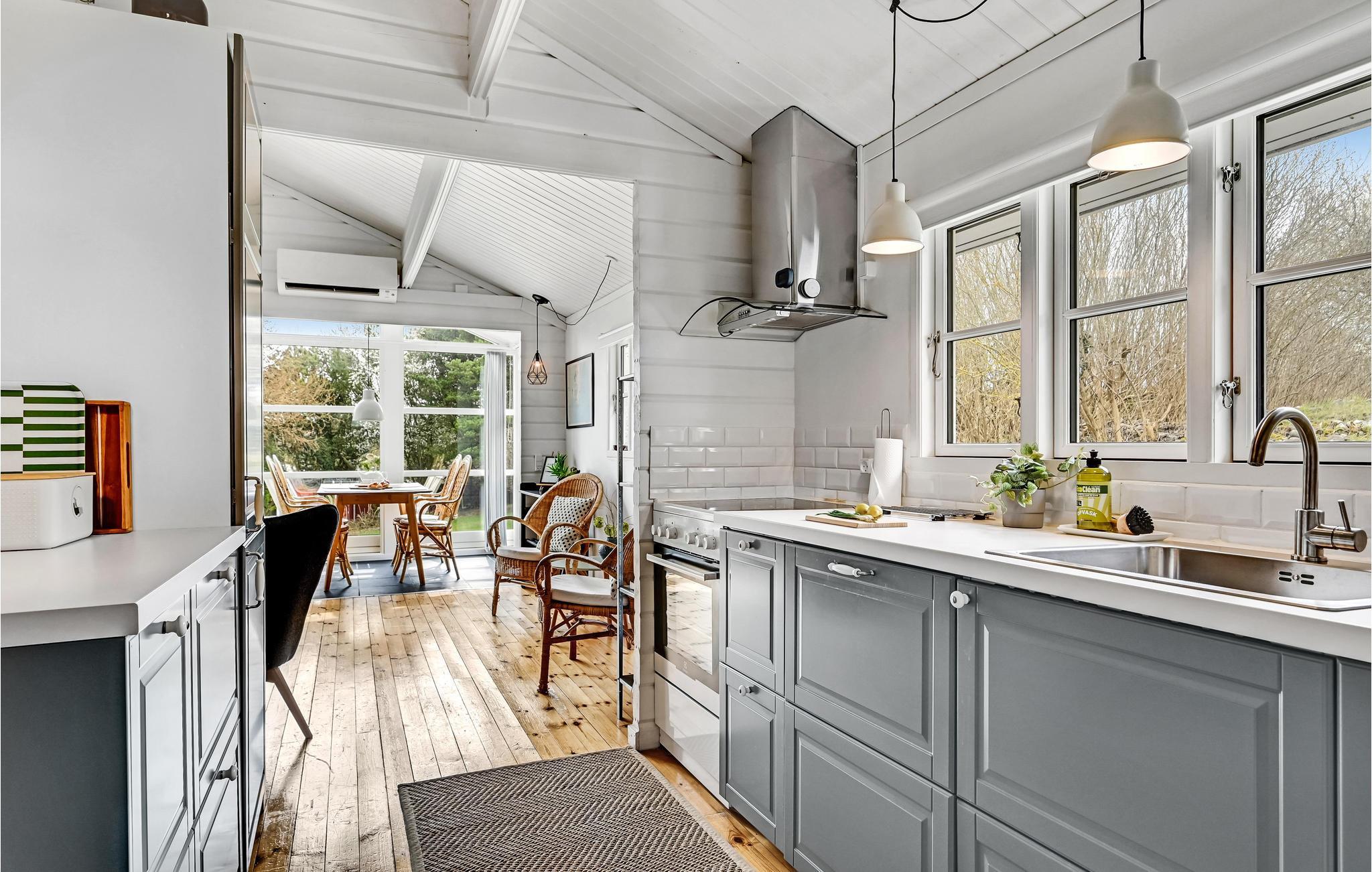 Zwischen der sehenswerten Stadt Ebeltoft und dem gemütlichen Ort Boeslum, und nah am anspruchsvollen Golfplatz des Ebeltoft Golf Clubs finden Sie dieses schöne Ferienhaus. In nur 5 Autominuten erreichen Sie schon den Strand oder Ebeltoft. Das hübsche Blockhaus wurde vollkommen renoviert und zu einer modernen, hellen und einladenden Bleibe umgewandelt. Die Terrasse ermöglicht Ihnen eine Aussicht auf die Umgebung und in der Ferne, am Horizont sehen Sie ein wenig vom Meer. Ein deutscher Fernsehsender (ZDF) ist vorhanden, und in den kühleren Jahreszeiten können Sie sich vorm Kaminofen schön wärmen, zudem sind Wintergarten und Wohnzimmer durch eine behagliche Fußbodenheizung besonders gemütlich. Die Küche ist brandneu und bestens ausgestattet.
