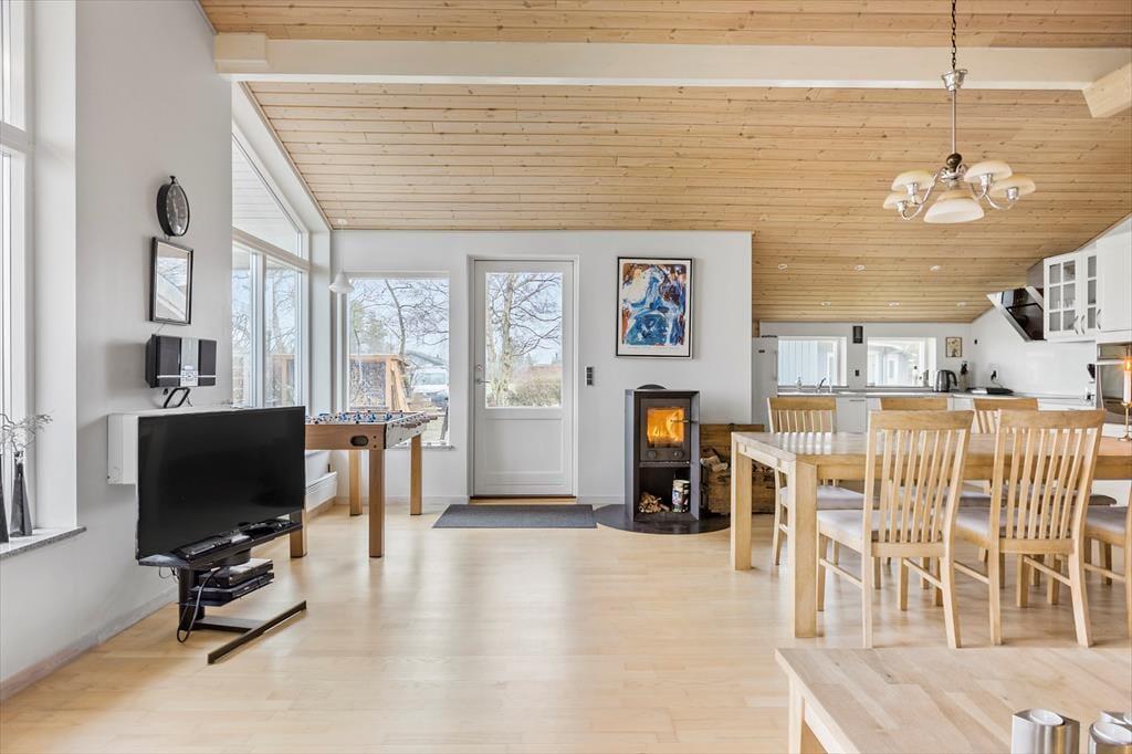 Vom Eingangsbereich gelangen Sie durch einen Flur in den großen, gemütlichen und angenehm hellen Aufenthaltsraum, der unter anderem über einen Essbereich, eine Wärmepumpe, einen Kaminofen und einen Zugang auf die umzäunte Terrasse verfügt. Im Wohnzimmer blicken Sie in Richtung Wasser. Spaß und Unterhaltung verspricht der Tischkicker.