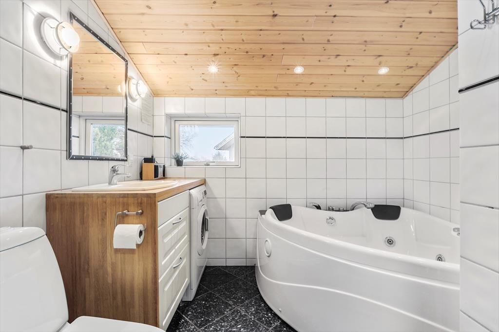 Das große, schöne Badezimmer umfasst ein WC, ein Waschbecken, eine Duschnische, einen Whirlpool und eine Waschmaschine.