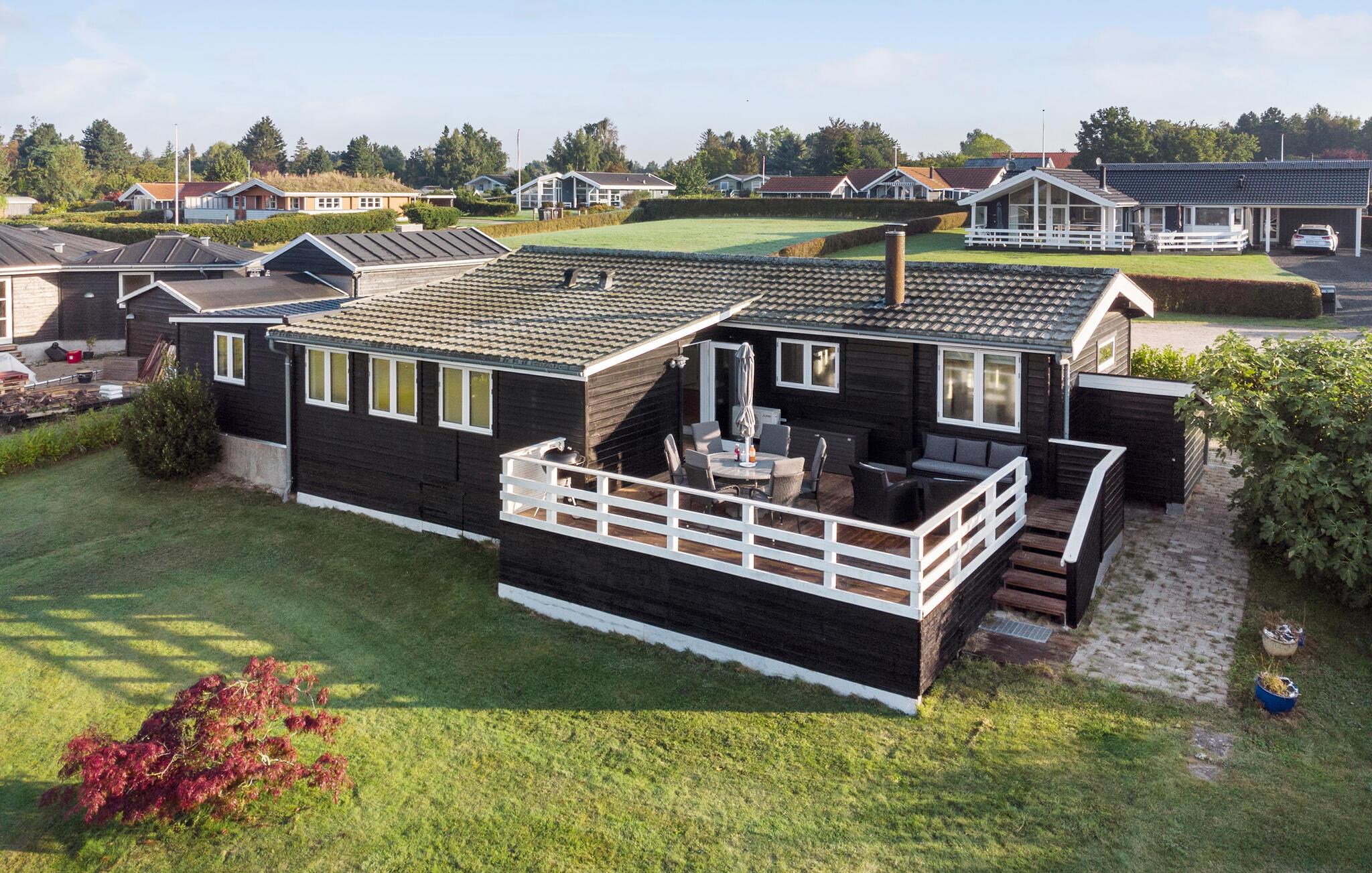 Gemütliches Ferienhaus in Bogø mit Kamin, Terrasse und Meerblick für entspannte Urlaubstage.