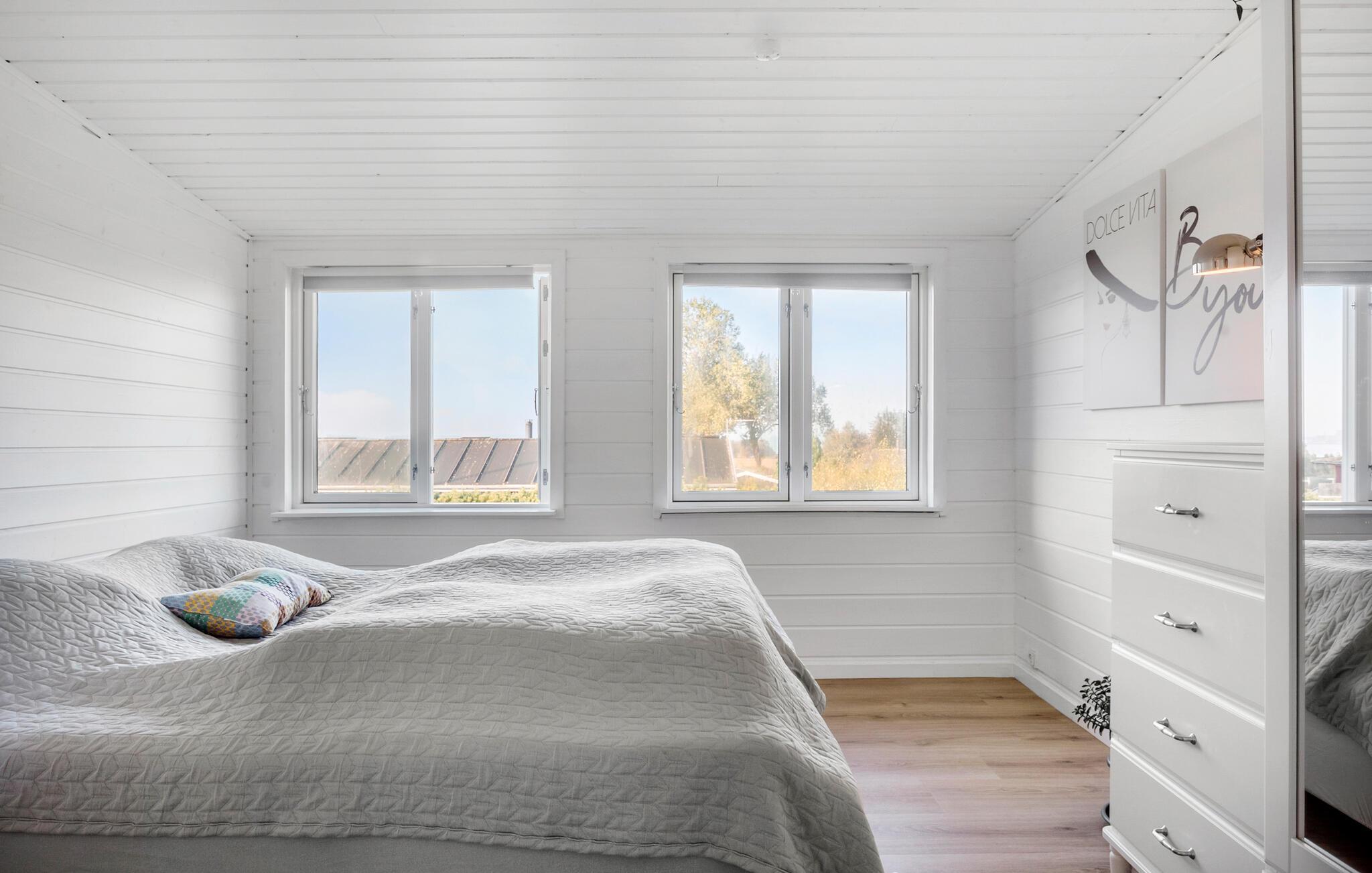 Verbringen Sie Ihren Urlaub in einem ruhigen Ferienhausgebiet nahe dem Fjord. Machen Sie es sich mit Ihren Lieben in den hellen Räumen des Ferienhauses gemütlich. Die geschmackvolle Einrichtung und dezente Farben schaffen eine ruhige Atmosphäre, in der Sie fantastisch entspannen können. Die bequeme Sofaecke lädt nach aktiven Tagen zu langen Abenden im Wohnbereich ein. Plaudern Sie bis spät beim behaglichen Knistern der Flammen im Kaminofen. Treten Sie gleich morgens auf die Terrasse, lassen Sie beim ersten Kaffee den Blick über die Felder und den Fjord schweifen und genießen Sie beim Zwitschern der Vögel die ersten Sonnenstrahlen.