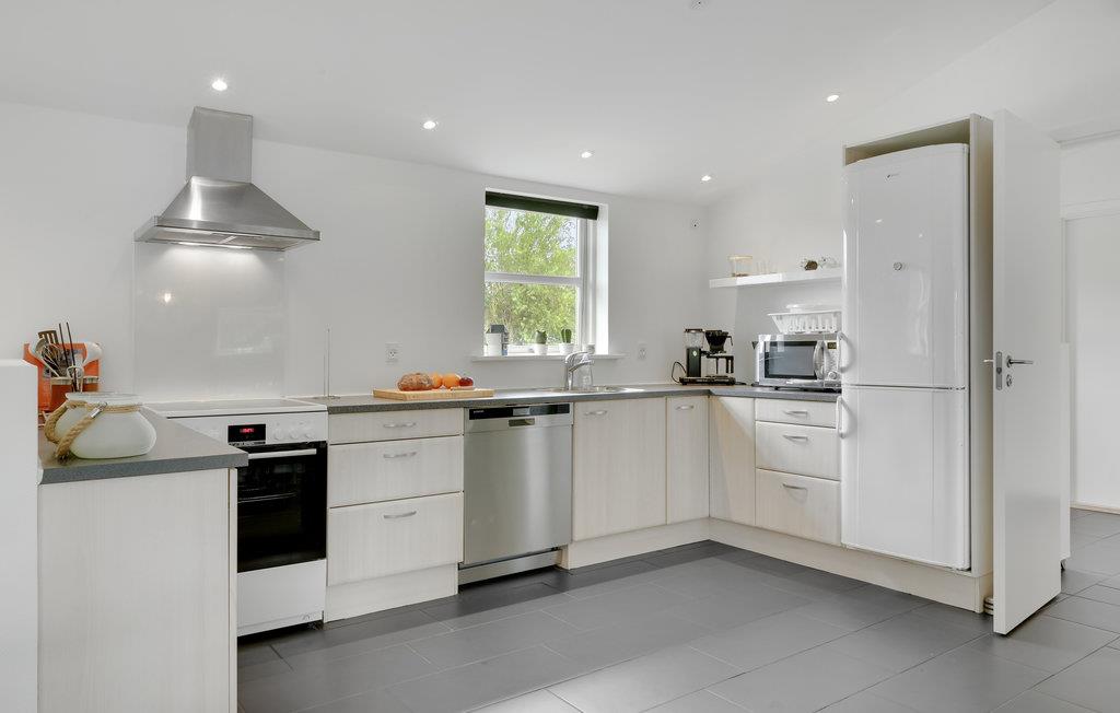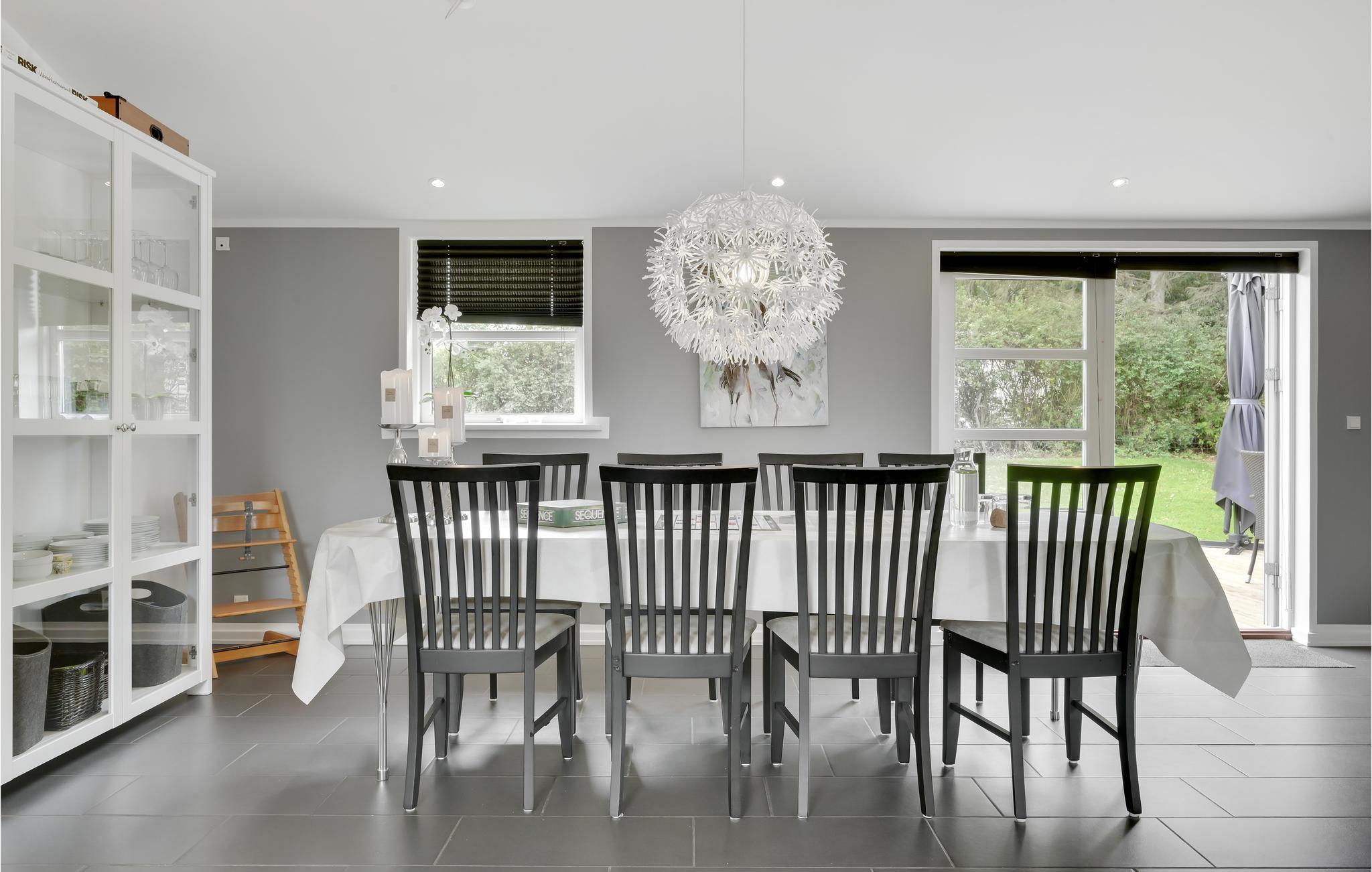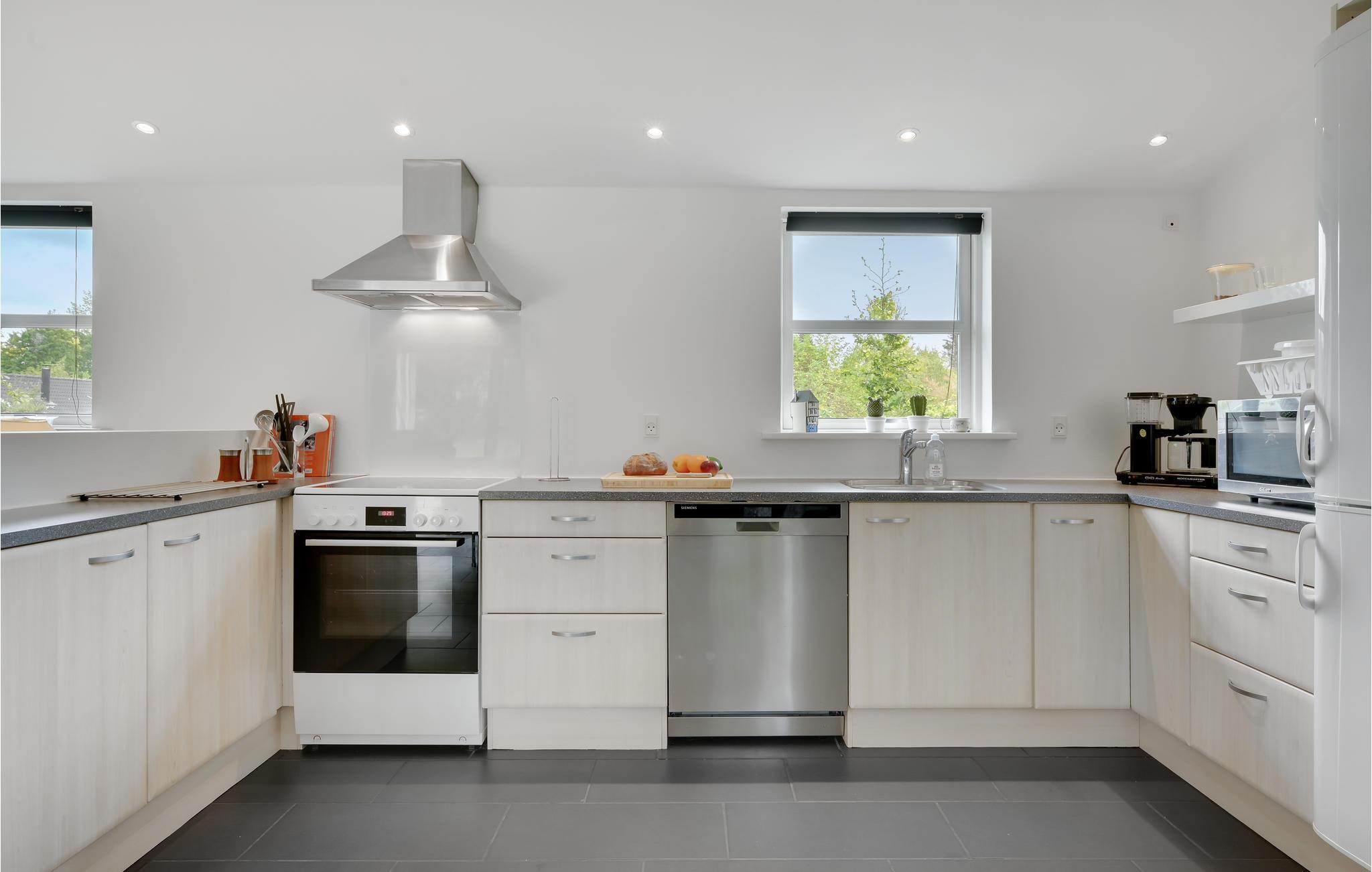 Helles Ferienhaus auf Bogø mit großer Terrasse und offener Küche, ideal für aktive Familien und Naturliebhaber.