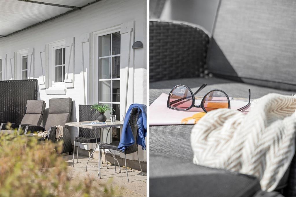 Draußen erwartet Sie eine gemütliche Terrasse, auf der Sie sich mit einem guten Buch entspannen oder eine Mahlzeit im Freien genießen können. Die private Terrasse eignet sich perfekt für sowohl Frühstück als auch Abendessen, während Sie die frische Luft und die ruhige, grüne Umgebung genießen. Hier haben auch Kinder viel Platz zum Spielen, während Sie eine ruhige Auszeit genießen. Von der Ferienwohnung aus sind es nur wenige Gehminuten zum nahegelegenen Badestrand, wo Sie Ihre Füße im klaren Wasser eintauchen, ein erfrischendes Bad nehmen oder mit der Familie Sandburgen bauen können. Die Nähe zum Strand ermöglicht es Ihnen, den Tag mit Sonne, Sand und Meer direkt vor der Tür zu verbringen.