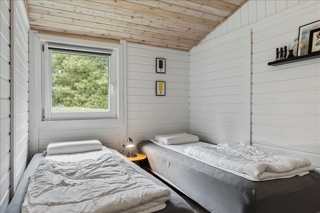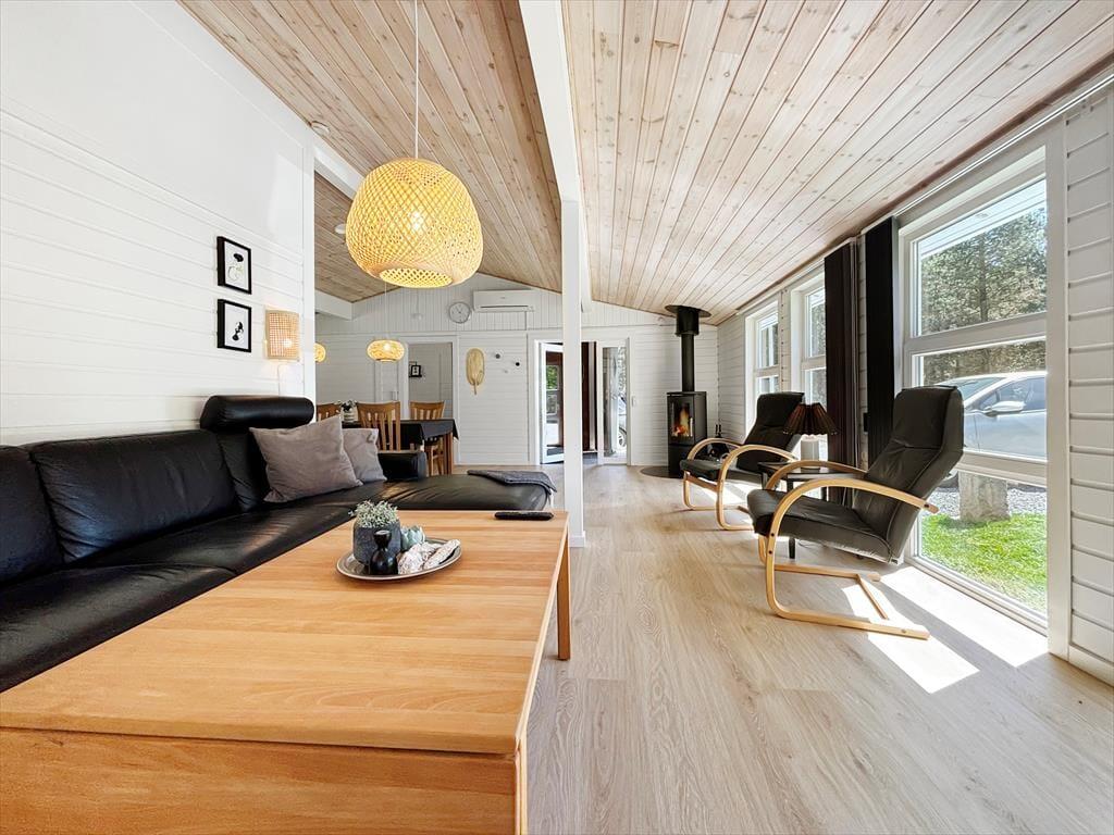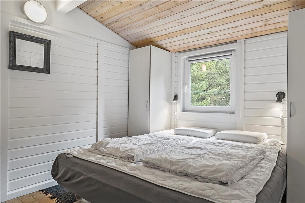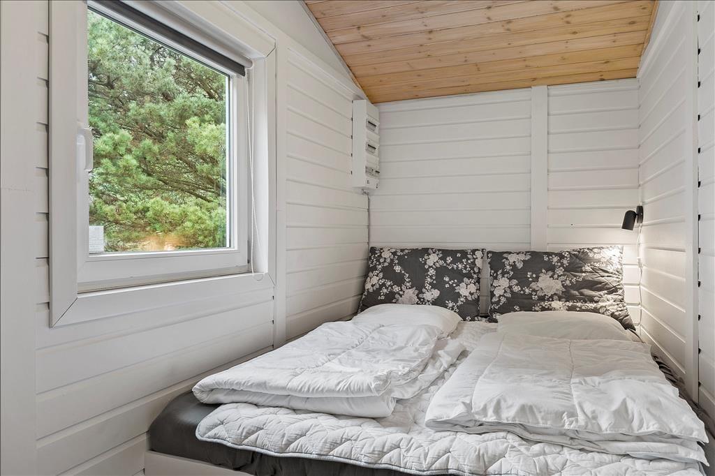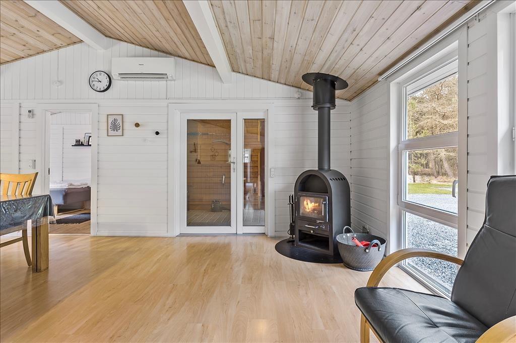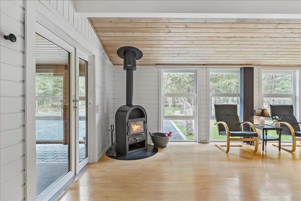 Das Ferienhaus liegt völlig ungestört zwischen den Tannen des Naturgrundstücks, sodass es sich fast so anfühlt, als würdest du im Wald wohnen. Dies bedeutet ebenfalls, dass du eine schöne, grüne Aussicht hast, wenn du es dir drinnen gemütlich machst – und wenn du die Fenster oder die Terrassentür öffnest, kannst du das Zwitschern der Vögel in den Baumwipfeln und den Duft der Nadelbäume genießen.