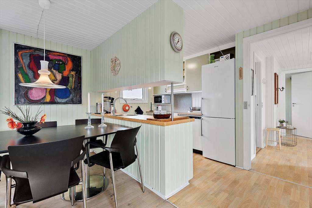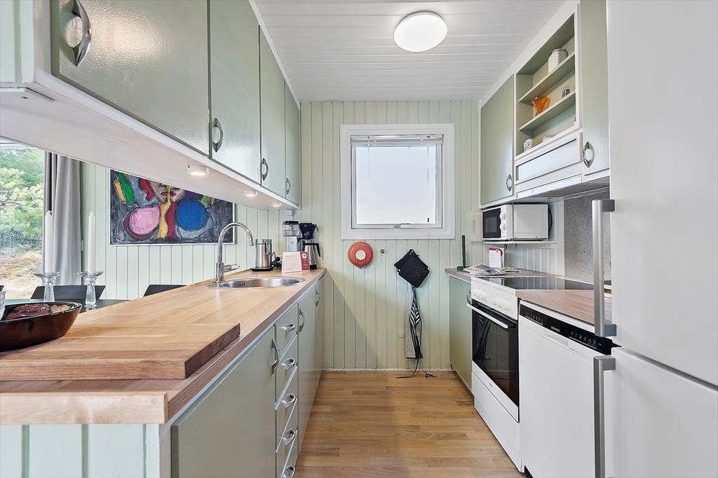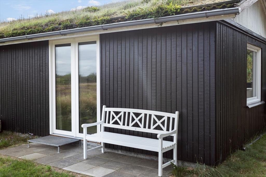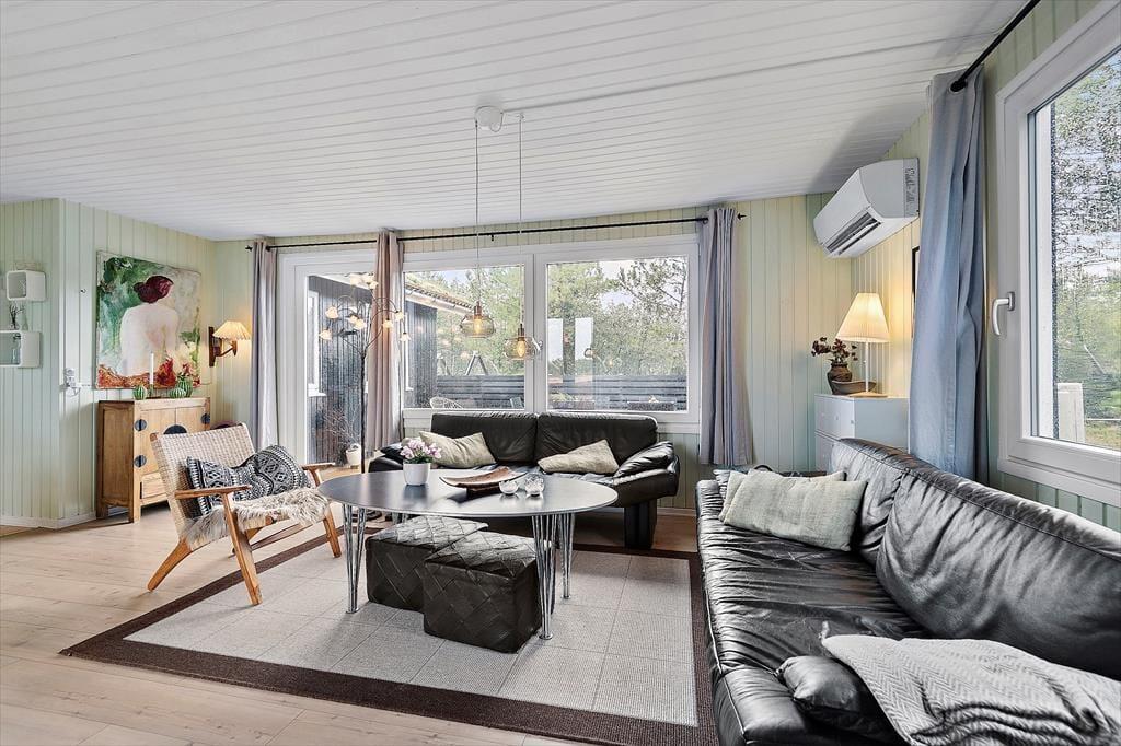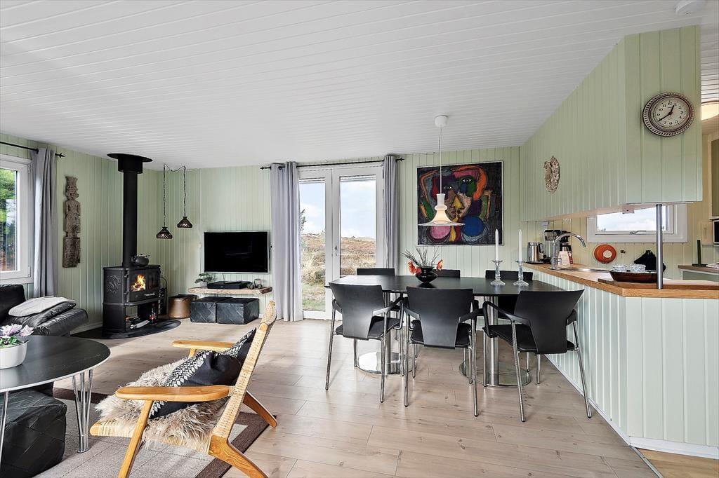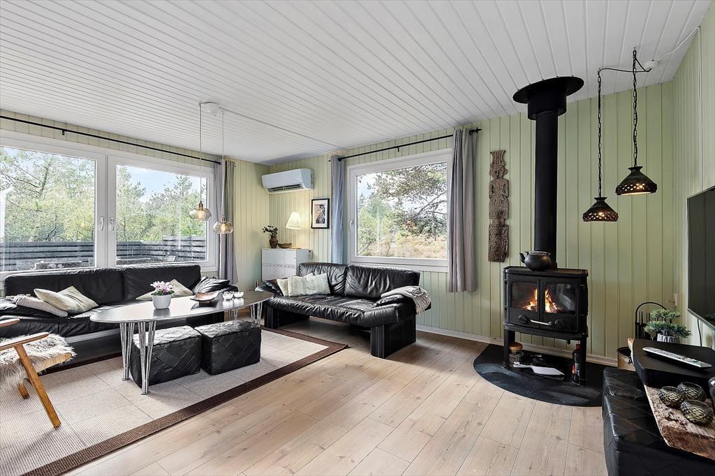 Eines der reizenden Details des Ferienhauses ist das grüne Dach, welches das Haus förmlich mit der umliegenden Natur zusammenschmelzen lässt. Im Inneren herrscht ebenfalls eine angenehme Atmosphäre mit weißer Holzvertäfelung und Brennofen, ganz nach typischer Ferienhausmanier. Eine Sauna gehört auch mit zur Einrichtung, und von der Küche, dem Wohnbereich und einem der drei Schlafzimmer kannst du die schöne Aussicht über die Heidelandschaft genießen. Die Küche ist mit dem Wohnraum kombiniert, wo du dich in den bequemen Möbeln gemütlich machen und dich auf einen schönen Nachmittag mit Gesellschaftsspielen und Snacks am Esstisch vorbereiten kannst. Das Haus verfügt sowohl über ein Badezimmer als auch über eine Gästetoilette mit Waschmaschine.