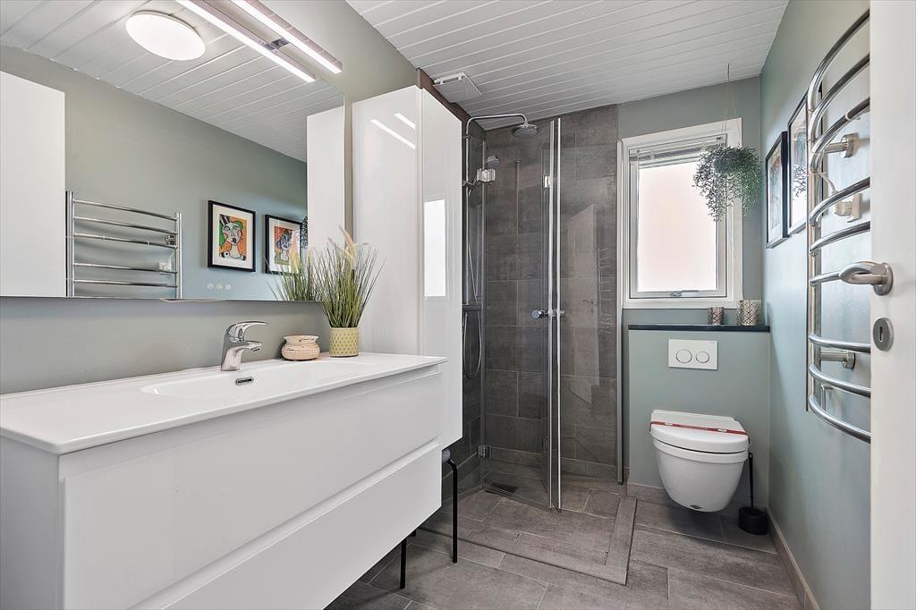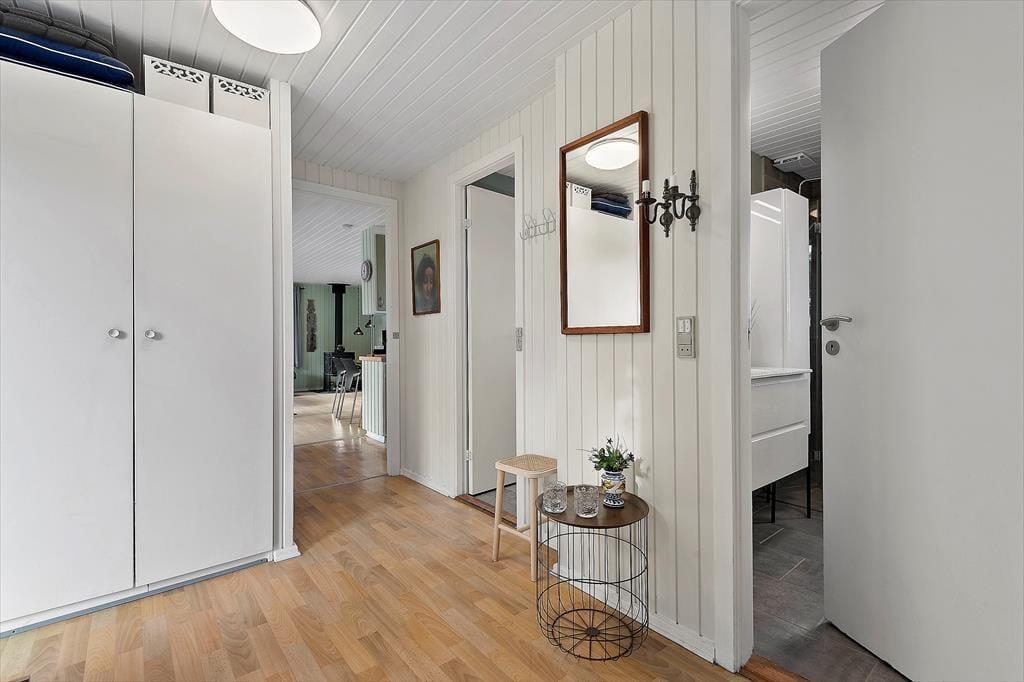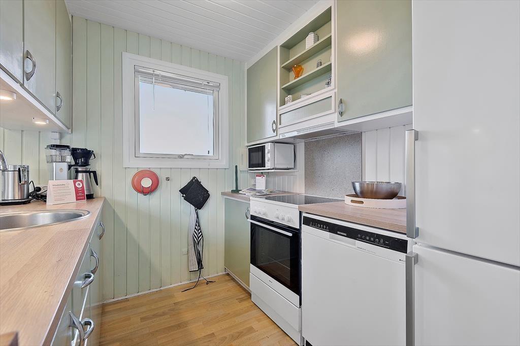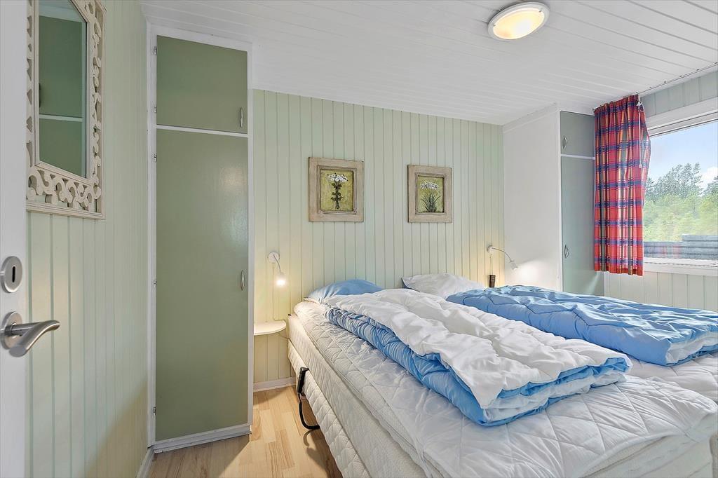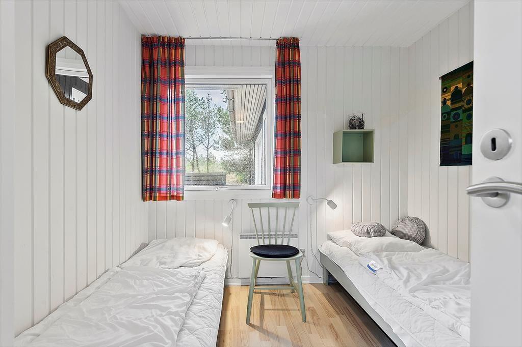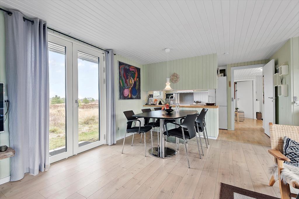 Eines der reizenden Details des Ferienhauses ist das grüne Dach, welches das Haus förmlich mit der umliegenden Natur zusammenschmelzen lässt. Im Inneren herrscht ebenfalls eine angenehme Atmosphäre mit weißer Holzvertäfelung und Brennofen, ganz nach typischer Ferienhausmanier. Eine Sauna gehört auch mit zur Einrichtung, und von der Küche, dem Wohnbereich und einem der drei Schlafzimmer kannst du die schöne Aussicht über die Heidelandschaft genießen. Die Küche ist mit dem Wohnraum kombiniert, wo du dich in den bequemen Möbeln gemütlich machen und dich auf einen schönen Nachmittag mit Gesellschaftsspielen und Snacks am Esstisch vorbereiten kannst. Das Haus verfügt sowohl über ein Badezimmer als auch über eine Gästetoilette mit Waschmaschine.
