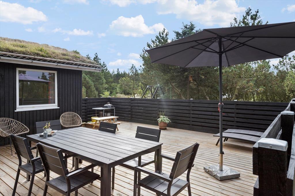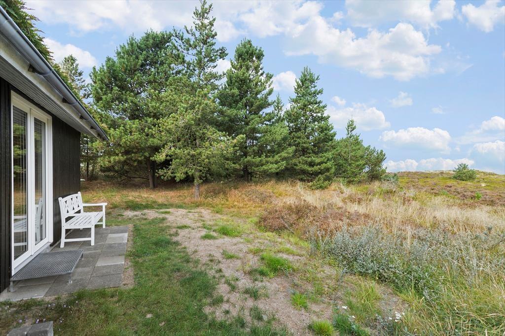 Nördlich vom Ferienhaus eröffnet sich eine weite Landschaft, während die Kiefern auf dem Naturgrundstück zu den anderen Seiten für Sichtschutz zu den Nachbargrundstücken sorgen. Das bedeutet, dass du dich ungestört auf den zwei sonnenreichen Südterrassen aufhalten kannst. Für die jüngsten Gäste stehen eine Schaukel und ein Sandkasten zur Verfügung, während sich die ganze Familie darauf freuen kann, zu grillen und sich in den bequemen Gartenmöbeln zu entspannen.