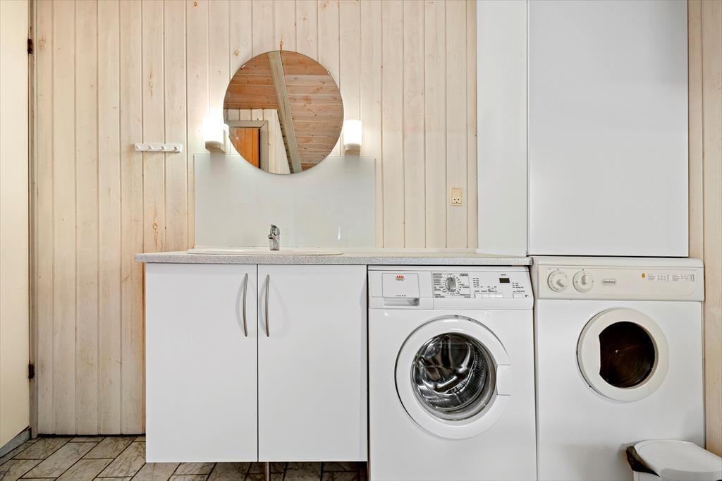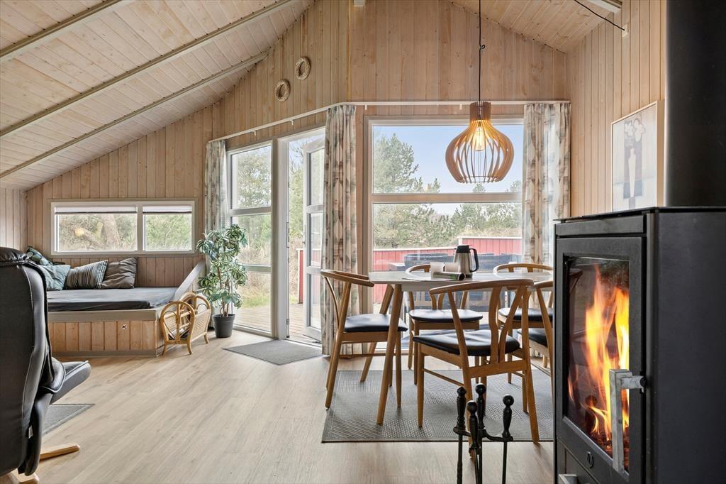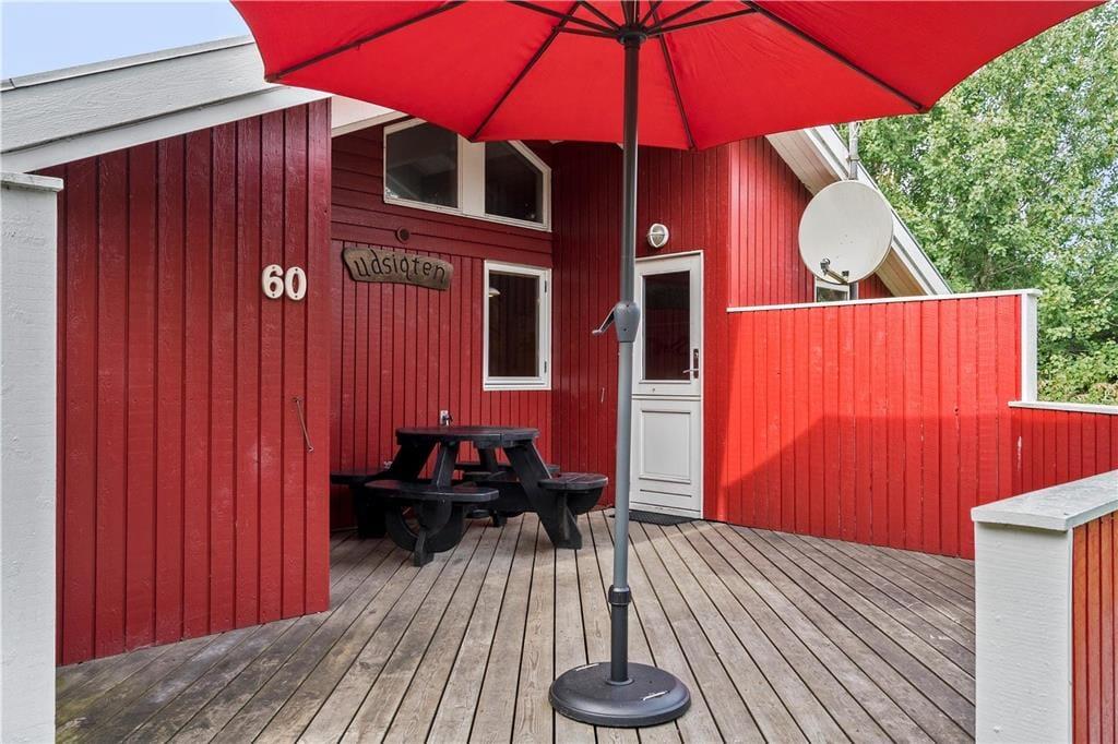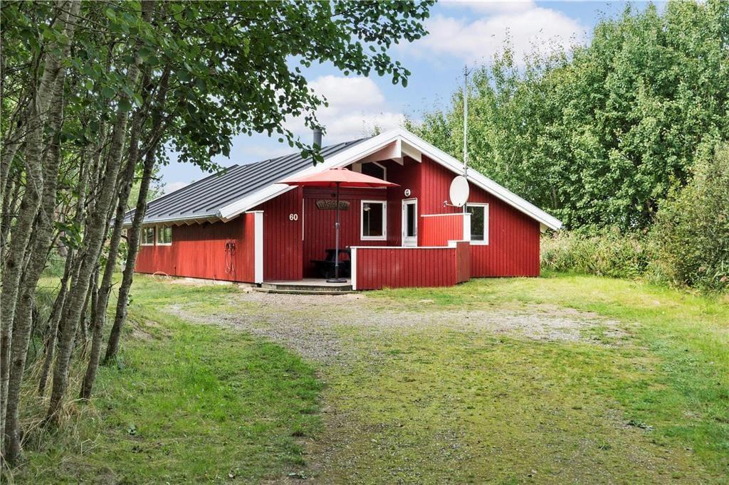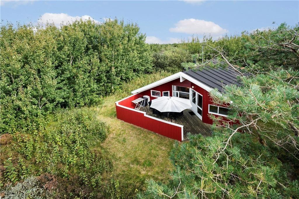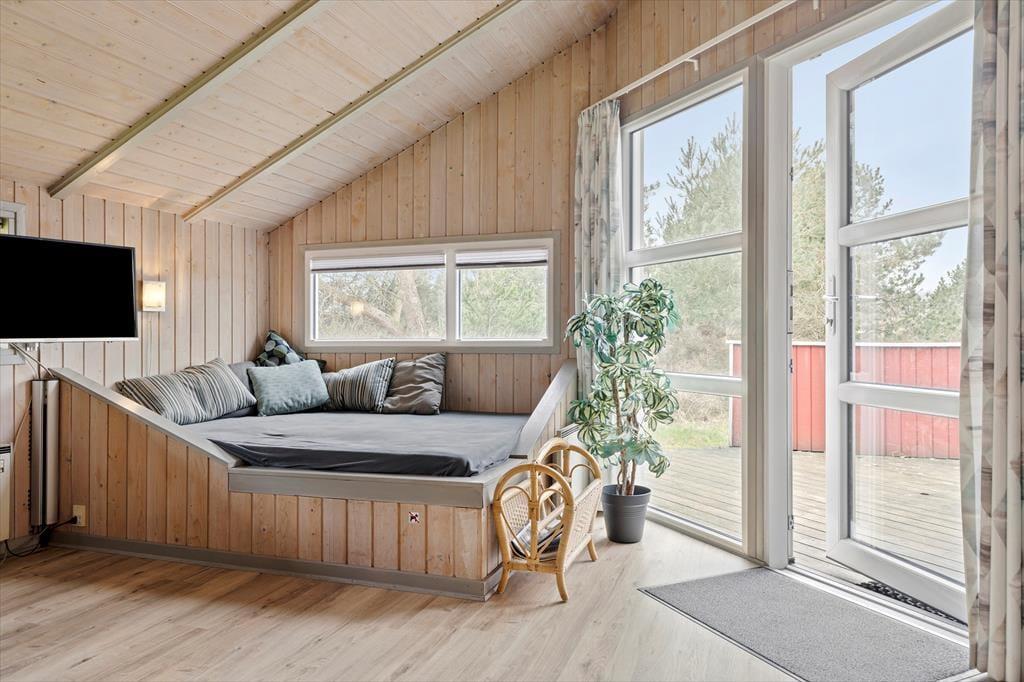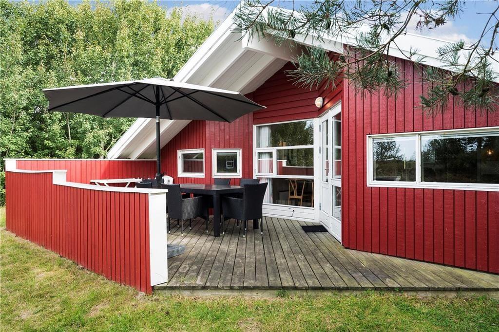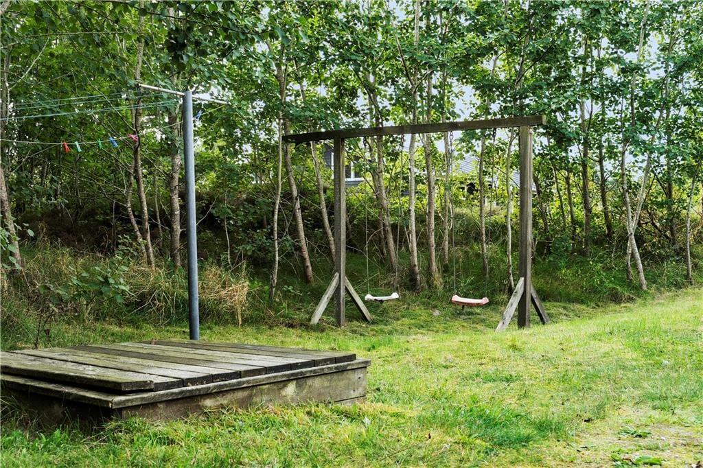 Wenn das Wetter es zulässt, dass du es dir im Freien gemütlich machen kannst, kannst du dich zwischen einer Ost- und einer Westterrasse entscheiden, und auf der Rasenfläche am Ferienhaus gibt es eine Schaukel und einen Sandkasten. Beide Terrassen sind überdacht, und auf beiden kannst du den idyllischen Frieden des Naturgrundstücks spüren – möchtest du jedoch gleichzeitig die Aussicht genießen, dann solltest du die nach Westen ausgerichtete Terrasse wählen.
