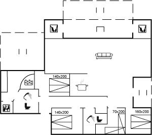 Die Schlafplätze verteilen sich auf 4 Schlafräume. 6 Schlafplätze in Doppelbetten.1 Schlafplatz in einem Einzelbett.1 Schlafplatz in einem Etagenbett. Ferner steht ein Kinderbett zur Verfügung.
