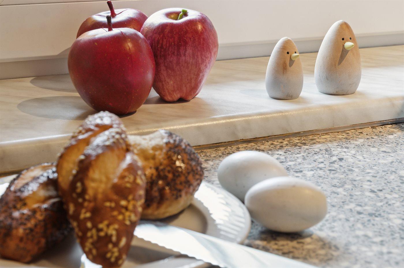 Die Küche ist mit Kühlschrank ausgestattet. Außerdem gibt es 4 elektrische Kochplatten, Umluftofen, Mikrowelle sowie Geschirrspüler.