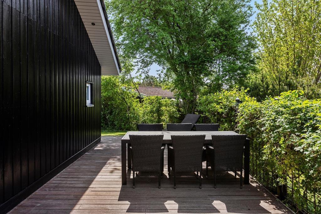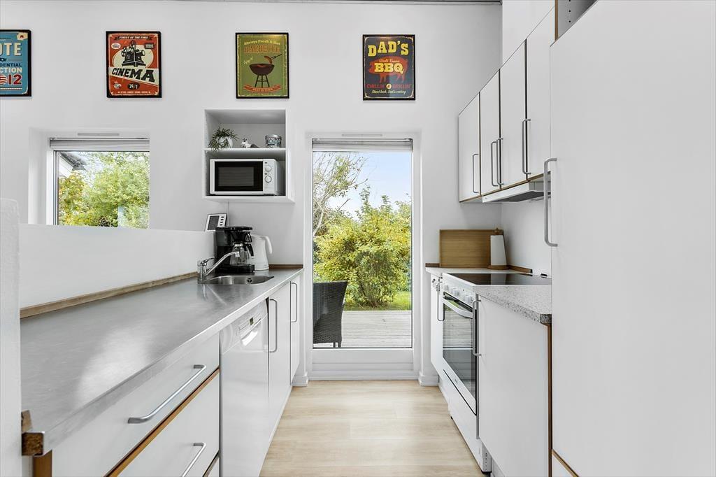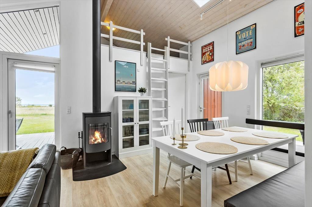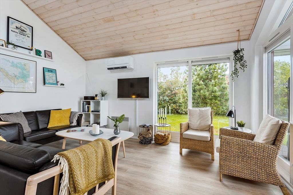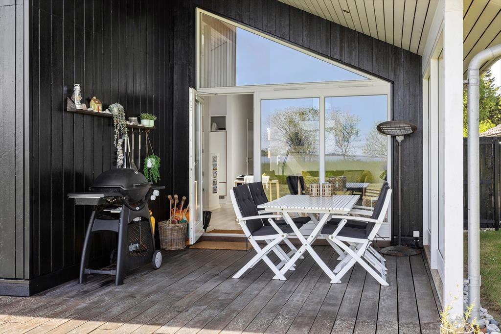 Vom Wohnzimmer aus hast du direkten Zugang zu einer gemütlichen, teilweise überdachten Terrasse, von der aus du einen Panoramablick auf den Rasen und das Meer genießen kannst. Hier kannst du morgens mit einer Tasse Kaffee sitzen, abends leckere Mahlzeiten grillen und den Blick über die schöne Landschaft schweifen lassen. Der Garten ist eine grüne Oase, die reichlich Platz für Outdoor-Aktivitäten und Spiel für Groß und Klein bietet. Wenn das Wetter gut ist, kannst du die kurze Strecke von 50 Metern zum Badestrand gehen, den Sand zwischen deinen Zehen spüren, im klaren Wasser baden oder einfach die Sonnenstrahlen genießen.