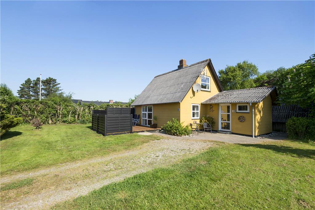 Hübsch erstrahlt das Haus mit gelber Fassade und weißen Fensterrahmen inmitten des grünen Grundstücks. Im Hausinneren erwartet Sie eine 72 m² umfassende Wohnfläche, die sich auf zwei Stockwerke verteilt. Die helle Holzverkleidung, die markanten Deckenbalken und der Kaminofen sind einige der Dinge, die dem Wohnbereich im Erdgeschoss seine angenehme Wohnatmosphäre verleihen. Dieser setzt sich aus dem Wohnzimmer und der offen angrenzenden Küche zusammen. Im Eingangsbereich steht Ihnen eine Waschmaschine zur Verfügung. Das Erdgeschoss beherbergt darüber hinaus auch ein Badezimmer und einen Schlafraum mit zwei Einzelbetten. Im oberen Stockwerk gibt es zwei weitere Schlafzimmer, eine mit zwei Einzelbetten und eines mit einem Dobbelbett.