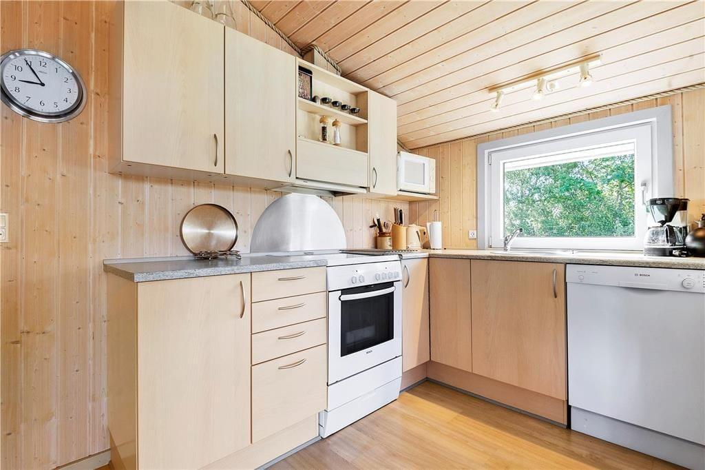 Die einladende Wohnatmosphäre bezieht sich nicht nur auf den offenen Aufenthaltsbereich, sondern auch auf die zwei Schlafräume und das Badezimmer. Letzteres verspricht mit seiner integrierten Sauna entspannte Stunden, die Sie beispielsweise nach einem erfrischenden Herbstspaziergang so richtig genießen können. Mit heimeliger Wärme und Gemütlichkeit lockt auch der Wohnraum, in dem der Kaminofen für echte dänische Ferienhausstimmung sorgt. Gemütliche Abende können in der Sofaecke oder auch bei der gemeinsamen Zubereitung der Mahlzeiten in der offenen Küche sehr schön verbracht werden. Zu den praktischen Details zählen die Waschmaschine und der Geschirrspüler. Für die jüngsten Urlaubsgäste stehen ein Kinderbett und ein Hochstuhl bereit.