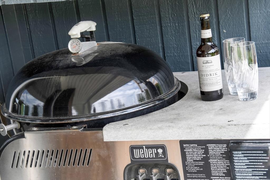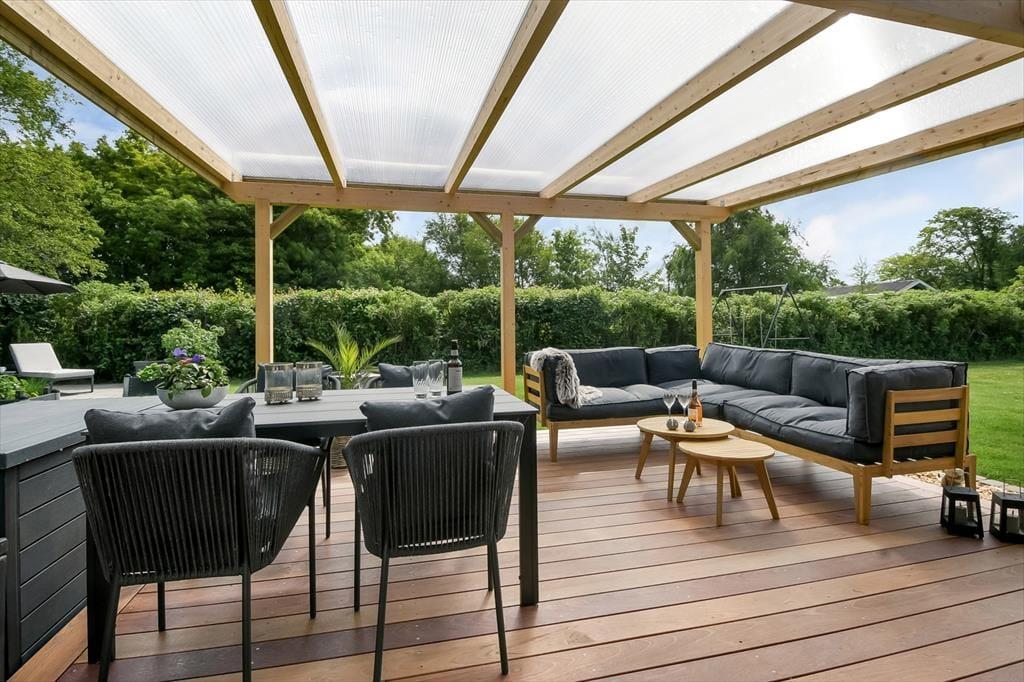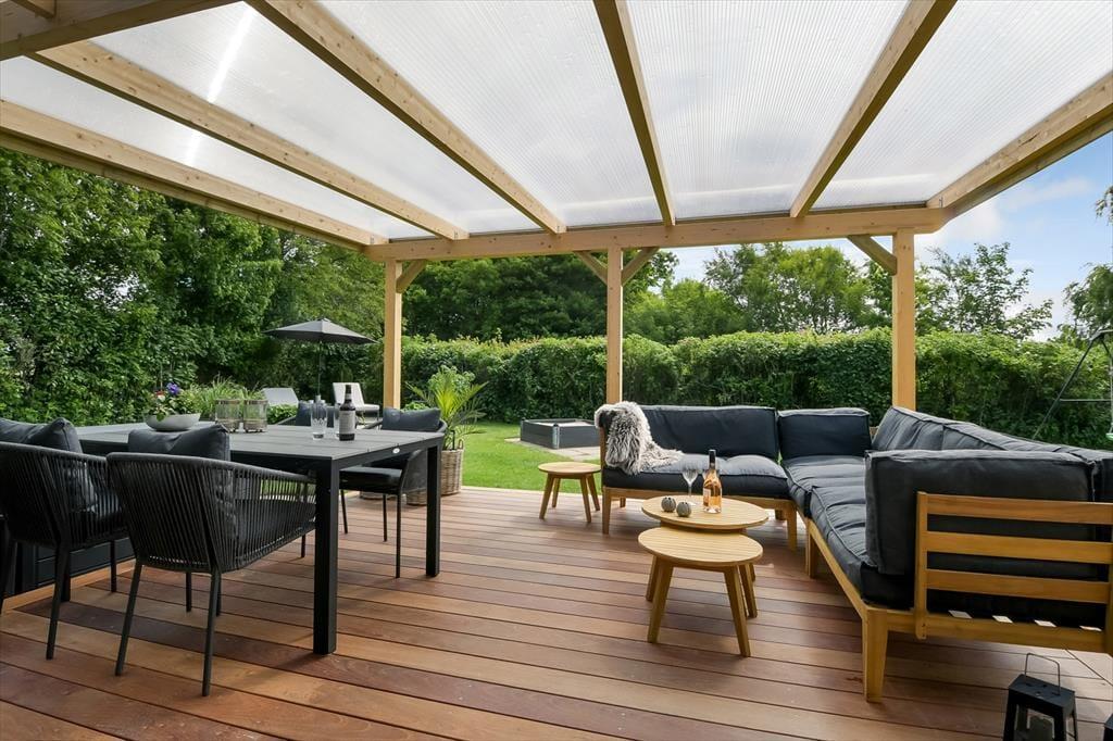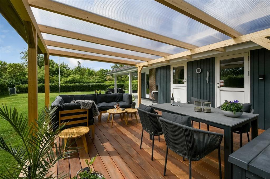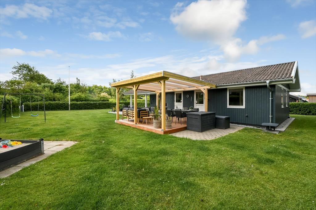 An die südliche und östliche Seite des Hauses schmiegt sich eine schöne, teilweise überdachte Holzterrasse an. Liegestühle, Gartenmöbel und ein Grill laden zu herrlichen Stunden in der Sonne und zu gemütlichen Abenden mit gutem Essen im Freien ein. Während Sie sich auf der Terrasse erholen und entspannen, können Ihre Kinder vergnügt auf der Rasenfläche des geschlossenen Grundstücks umhertollen und spielen. Für die kleinsten Urlauber stehen zudem eine Schaukel und eine Sandkiste bereit.