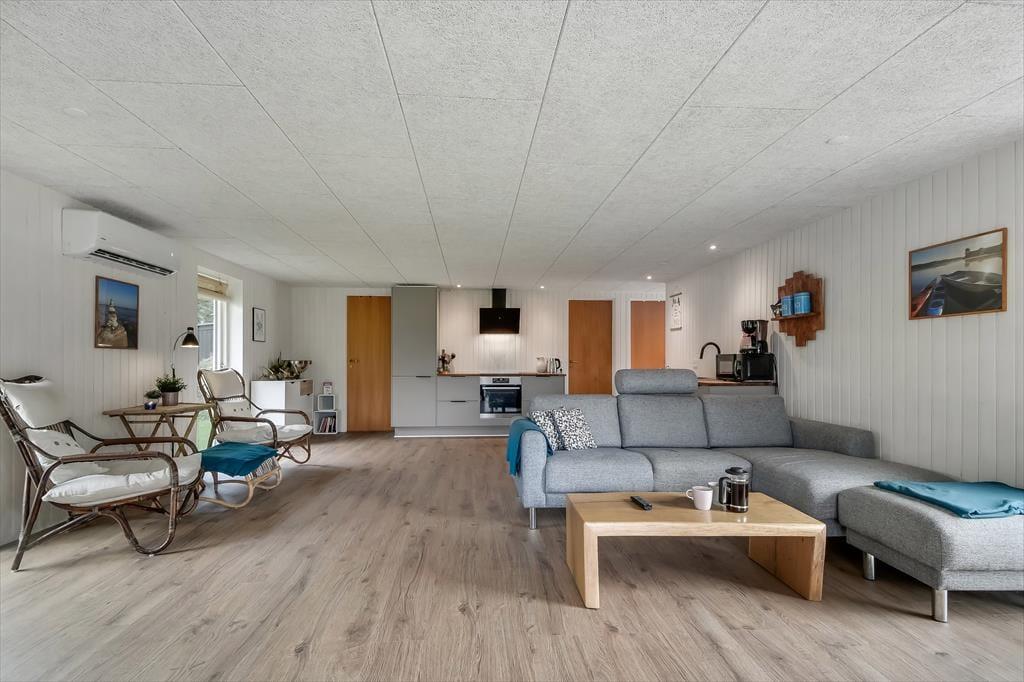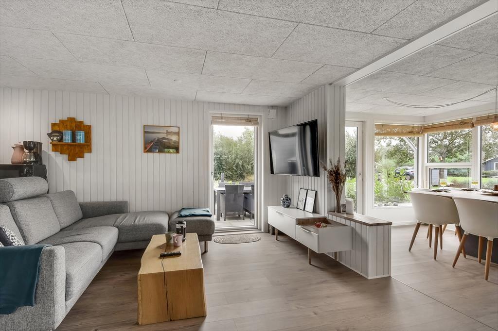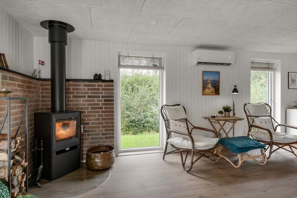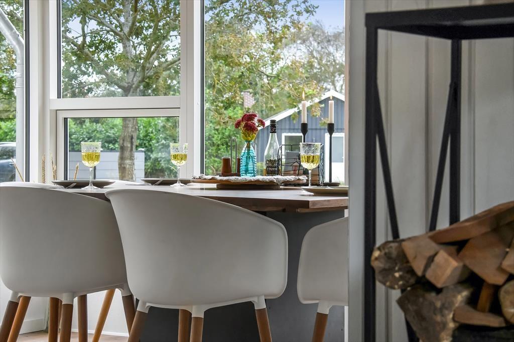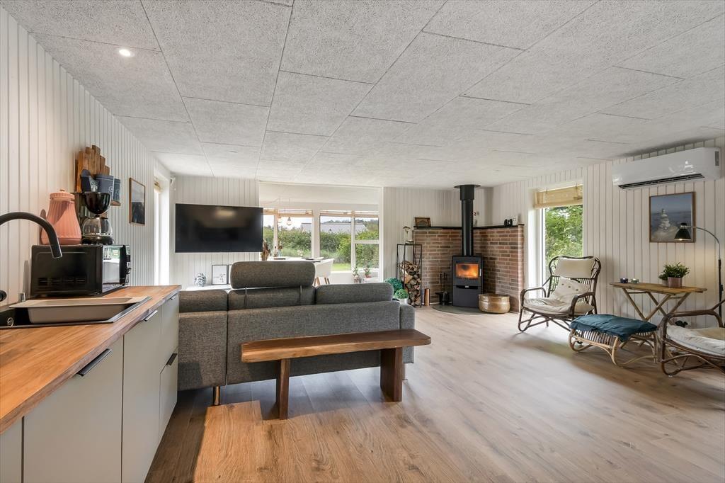 Das Ferienhaus wurde im Jahr 2022 komplett renoviert, wobei an keinem Detail gespart wurde, sodass das Haus der perfekte Ort ist, um schöne Urlaubserinnerungen zu schaffen. Im großen Wohnzimmer in der Mitte des Hauses befindet sich eine helle und offene Küche, die in offener Verbindung zum Wohnzimmer steht. Hier gibt es sowohl Sessel als auch ein großes Sofa und der Holzofen sorgt für die perfekte Atmosphäre, wenn es draußen dunkel und kalt wird. Ein Stück weiter finden Sie den Essbereich, in dem auch Platz für eine gemütliche Ecke mit einem schönen Sessel und einem Tagesbett geschaffen wurde, perfekt, wenn Sie ein gutes Buch lesen oder ein Mittagsschläfchen machen möchten. Vom Essbereich aus haben Sie einen wunderbaren Blick auf den Vorgarten, können aber trotzdem ungestört die Mahlzeit genießen. Darüber hinaus verfügt das Haus über ein geräumiges Badezimmer mit Dusche und Waschmaschine sowie drei Schlafzimmer mit Platz für insgesamt 5 Personen. Ein funktionales und wunderschönes Haus mit viel Seele.