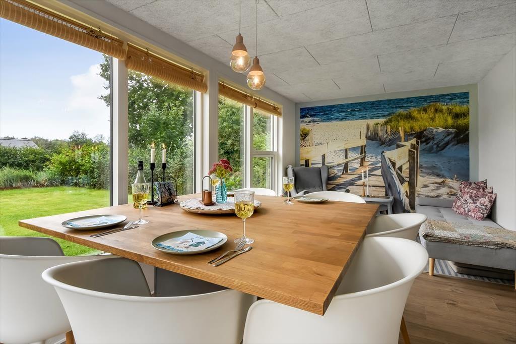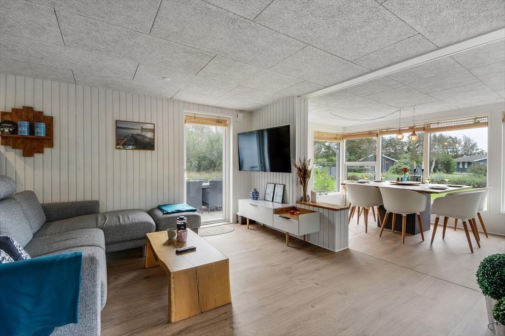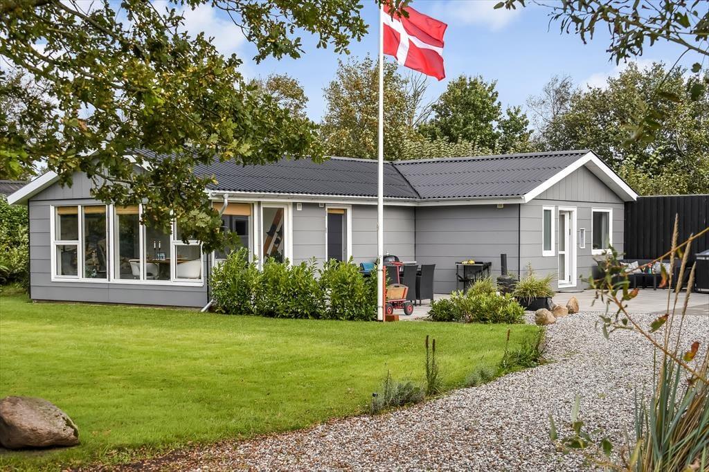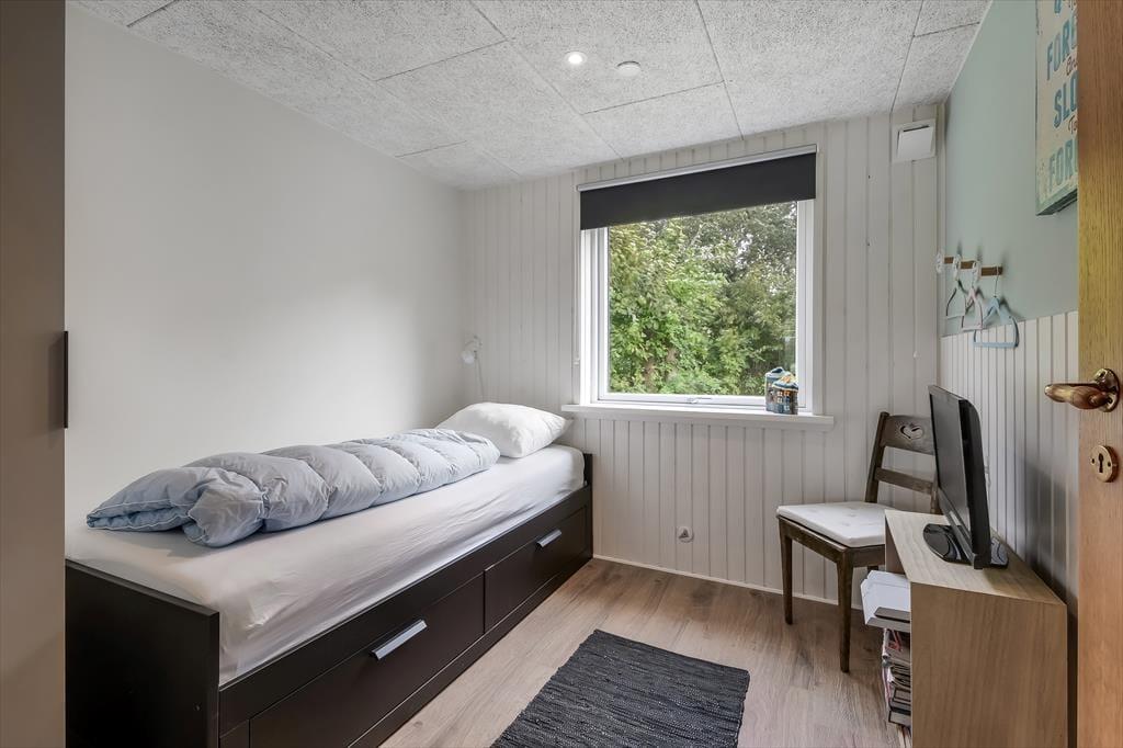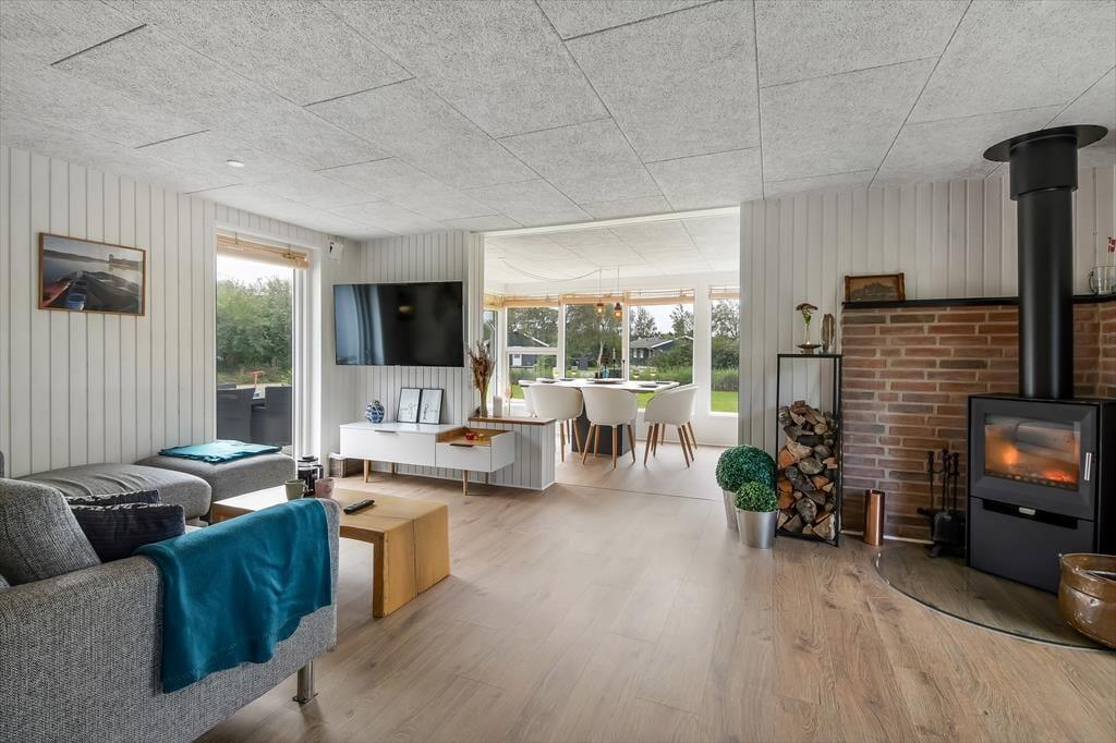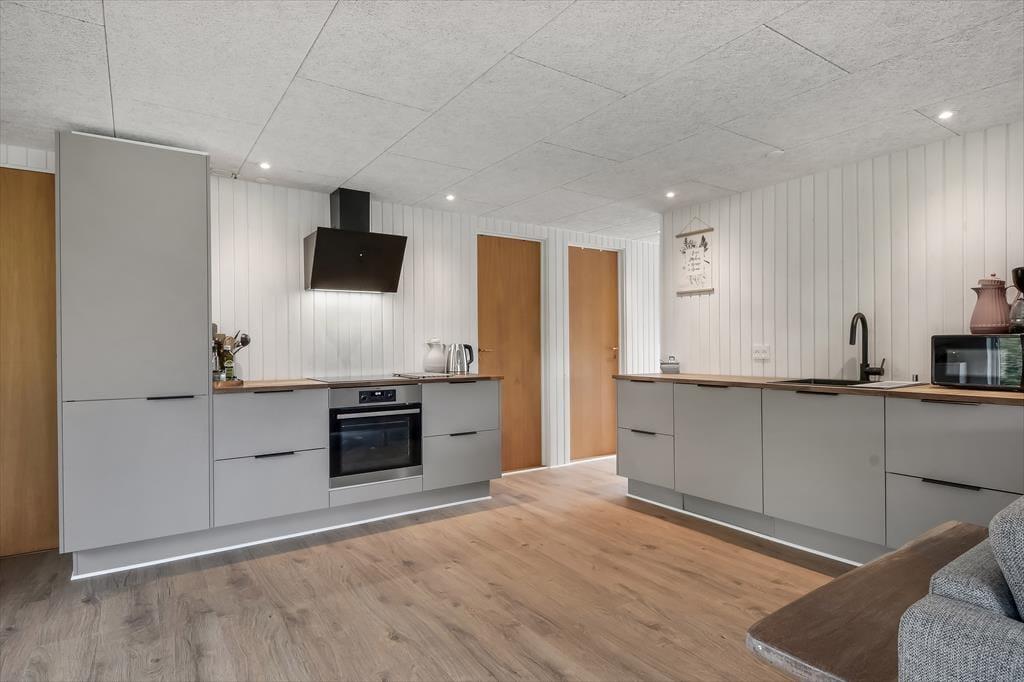 Das Ferienhaus wurde im Jahr 2022 komplett renoviert, wobei an keinem Detail gespart wurde, sodass das Haus der perfekte Ort ist, um schöne Urlaubserinnerungen zu schaffen. Im großen Wohnzimmer in der Mitte des Hauses befindet sich eine helle und offene Küche, die in offener Verbindung zum Wohnzimmer steht. Hier gibt es sowohl Sessel als auch ein großes Sofa und der Holzofen sorgt für die perfekte Atmosphäre, wenn es draußen dunkel und kalt wird. Ein Stück weiter finden Sie den Essbereich, in dem auch Platz für eine gemütliche Ecke mit einem schönen Sessel und einem Tagesbett geschaffen wurde, perfekt, wenn Sie ein gutes Buch lesen oder ein Mittagsschläfchen machen möchten. Vom Essbereich aus haben Sie einen wunderbaren Blick auf den Vorgarten, können aber trotzdem ungestört die Mahlzeit genießen. Darüber hinaus verfügt das Haus über ein geräumiges Badezimmer mit Dusche und Waschmaschine sowie drei Schlafzimmer mit Platz für insgesamt 5 Personen. Ein funktionales und wunderschönes Haus mit viel Seele.