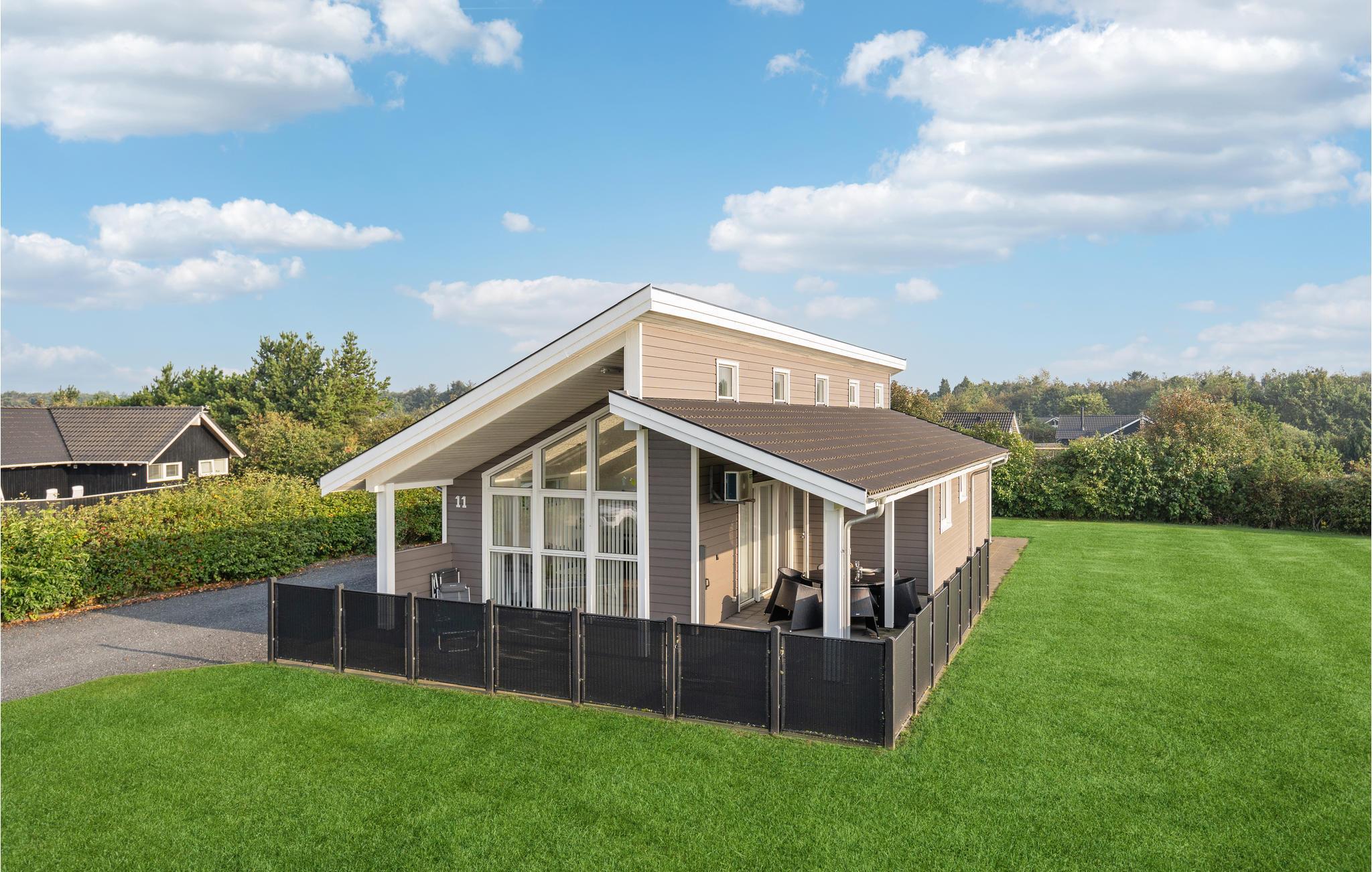 Modernes, energiesparendes Holzferienhaus mit Whirlpool, Pelletofen und großer Terrasse in Bork Havn, Dänemark.