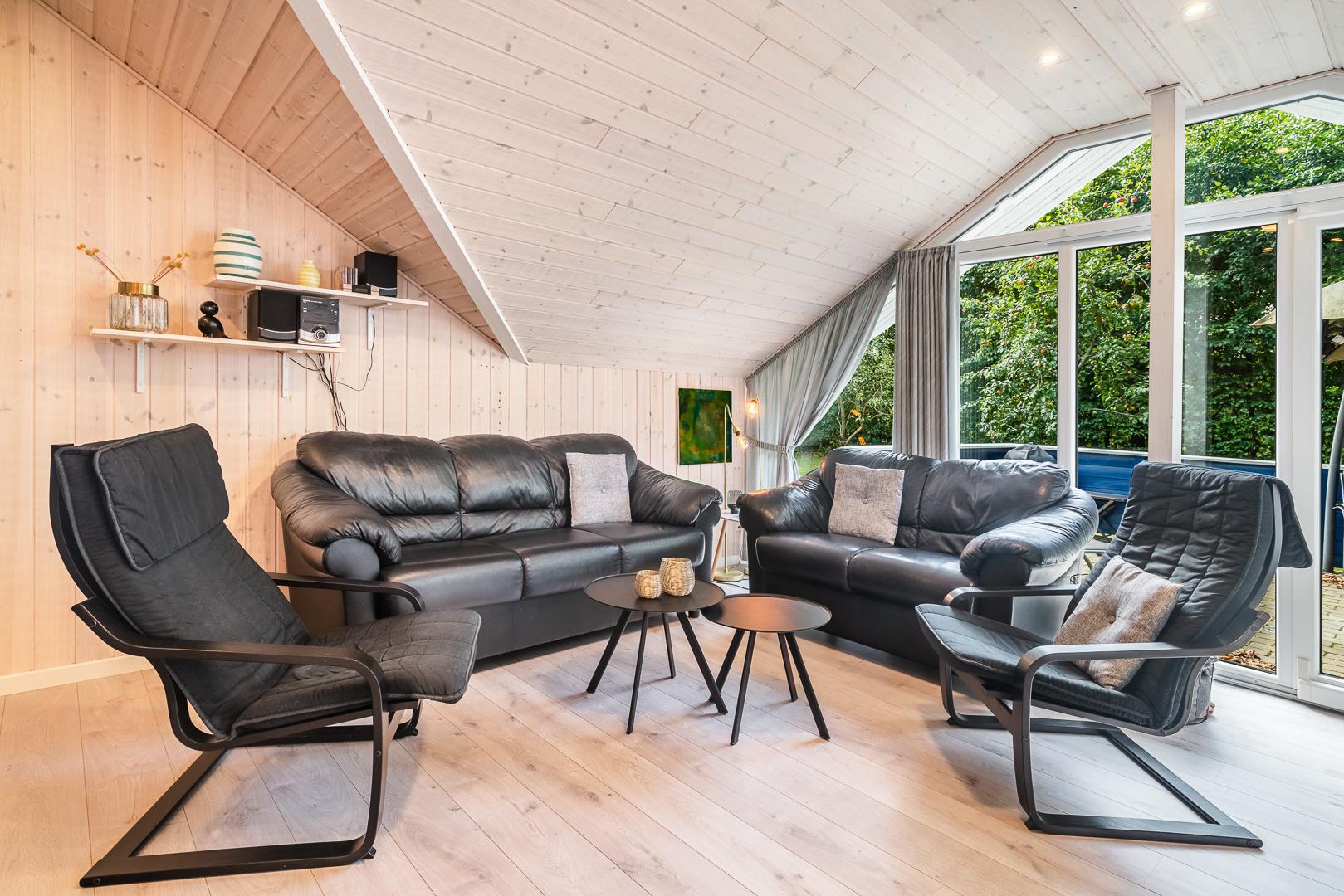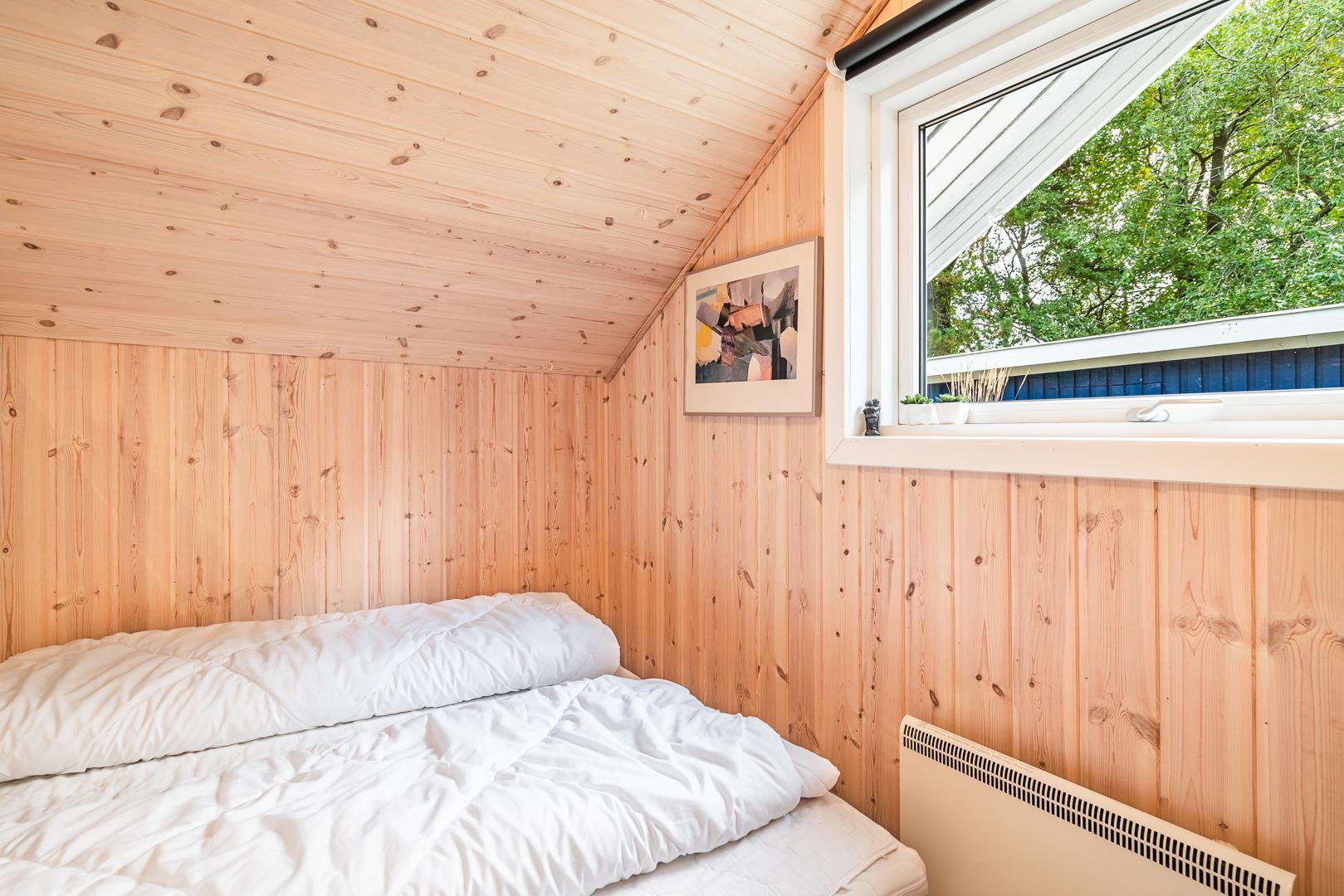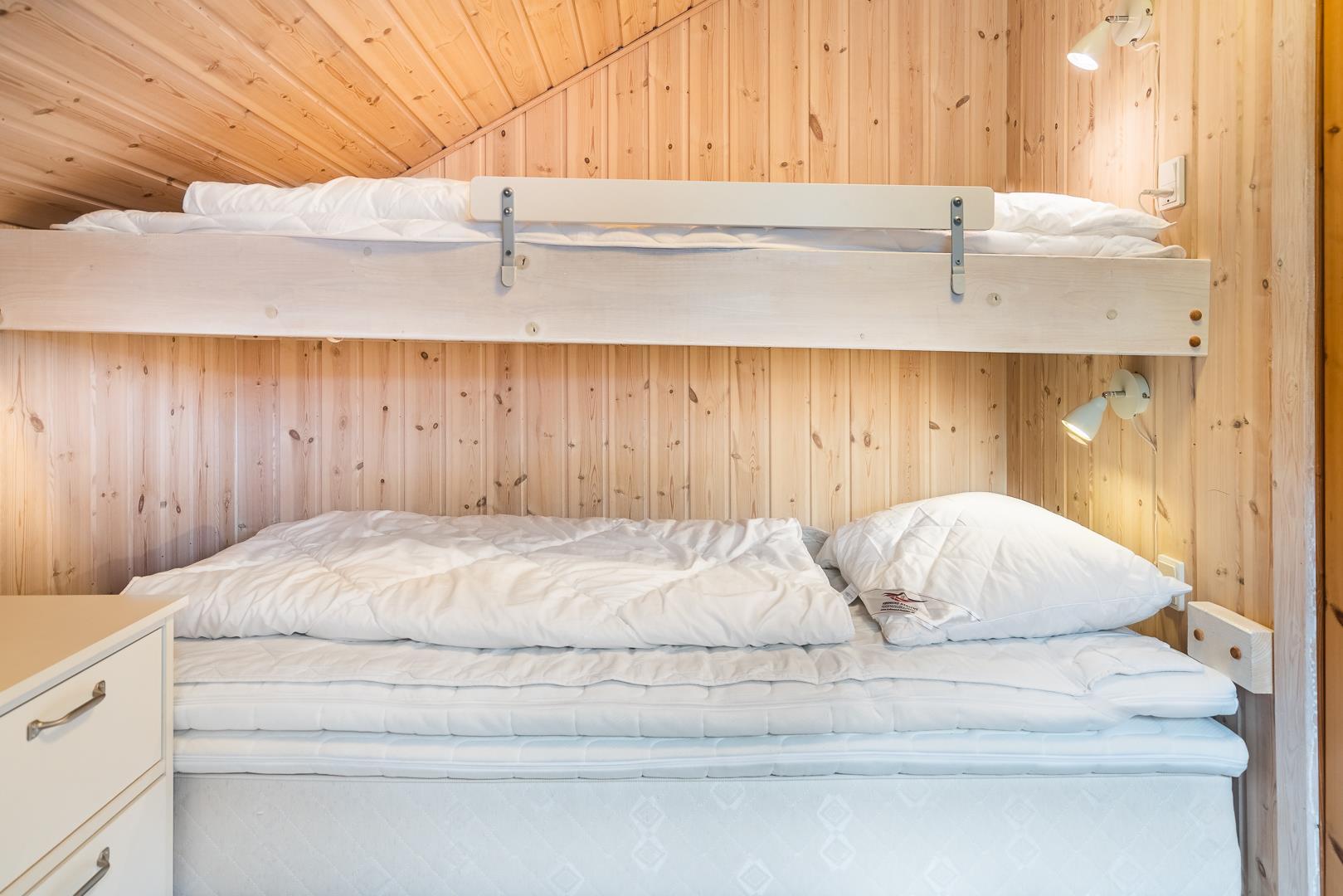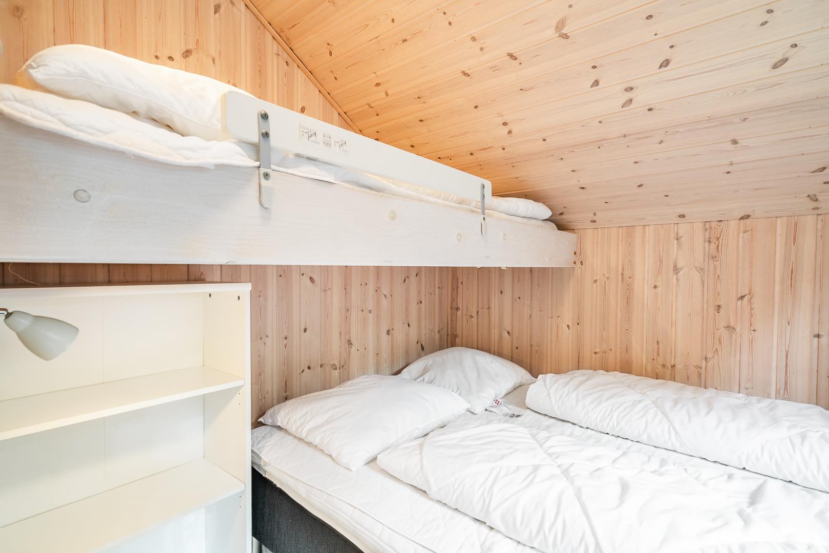 Das Ferienhaus verfügt über drei Schlafzimmer, zwei mit Doppelbett und eines mit Etagenbett – optimal aufgeteilt für Familien mit Kindern. Dank der hellen Holzverkleidung und der geschmackvollen Einrichtung entsteht ein freundliches, skandinavisches Ambiente, in dem man sich sofort wohlfühlt.
